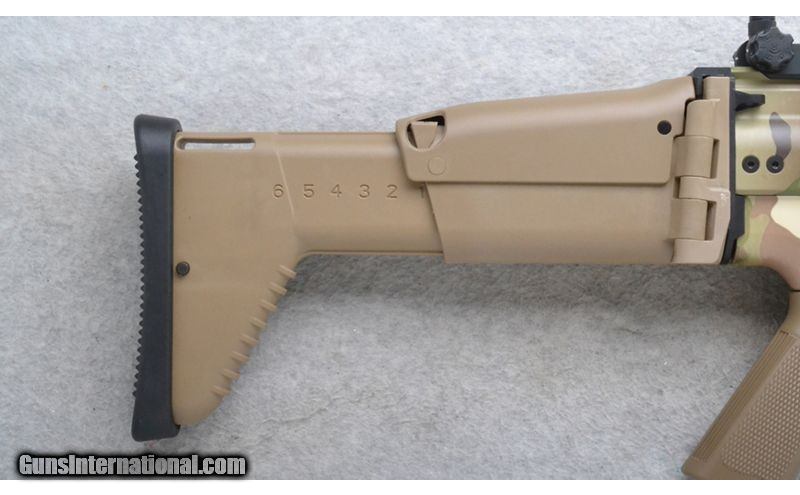Description: This FN Model Scar 16S is a semi-automatic rifle in 5.56x54mm Cal. It has a 16.25 inch cold hammer forged Mil-Spec. barrel with chrome lined bore and chamber plus a muzzle device. A 1/7 twist. It has folding adjustable front and rear sights. The butt stock is right hinged folding, 6 position LOP adjustable and has an rising comb. It has accessory rails on all four sides. It has a Multicam pattern. 5.56x45mm NATO SOLD Chambers: 30 round Magazine. Metal Condition: Excellent. Bore Condition: Excellent. Barrels: 16.25 inch free floating cold hammer forged Mil-Spec. barrel with chrome lined bore and chamber plus a muzzle device. 1/7 twist. Stock Dimensions: Folding and adjustable. Adjustable comb. Fore End: Metal alloy with four side accessory rails. Side vented. Butt Pad: Textured black rubber. Weight: 7 Lb. 6 Oz. Sights: Folding adjustable front and rear. Item Location: Richfield, WI |