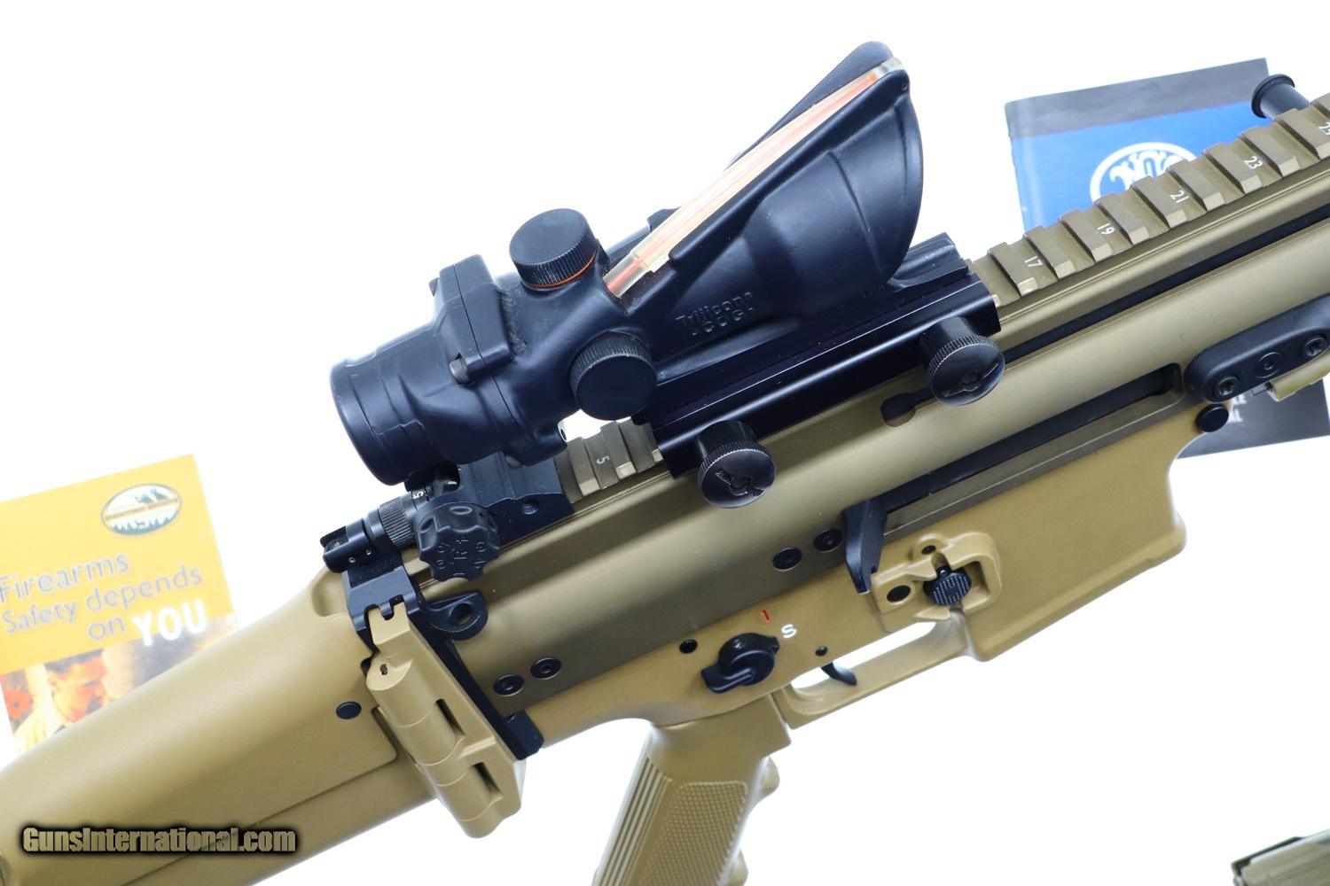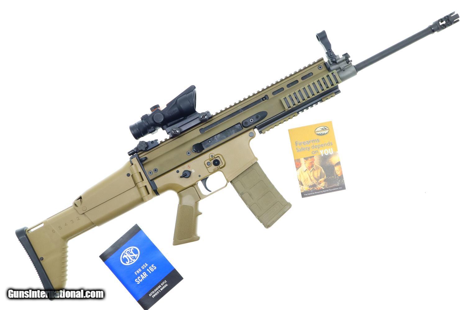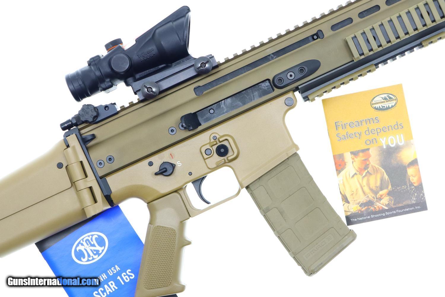 This popular SCAR 16S self loading rifle, in flat dark earth, has its barrel terminated with the standard FN muzzle brake. Folding protected post front sight and folding adjustable rear peep sight. Fitted with a Trijicon 4x32 ACOG mounted to the factory 16" regulated rail. Ambidextrous safety/selector. Left side charging handle. Ejection port buffer and 6 position collapsible right-side folding shoulder stock. Picatinny rail segments for accessory mounting. Left & right side integral sling mount points. Left side receiver marked 'FN HERSTAL BELGIUM' 'SCAR 16S cal. 5.56X45' and the factory bar code. Complete with tan Magpul 30 round magazine and factory paperwork.
