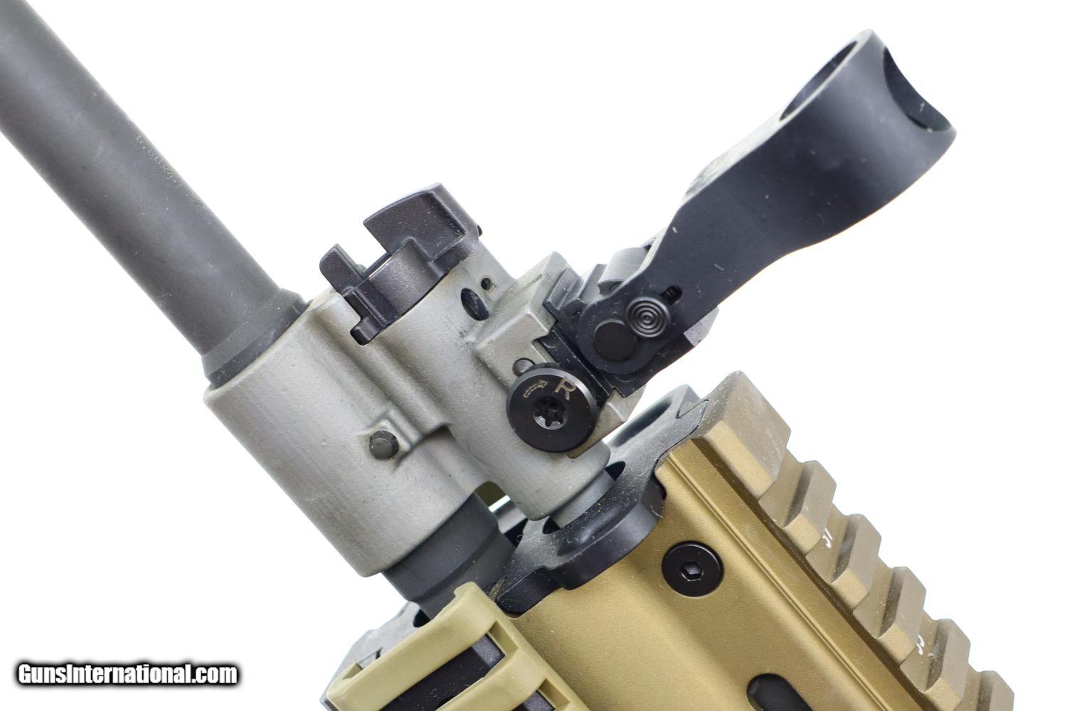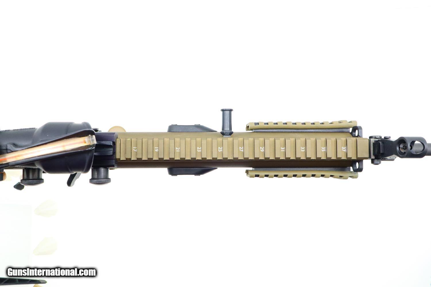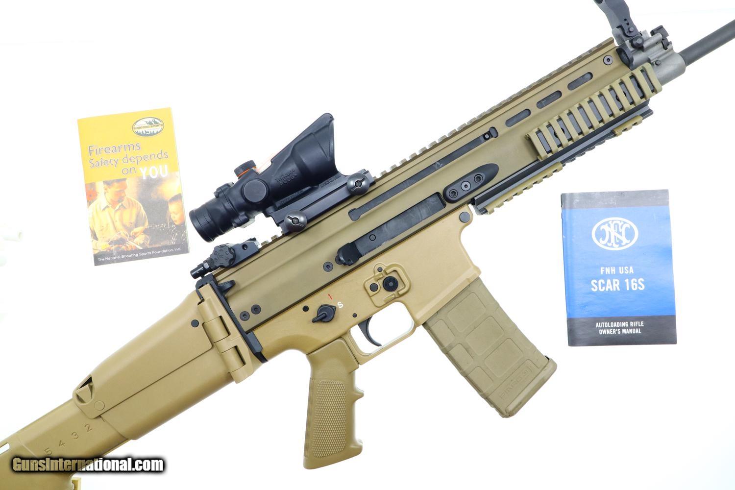 This popular SCAR 16S self loading rifle, in flat dark earth, has its barrel terminated with the standard FN muzzle brake. Folding protected post front sight and folding adjustable rear peep sight. Fitted with a Trijicon 4x32 ACOG mounted to the factory 16" regulated rail. Ambidextrous safety/selector. Left side charging handle. Ejection port buffer and 6 position collapsible right-side folding shoulder stock. Picatinny rail segments for accessory mounting. Left & right side integral sling mount points. Left side receiver marked 'FN HERSTAL BELGIUM' 'SCAR 16S cal. 5.56X45' and the factory bar code. Complete with tan Magpul 30 round magazine and factory paperwork.