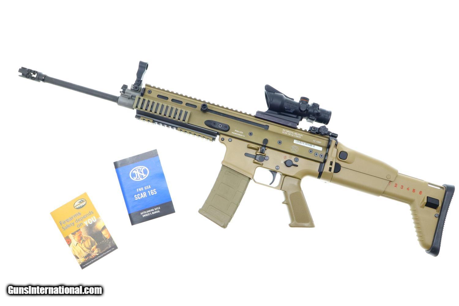 Description: Synopsis: Wonderful and instantly recognizable FN Scar 16S in FDE with Trijicon 4x32 ACOG scope. Description: This popular SCAR 16S self loading rifle, in flat dark earth, has its barrel terminated with the standard FN muzzle brake. Folding protected post front sight and folding adjustable rear peep sight. Fitted with a Trijicon 4x32 ACOG mounted to the factory 16" regulated rail. Ambidextrous safety/selector. Left side charging handle. Ejection port buffer and 6 position collapsible right-side folding shoulder stock. Picatinny rail segments for accessory mounting. Left & right side integral sling mount points. Left side receiver marked 'FN HERSTAL BELGIUM' 'SCAR 16S cal. 5.56X45' and the factory bar code. Complete with tan Magpul 30 round magazine and factory paperwork. Condition: Excellent original condition with with little signs of use. Stock locks tightly in all positions. Crystal clear optics. Mirror bore with strong rifling. Perfect manual mechanics. SOLD Manufacturer: FN Model: Scar Serial Number: LC12007 Caliber Info: 5.56mm Condition: EXE |