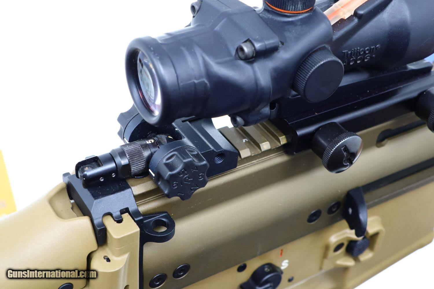 Wonderful and instantly recognizable FN Scar 16S in FDE with Trijicon 4x32 ACOG scope.
