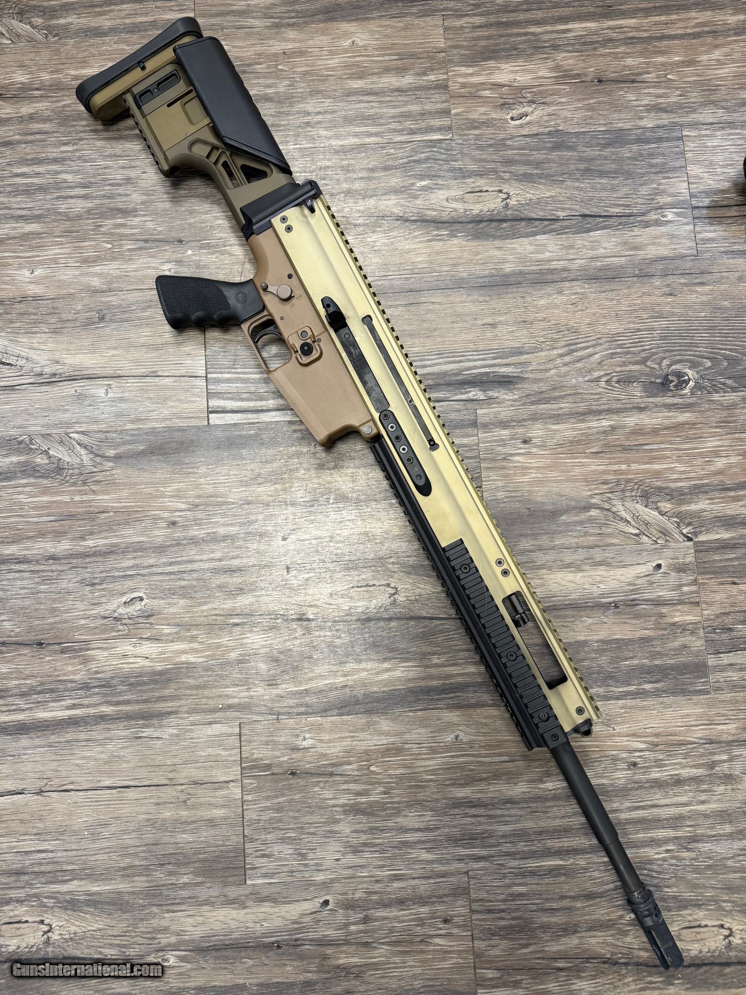 Features: Caliber: .308 Winchester Semi-automatic precision rifle Flat Dark Earth (FDE) finish Geissele two-stage match trigger (factory) Free-floating cold hammer-forged barrel Full-length top rail for optics Factory box included One magazine included Very good condition