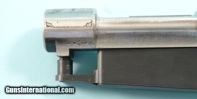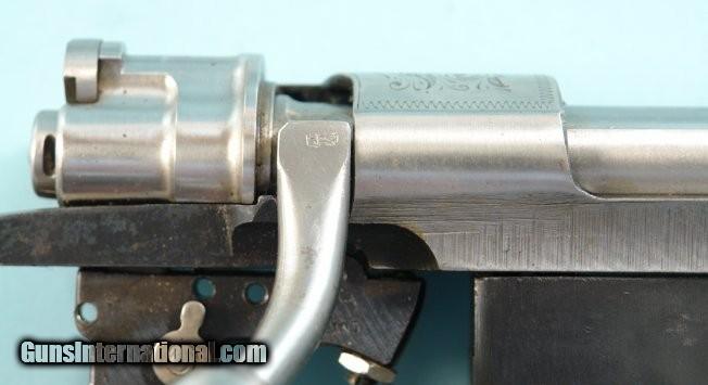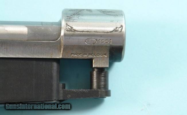 Description: MADE IN BELGIUM COMMERCIAL FN MAUSER 98 ENGRAVED RIFLE ACTION CIRCA 1951. Serial numbered behind lug with four digit s/n (below four dots) along with other Belgian Liege proofs along "ML". Engraved with stags head receiver in the white except below wood line where old bluing appears. Engraving project that never got assembled into rifle as owner/gunsmith passed away. Observe "1951" next to FN in oval on right side of receiver. Barrel threads crisp and ready for new rifle barrel. Blue steel triggerguard slightly engraved as well. Hinged floorplate housing follower and spring nicely blued. In the white bolt with matching belgian proofs "L" and "circled/ 2" is matching to receiver with tight lockup and correct matching knurled bolt knob. "Finland" stamped adjustable trigger installed and works crisply. Ready to be finished long action by the one and only FN. SOLD Curio/Relic: Yes |