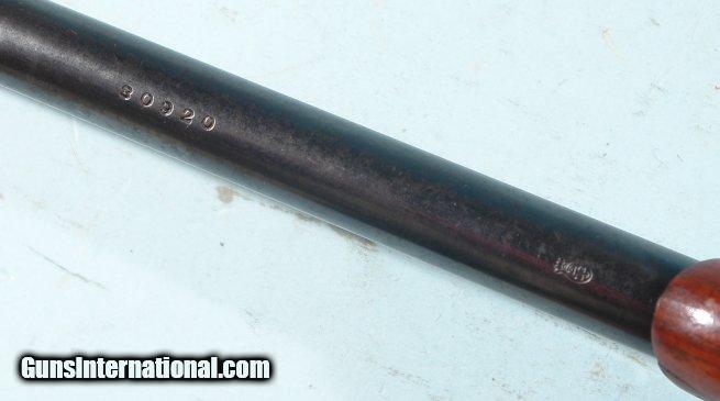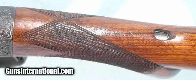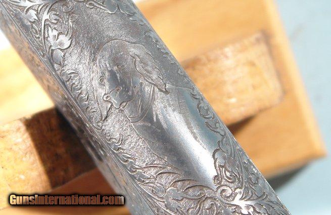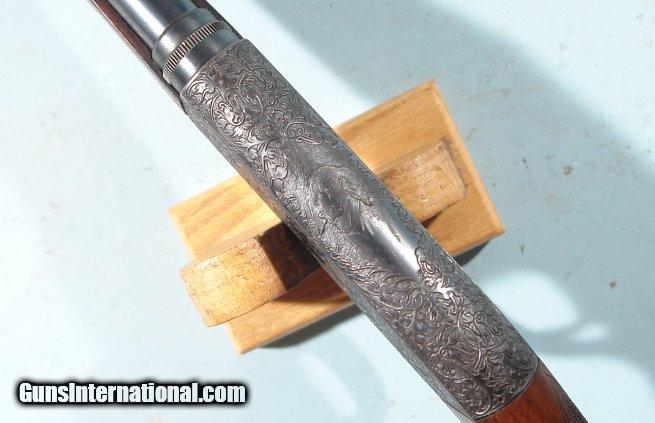 Description: RARE EXHIBITION GRADE FACTORY ENGRAVED EARLY FN BROWNING PATENT 22 LR SEMI-AUTO CARBINE CIRCA 1922. Almost identically engraved to the one illustrated in the 1924 Fabrique Nationale catalog. Listed as the “CARBINE AUTOMATIQUE BROWNING CAL. 22”. Beautifully semi-relief engraved with scroll, vine and “Setter & Bird” scenes on the frame side panels and a beautiful head and chest portrait of a “Setter” on the top panel. Checkered high grade walnut stock and forend with the original finish. Blued metal with all the original finish with some very slight storage patina. Excellent bore and in working order. Very scarce with this high grade early FN Factory engraving possibly done by the early FN Master Hyppolite Corombelle. SOLD Curio/Relic: Yes |