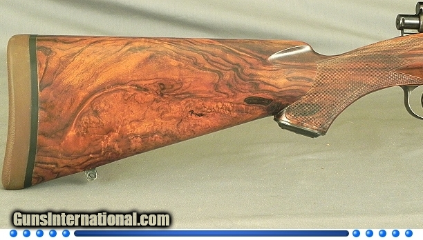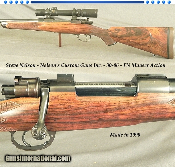 Description: #5294, Steve Nelson Gunmaker - Nelson's Custom Guns, Inc.: A Complete Steve Nelson Custom 30-06 on a FN Mauser Action, Made in 1990, 24" barrel, No open sights, Barrel band sling eye, Warne scope bases, Detachable rings but not quick detachable, Burris 1 1/2 - 6 scope, Bolt sleeve safety on the left side of the scope, Nice trigger, Blackburn straddle hinged floorplate with a center bow release; Full custom bolt handle with 3 panel checkering, Checkered bolt stop release, Jeweled bolt body, Heat blued extractor body; The action is detailed with excellent polish & finish inside & out, All metal rust blued, A true Nelson classic stock using a very nice piece of English walnut with nice color & contrast, Shadowline cheekpiece, Full wrap around point pattern checkering with a mullered border, Steel grip cap, Ebony forend tip, 8 lbs. 9 oz., 14" LOP over a 1" pad, The original rust blue overall remains at 99%, The original stock finish is at 96%, The checkering remains at 100%, The bore is excellent plus. The piece will shoot 1" 3 shot groups at 100 yards. This is a very nice American Classic bolt rifle by a maker that has served our trade well. //////////////////////////////////////// Mr. Steve Nelson has a shop in Corvallis, Oregon where he does serious custom rifles, shotguns and restores antique sporting firearms. He is a member of American Custom Gunmakers Guild and for over 13 years he wrote and edited their newsletter. He is a gentleman of the first rank and can be contacted at nelsons-customcomcast SOLD |