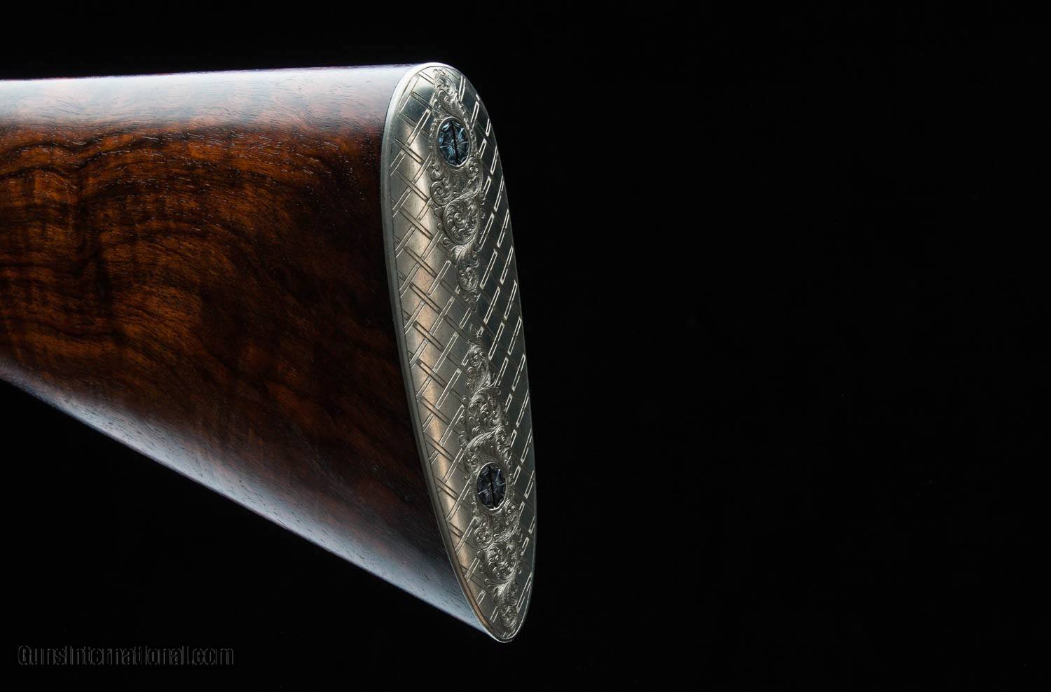 Description: Aug. Francotte .270 Win. Bolt Action Built on an FN commercial standard length Mauser action with an extended top strap and traditional Mauser wing safety. The rifle has a traditional Mauser hinged floor plate with a trigger tang extending to the trap grip cap. Bottom metal has a bright “coined” finish and is engraved in a scroll pattern with a gold inlaid head of a whitetail deer and a gold horseshoe on the door of the grip cap. Imported by Atlanta Outfitters, GA US Agent” and marked on the 23” barrel. Numbered “2” in gold on top of the quarter rib, the rifle is not drilled and tapped for scope mounts and fitted with only a quarter rib with one standing/two folding leaf sights and a WR type rearward folding sight hood with thin blade and single brass bead. Nicely figured walnut stock has a wrap point pattern checkering with an ebony forend tip and no provisions for a sling swivel. The steel butt plate is finished and engraved to match bottom metal. Rifle remains in as new condition. Price: $12,000.00 Contact Seller |