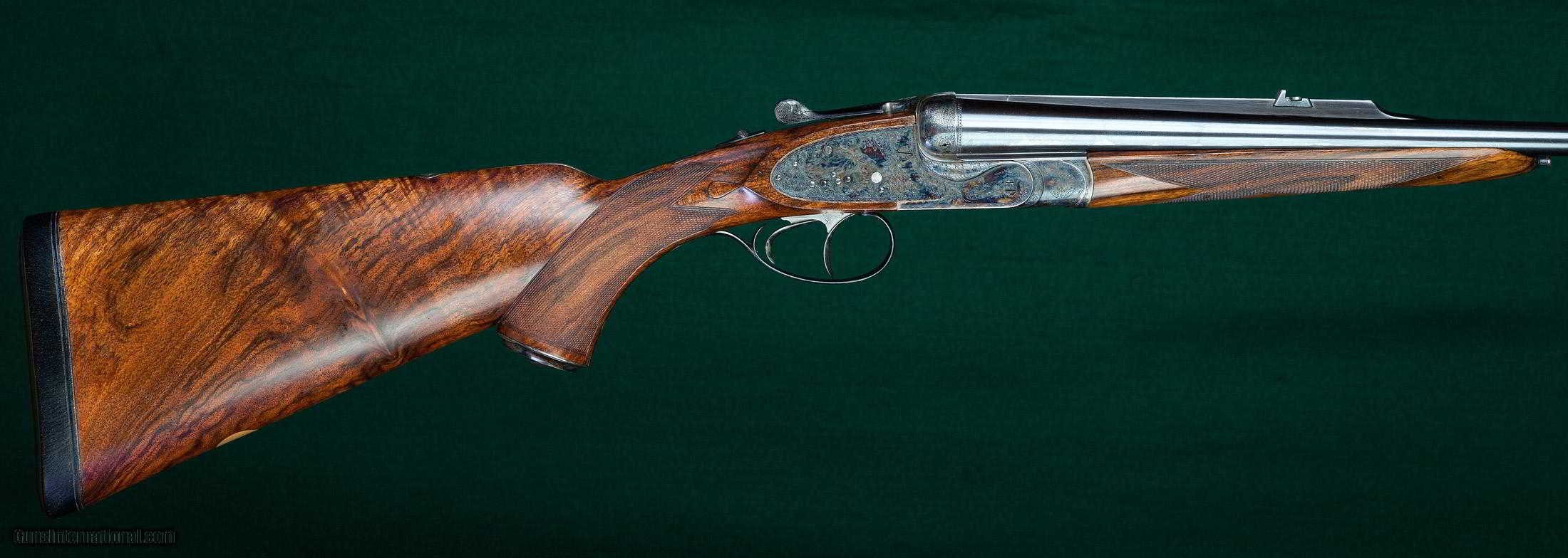 Description: 25" SxS chopper-lump barrels with ramp front sight, smooth swamped rib, hand-filed quarter rib, 1 standing and 1 folding express sight. 14 3/8"pull from casehardened articulated front trigger to leather covered pad. Highly figured walnut stock with Anson pushbutton release splinter forend, beaded pancake cheekpiece, classic point-pattern checkering, teardrops, vacant gold oval and engraved steel trapdoor PG cap. Fine scroll and game-scene engraving by R Smeets on casehardened Holland & Holland-style bolstered action with gold-line cocking indicators, intercepting sears, concealed third fastener, bushed firing pins, manual top tang safety with S inlaid in gold, bottom tang extending to grip cap and top tang extending over comb. Weight: 8lbs, 12oz. Built in 1957 of pre-war quality. New condition, retaining 99%++blue and 99%+ vivid casehardening colors. With Brady-type leather-trimmed canvas trunk case, snap caps and oil bottle. SOLD Curio/Relic: Yes |