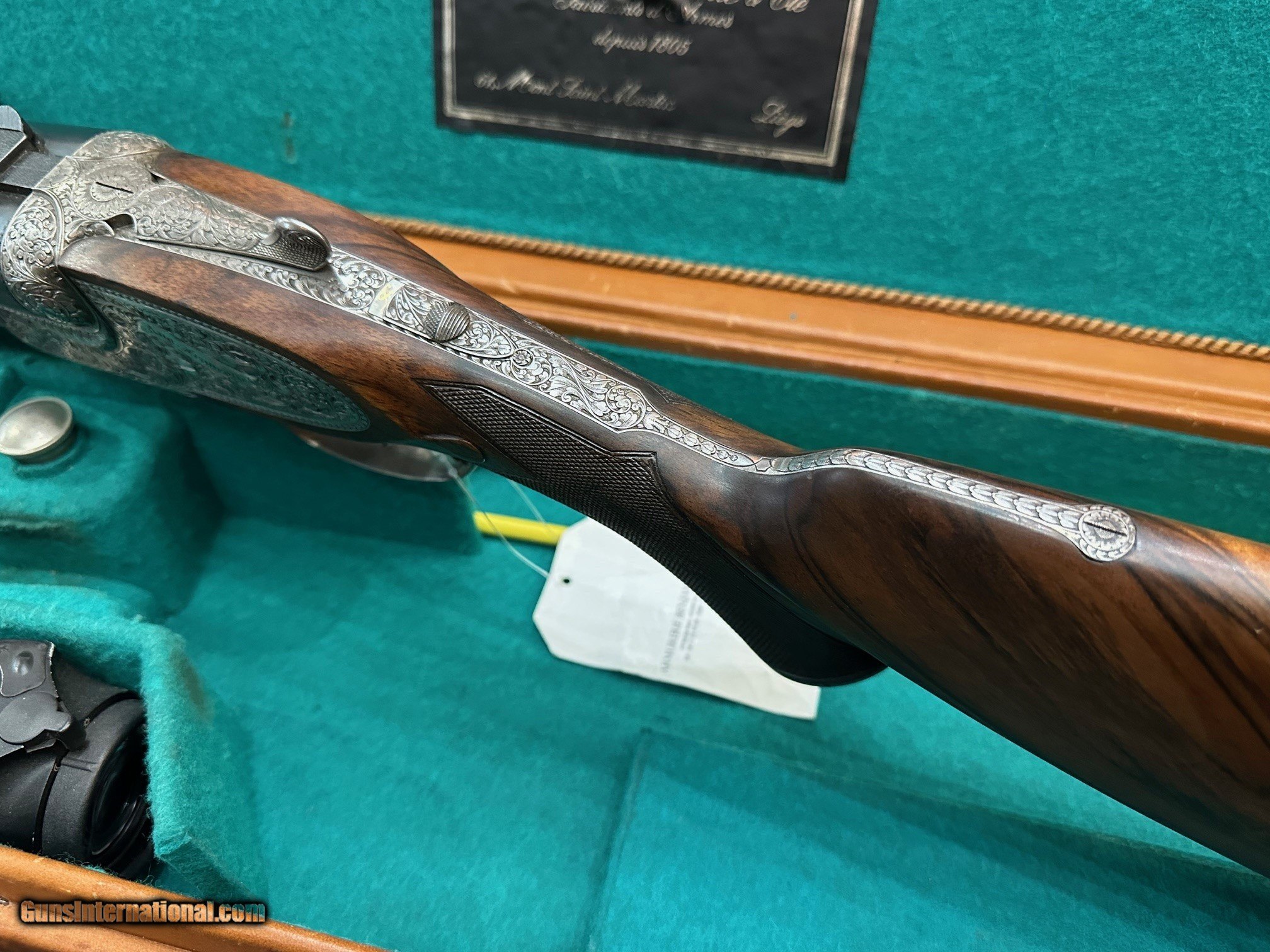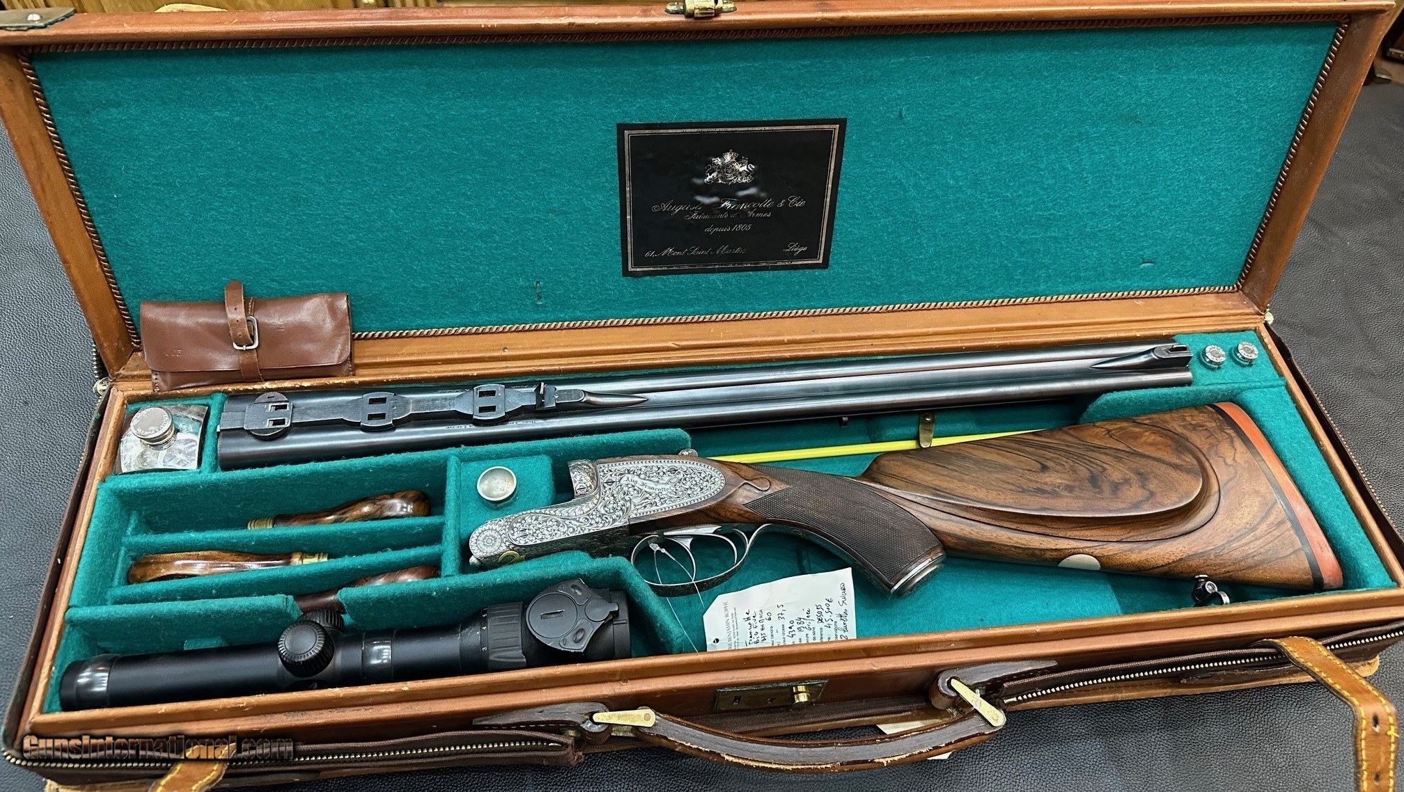 Description: A. FRANCOTTE - Big Five - Side by side - 375 HH mag - Back action Sidelock ejector Serial 91660 for 1984. 60 cm barrels. 375 Holland and Holland Magnum - Original condition Weight : 4,390 kg Hightly figured stock : Lenght 37,5 cm 39,5 cm Drop C : 40 mm H : 60 Cast right handed 0,2 mm 2 scopes : - Swarovski Z6i 1-6x24 - Zeiss Diavari VM 2,5-10X50 Original case and accessories - excellent original conditions This rifle comes from France Original and very good conditions Available in our Paris Shop Armurerie Elysées and ready to export to US. We handle all customs formalities and transport right to your gun shop. All informations on our guns are available on Armurerie Elyseessite Rifle Caliber: .375 H&H Magnum Manufacturer: Francotte Model: big five Barrel Length: 60 cm Ejectors: yes Condition: 90% Metal Condition: 90% Wood Condition: 90% Bore Condition: 90% Barrel Type: Chopperlump Triggers: double Fore End: large Manufacture Date: 1984 Engraving: Grifnée Optic: 2 Price: $45,000.00 Shipping: $1,500.00 Contact Seller |