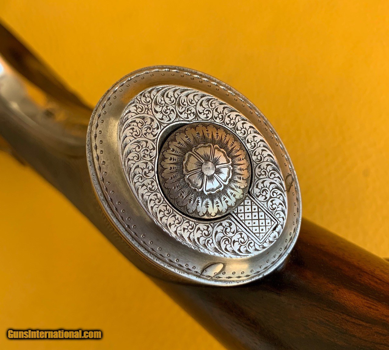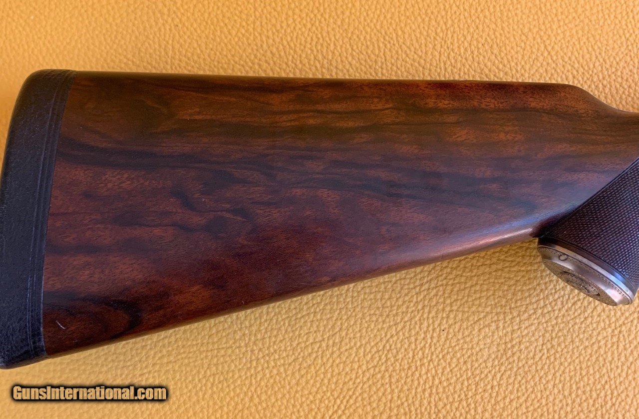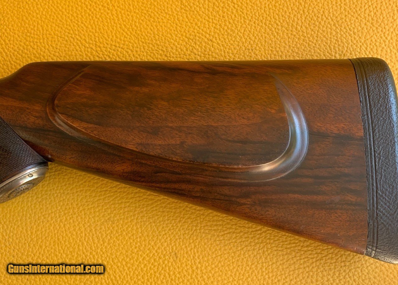 Description: Sold! #91371 , Francotte SLE 375 H&H belted magnum. Made in 1977, a best rifle put together by the best craftsmen . 24 ¾” chopper lump barrels from the Magi shop , with excellent plus bores and chambers , large blade type extractors for a guaranteed extraction/ejection of the rimless case. ¼ rib with claw mount bases , and a single standing express rear sight. Bolstered frame with back action locks of the H&H seven pins type. Purdey flat bolt plus third fastener on rib extention. Bushed firing pins with venting screws, manual safety , articulated front trigger, over the comb long top tang. 90% coverage tight scoll engraving and gold inlays of a rhino and lion heads, signed by the late Philippe Grifnee. Long trigger guard tang to a trap door engraved steel grip cap with a spare front sight. Inside and out in perfect condition. The rifle weight is 9 Lbs.4 Oz . Dark French walnut stock, with a shadow line cheeck piece, LOP is 15” over a 1 “ leather covered pad. Forend is a splinter type with a lever release and Southgate ejectors. Wood finish and checkering are in 90% original condition . I believe the wood work to have been done by Marcel Thys. With Hornady 300gr the rifle shoots 2 ¼” groups at 55 yards , and by experience I think a scope mounted on it will bring it even closer. An elegant rifle engraved by one of the great masters. SOLD Manufacturer: Francotte Model: SLE Serial Number: 91371 Caliber Info: 375 H&H belted mag Ejectors: Southgate ejectors Barrels: 24 3/4" chopper lump barrel Action: Bolstered frame with back action locks of the H&H seven pins type Stock: Dark French walnut, shadow line cheeck piece Fore End: Splinter forend with lever type release Butt Pad: 1" leather covered pad LOP: 15 Rib: 1/4 rib with claw mount bases Weight: 9 Lbs. 4 oz. Sights: Single standing express rear sight Engraving: 90% coverage tight scroll engraving, gold inlays of a rhino and lion heads signed by the late Philippe Grifnee |