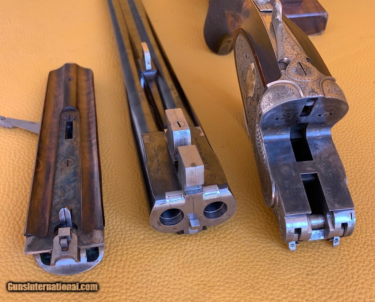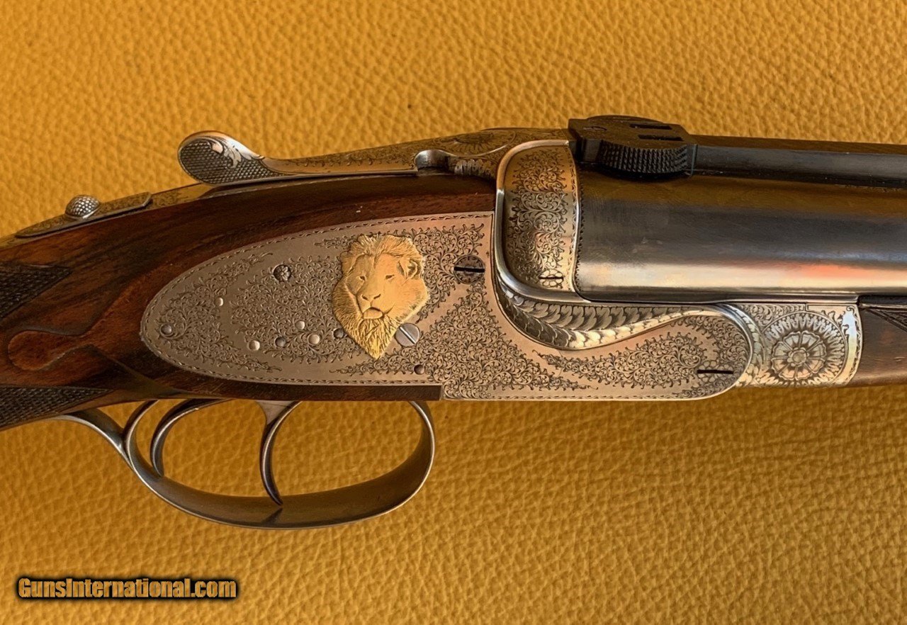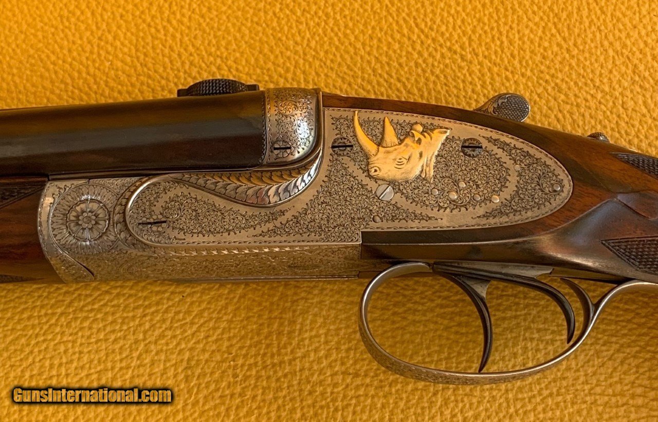 Description: Sold! #91371 , Francotte SLE 375 H&H belted magnum. Made in 1977, a best rifle put together by the best craftsmen . 24 ¾” chopper lump barrels from the Magi shop , with excellent plus bores and chambers , large blade type extractors for a guaranteed extraction/ejection of the rimless case. ¼ rib with claw mount bases , and a single standing express rear sight. Bolstered frame with back action locks of the H&H seven pins type. Purdey flat bolt plus third fastener on rib extention. Bushed firing pins with venting screws, manual safety , articulated front trigger, over the comb long top tang. 90% coverage tight scoll engraving and gold inlays of a rhino and lion heads, signed by the late Philippe Grifnee. Long trigger guard tang to a trap door engraved steel grip cap with a spare front sight. Inside and out in perfect condition. The rifle weight is 9 Lbs.4 Oz . Dark French walnut stock, with a shadow line cheeck piece, LOP is 15” over a 1 “ leather covered pad. Forend is a splinter type with a lever release and Southgate ejectors. Wood finish and checkering are in 90% original condition . I believe the wood work to have been done by Marcel Thys. With Hornady 300gr the rifle shoots 2 ¼” groups at 55 yards , and by experience I think a scope mounted on it will bring it even closer. An elegant rifle engraved by one of the great masters. SOLD Manufacturer: Francotte Model: SLE Serial Number: 91371 Caliber Info: 375 H&H belted mag Ejectors: Southgate ejectors Barrels: 24 3/4" chopper lump barrel Action: Bolstered frame with back action locks of the H&H seven pins type Stock: Dark French walnut, shadow line cheeck piece Fore End: Splinter forend with lever type release Butt Pad: 1" leather covered pad LOP: 15 Rib: 1/4 rib with claw mount bases Weight: 9 Lbs. 4 oz. Sights: Single standing express rear sight Engraving: 90% coverage tight scroll engraving, gold inlays of a rhino and lion heads signed by the late Philippe Grifnee |