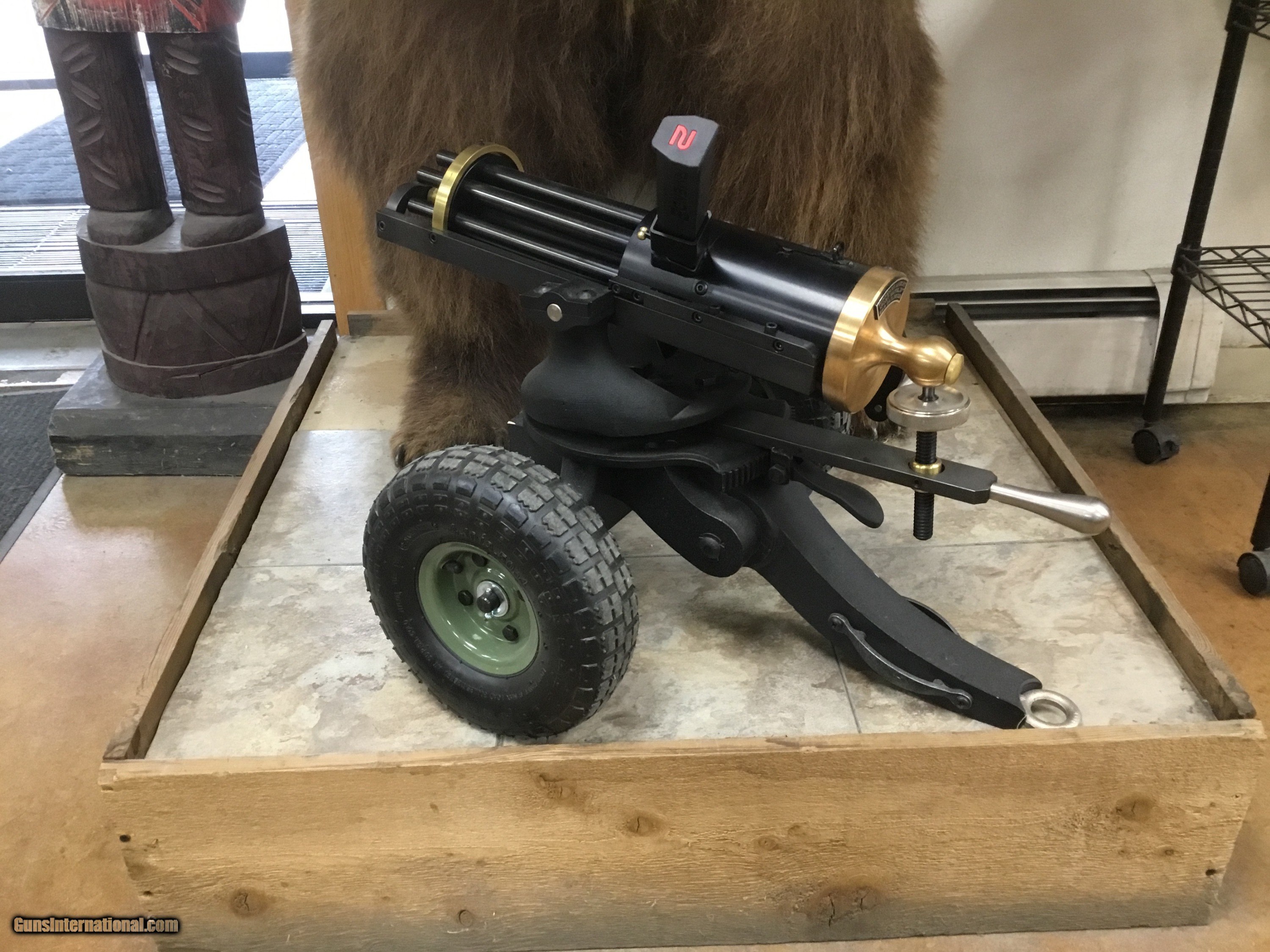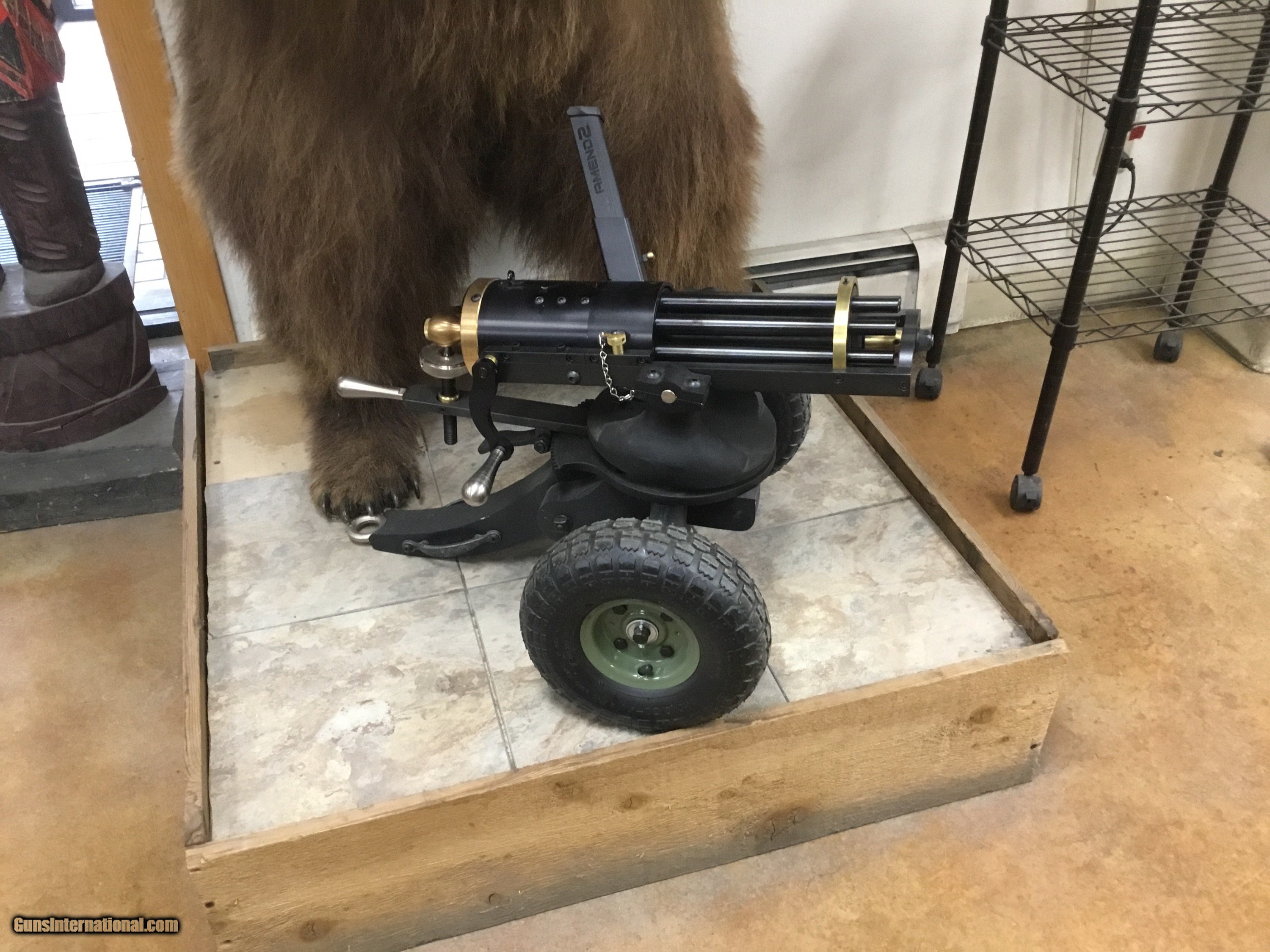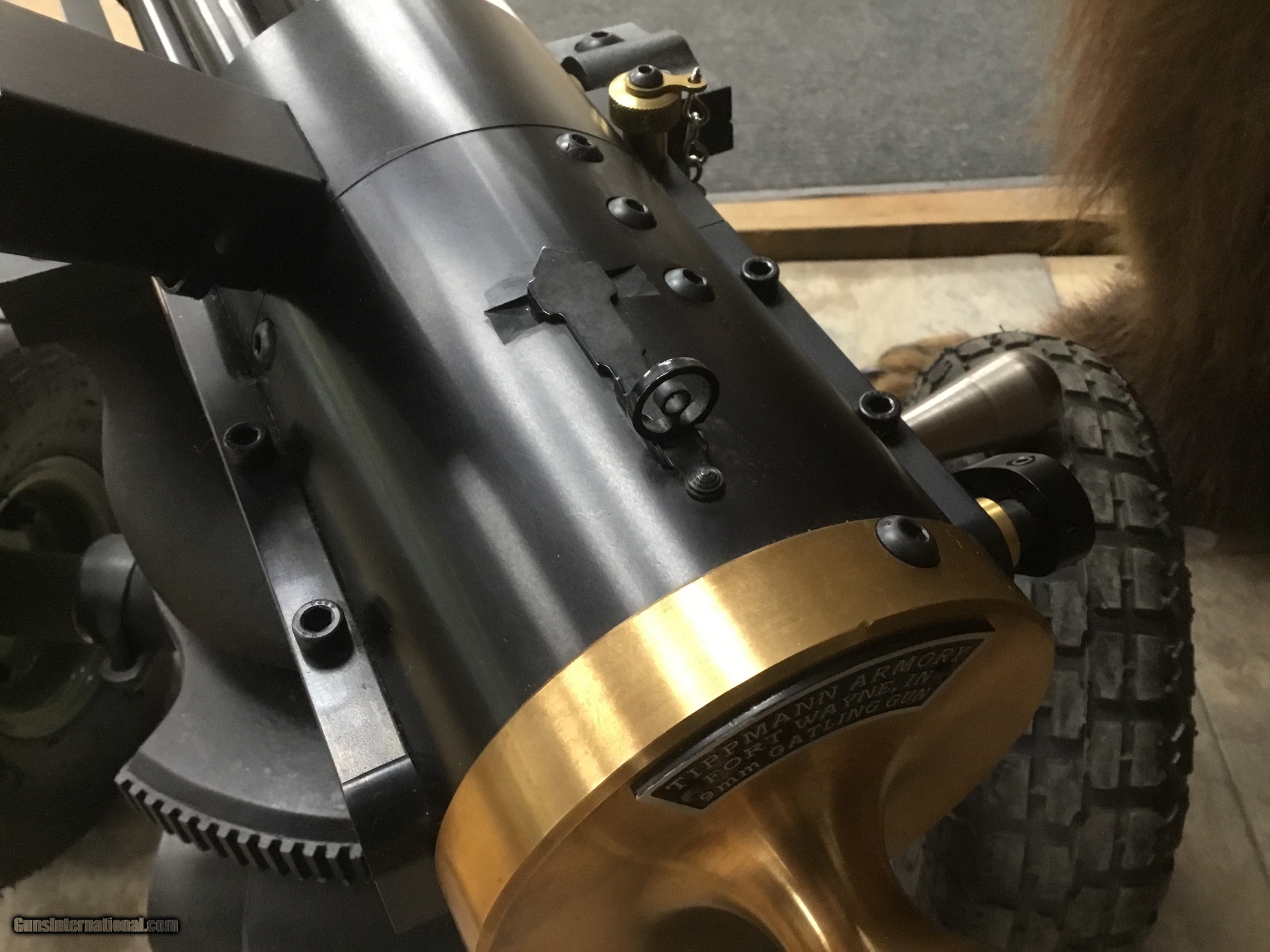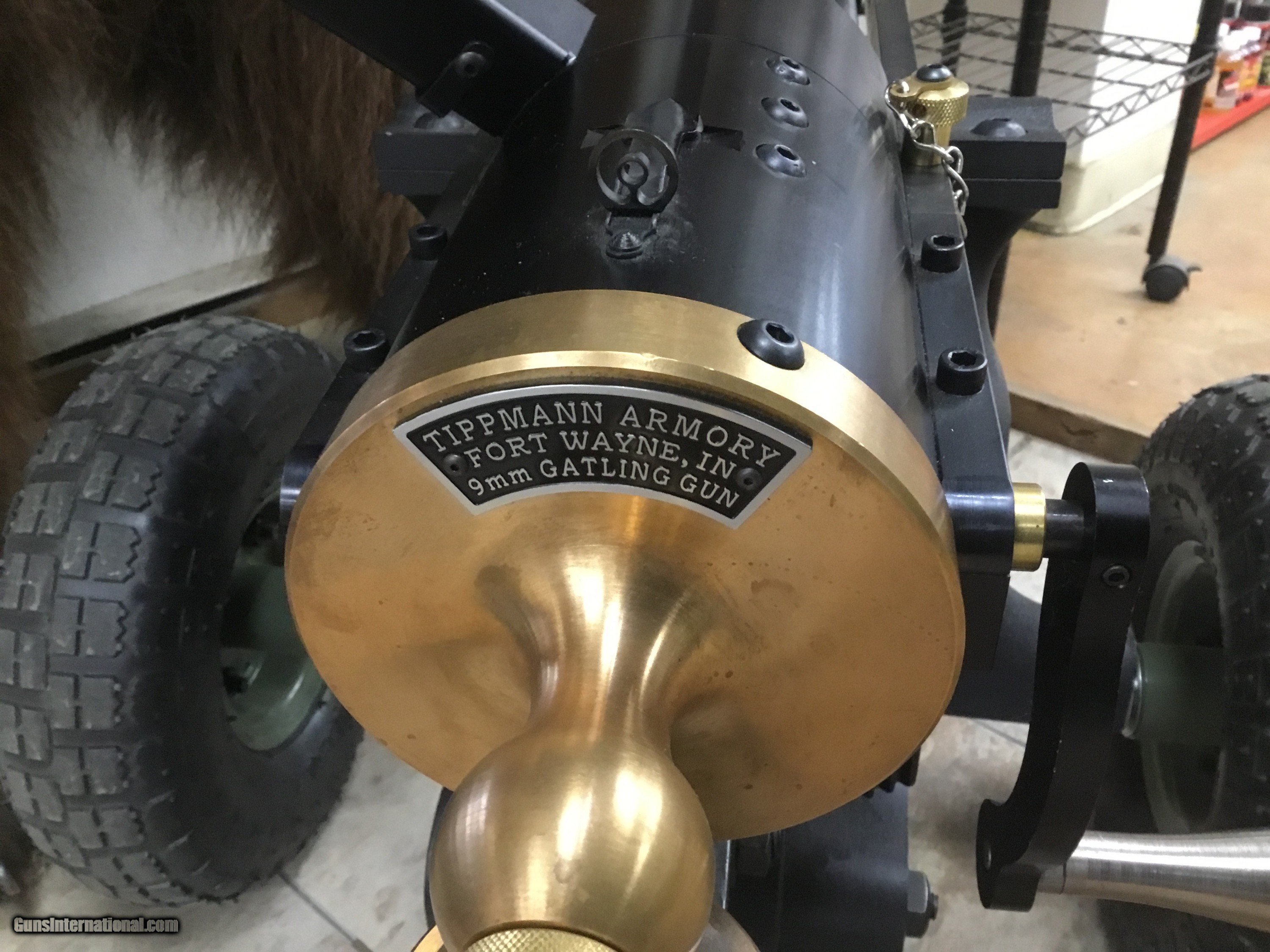 Description: Quality Tippman Ordinance TG-900 chambered in 9X19mm Parabellum. It’s an old style crank gun chambered in a modern cartridge with total of 8 barrels at 10 inches, 120 degrees of traverse, and 5 degrees of elevation. The firearm is on a rolling frame, has a bullseye rear sight, bead front sight, and accepts Glock pattern double stack 9mm magazines. It comes with one 34 round magazine. SOLD Handgun Caliber: 9x19mm Parabellum (9mm Luger, 9x19mm NATO) Manufacturer: Tippmann Model: TG-900 Serial Number: 0466 Barrels: 8 Sights: Bullseye/Bead |