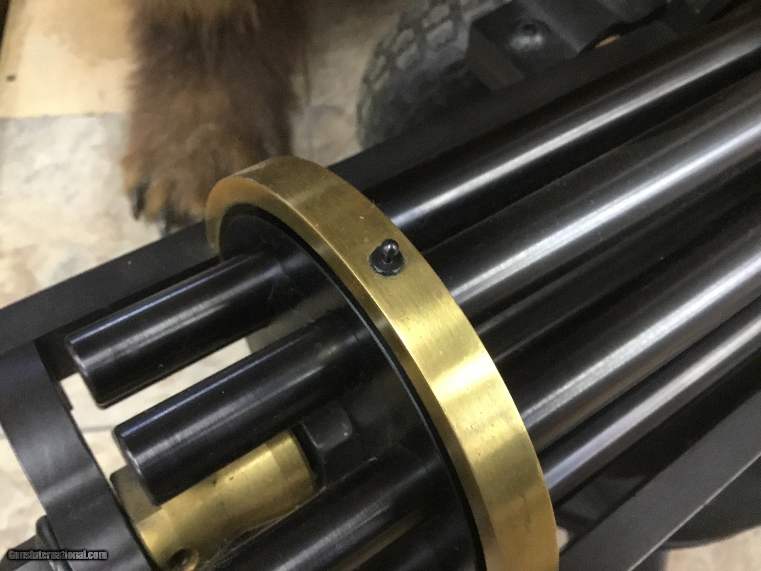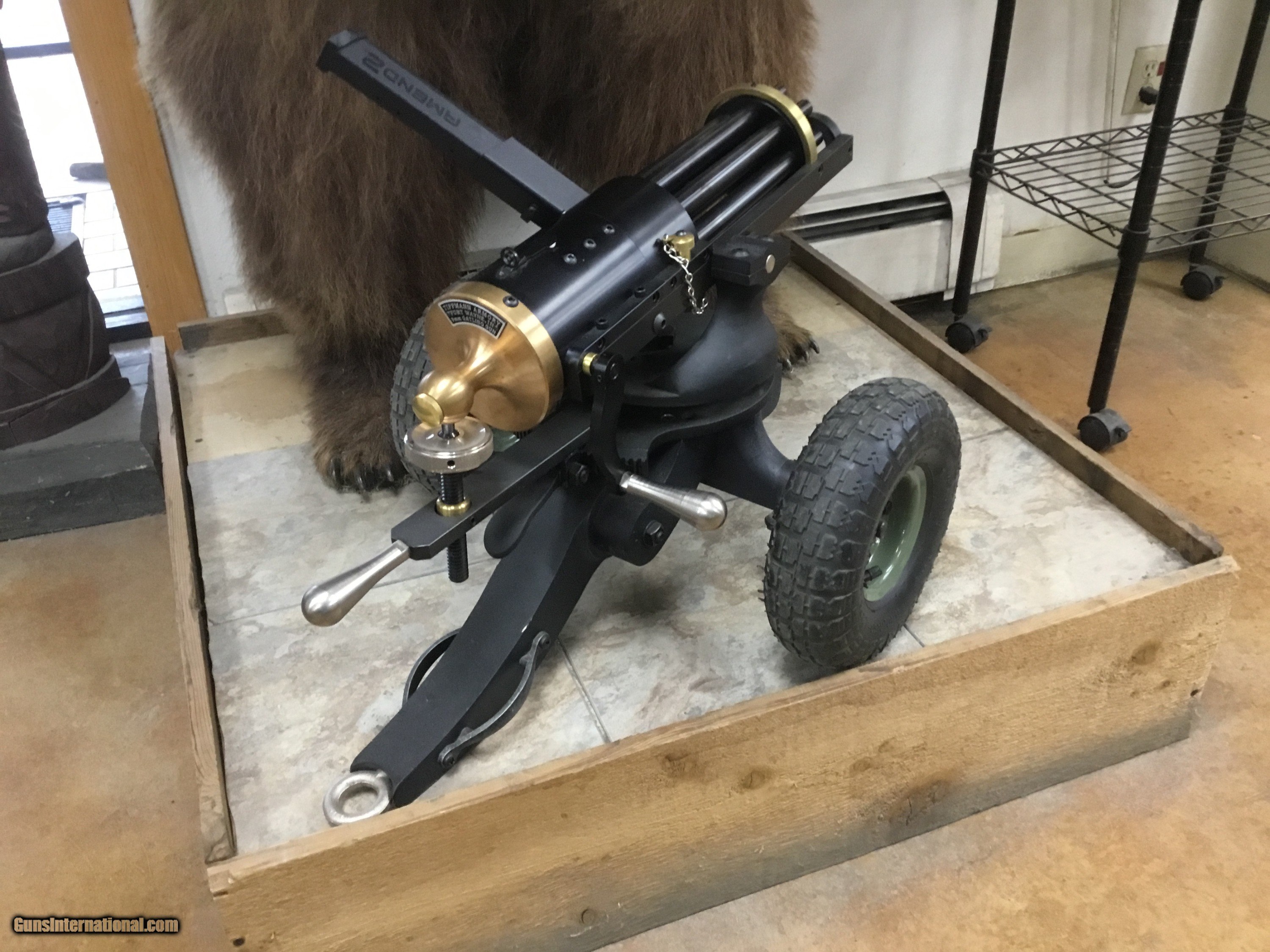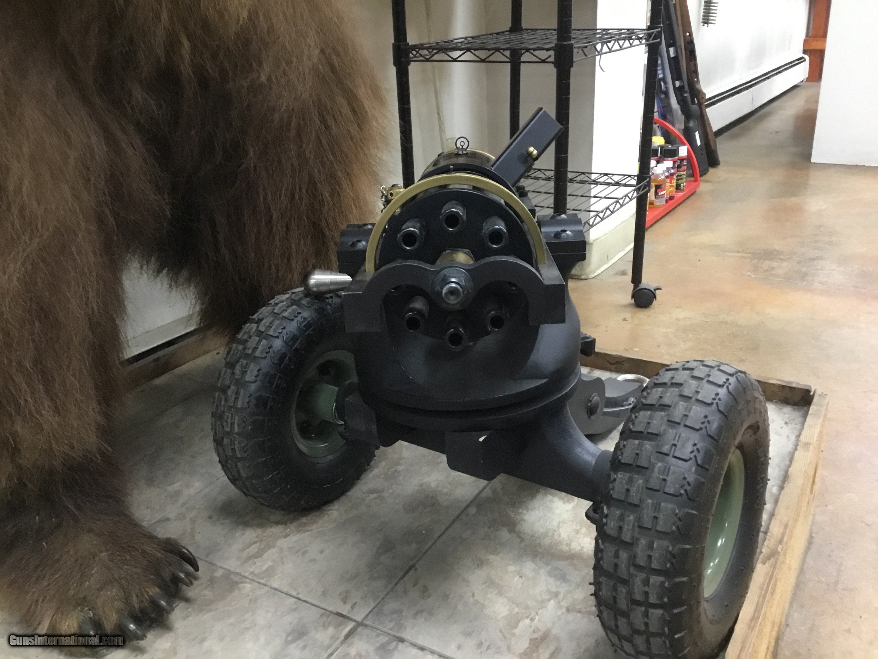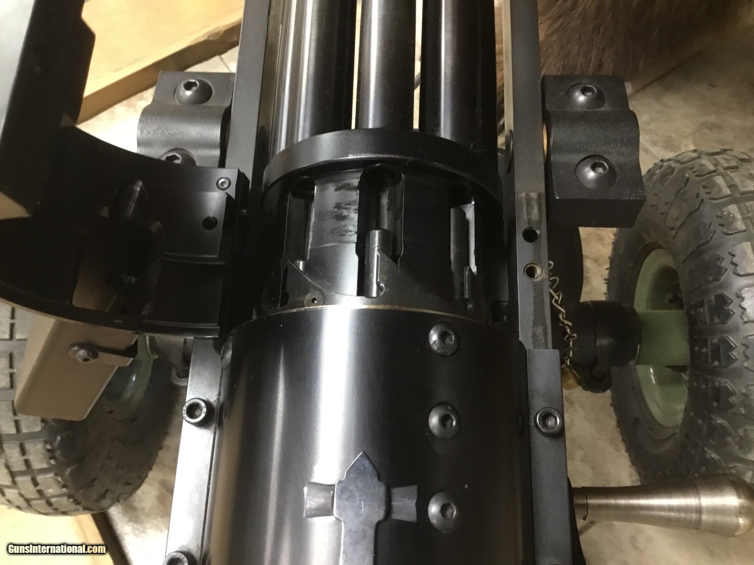 Description: Quality Tippman Ordinance TG-900 chambered in 9X19mm Parabellum. It’s an old style crank gun chambered in a modern cartridge with total of 8 barrels at 10 inches, 120 degrees of traverse, and 5 degrees of elevation. The firearm is on a rolling frame, has a bullseye rear sight, bead front sight, and accepts Glock pattern double stack 9mm magazines. It comes with one 34 round magazine. SOLD Handgun Caliber: 9x19mm Parabellum (9mm Luger, 9x19mm NATO) Manufacturer: Tippmann Model: TG-900 Serial Number: 0466 Barrels: 8 Sights: Bullseye/Bead |