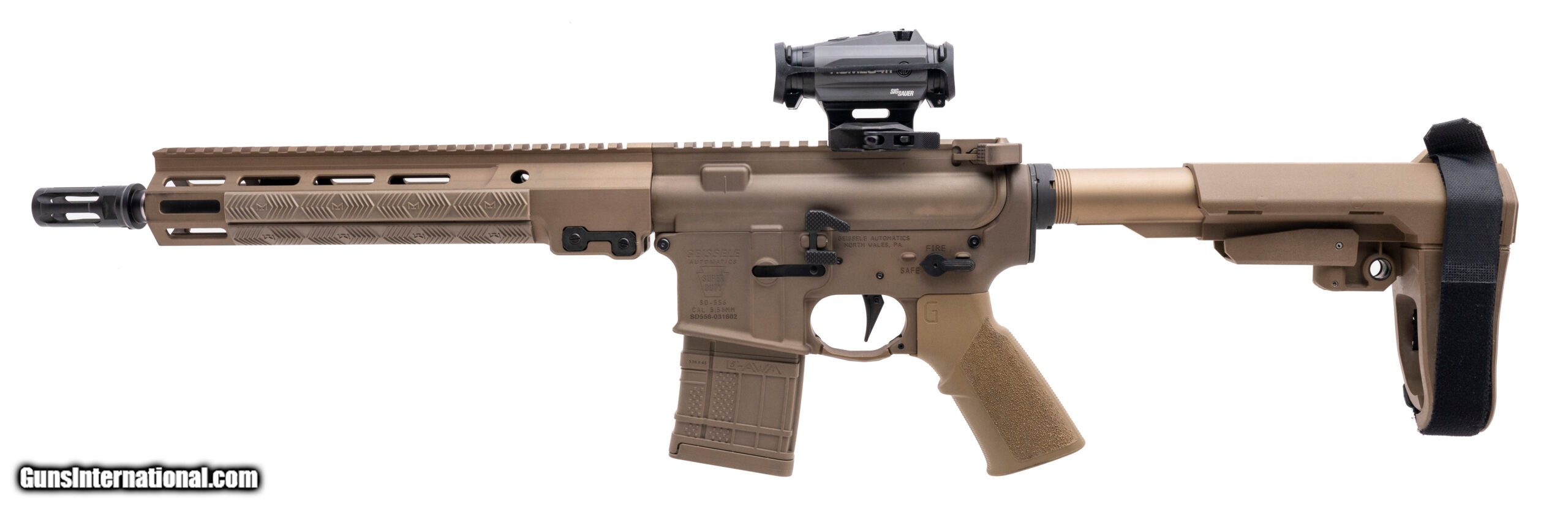 Description: "SN: SD556-031602. Modern production 5.56 NATO with an 11.5"" CHF, Chrome Lined, Geissele Profile Barrel and flash hider. Bore is bright with excellent rifling. Semi-Auto Tactical Pistol with a Sig Sauer Romeo4H Optic. DDC Finish is in excellent condition. Brace and pistol grip are in excellent condition. Overall condition is excellent. Comes with 2 extra magazines. SOLD |