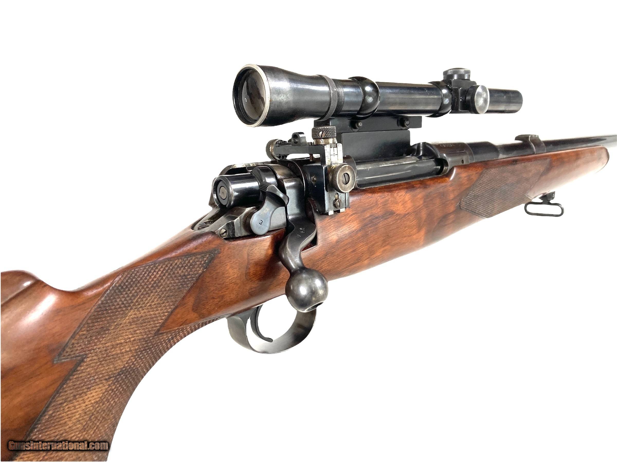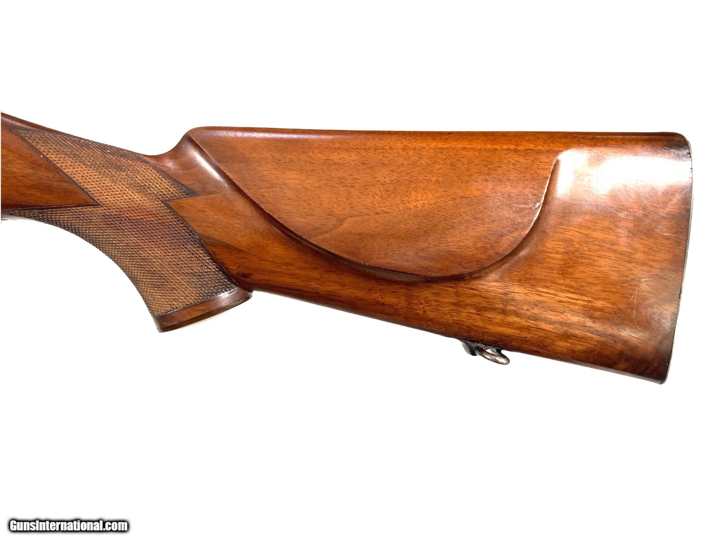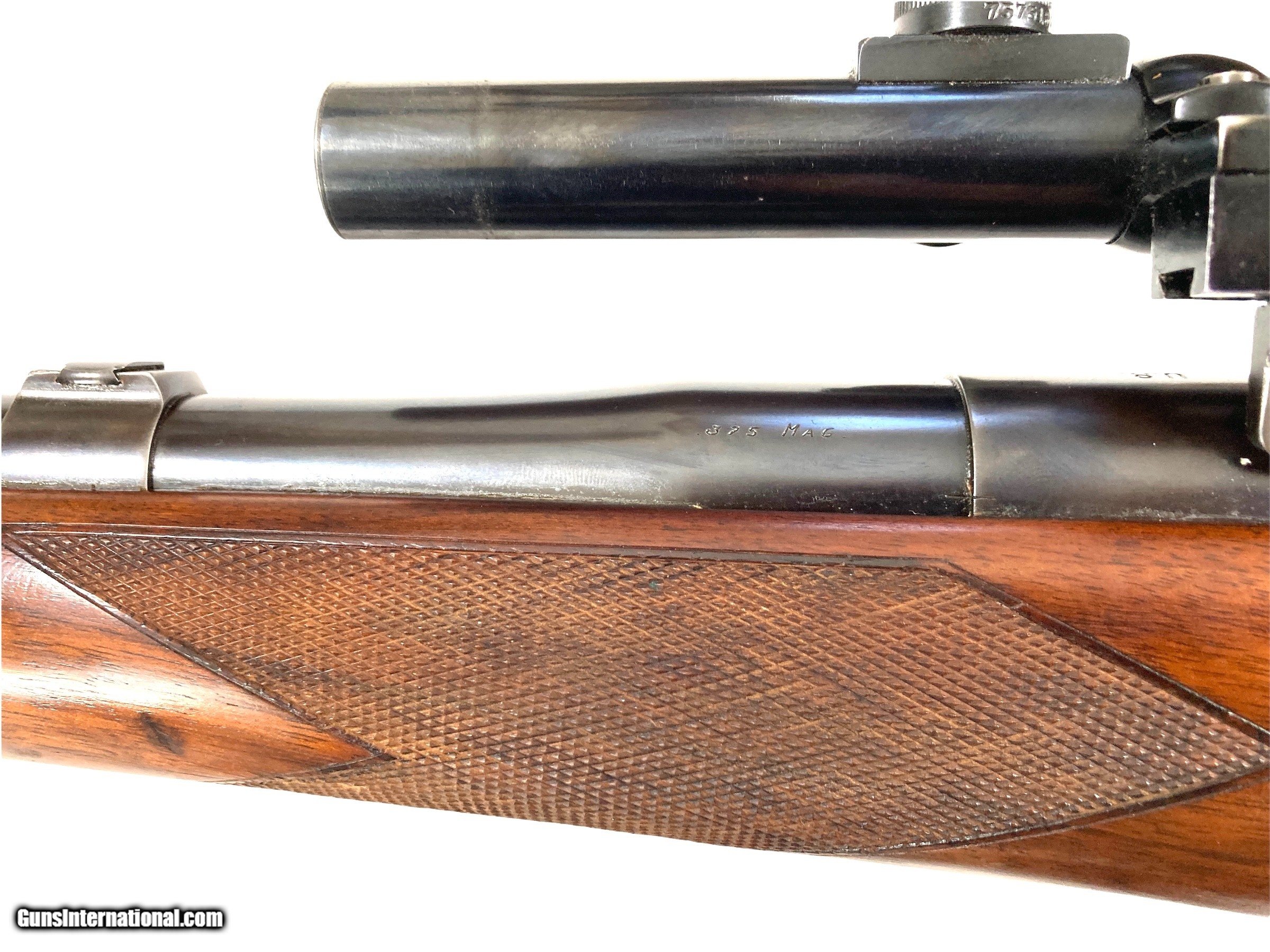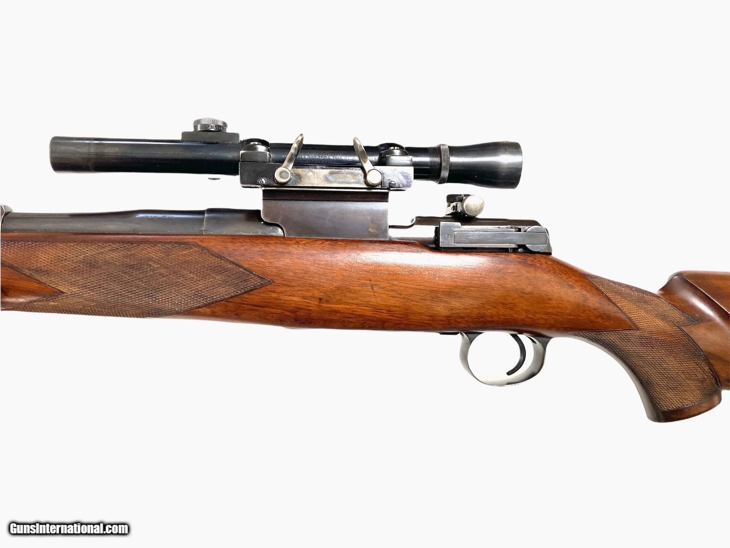 Description: Griffin & Howe custom enfield 375 H&H rifle 26" barrel with banded rear sight base with blank insert( Lyman adjustable peep installed on action) banded ramp matted front sight Very good bore G&H side mount with excellent condition Lyman Alaskan 2.5x scope with post reticle Action converted to cock on open with fantastic adjustable trigger G&H did all the action and barrel work, I do not know who stocked the rifle LOP 13 1/2 ( could be 14 1/2 with addition of 1" pad) 11lbs 2oz with scope 10lbs 3oz without scope Very nice custom 375 H&H rifle that is ready to hunt SOLD Curio/Relic: Yes Rifle Caliber: .375 H&H Magnum |