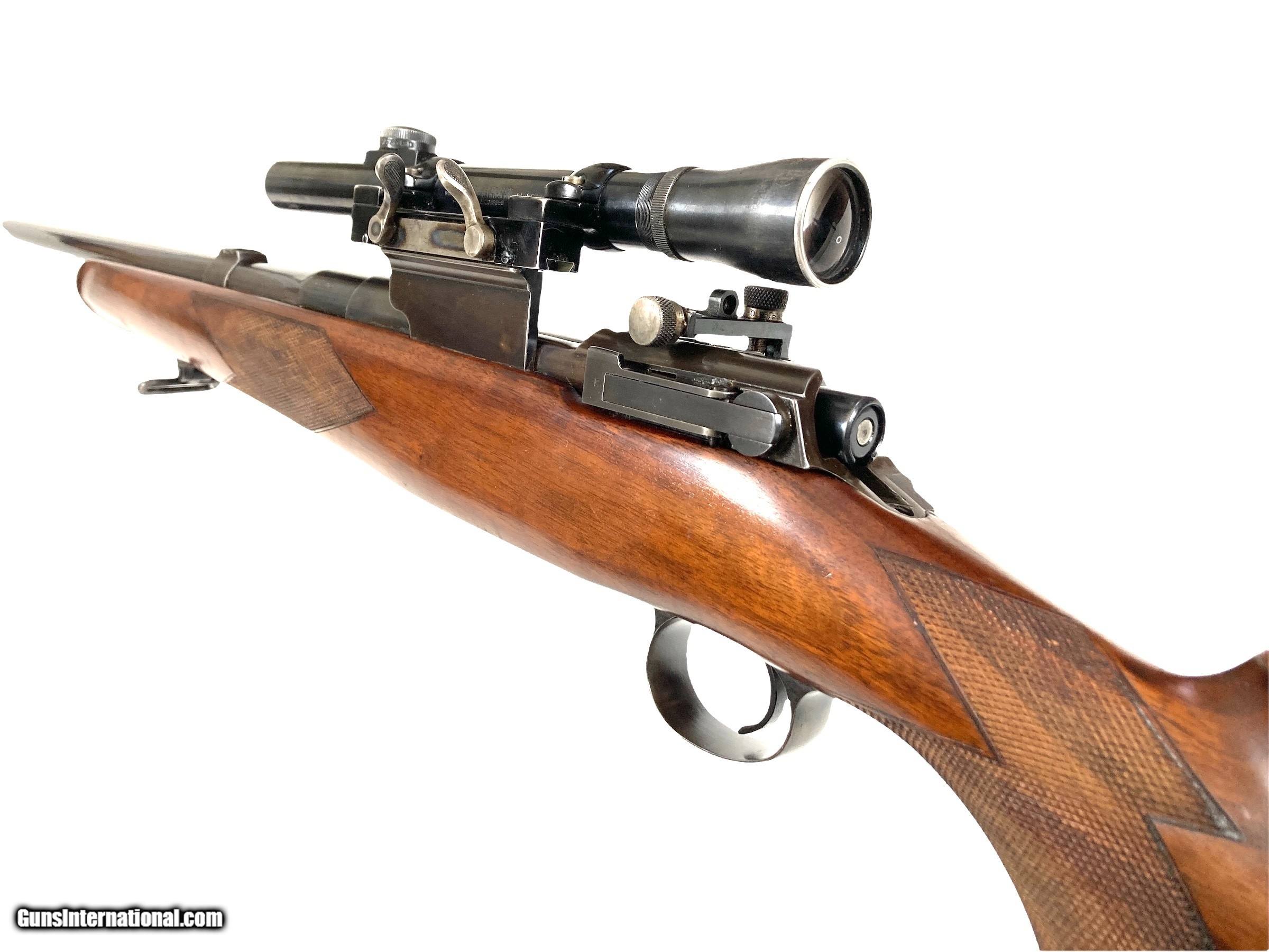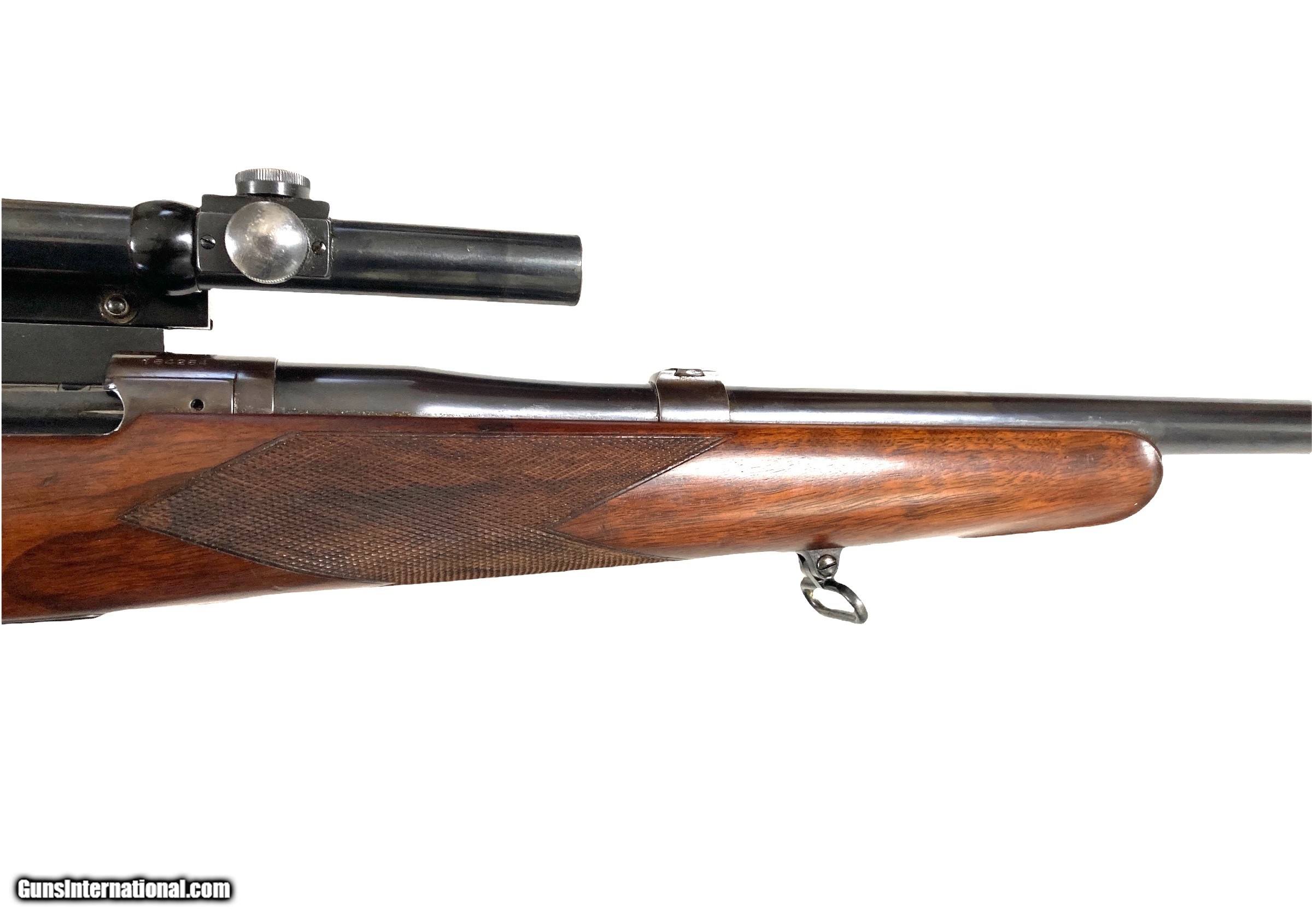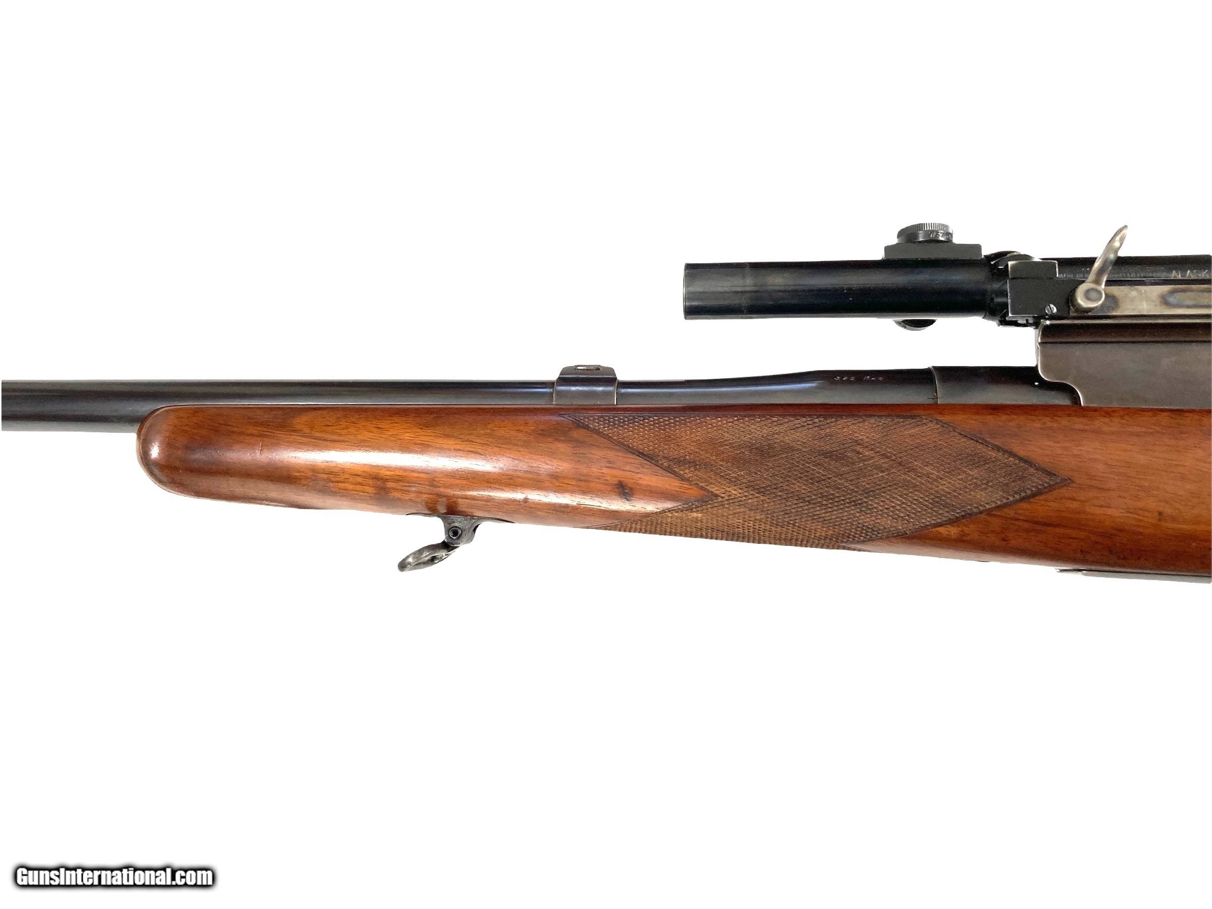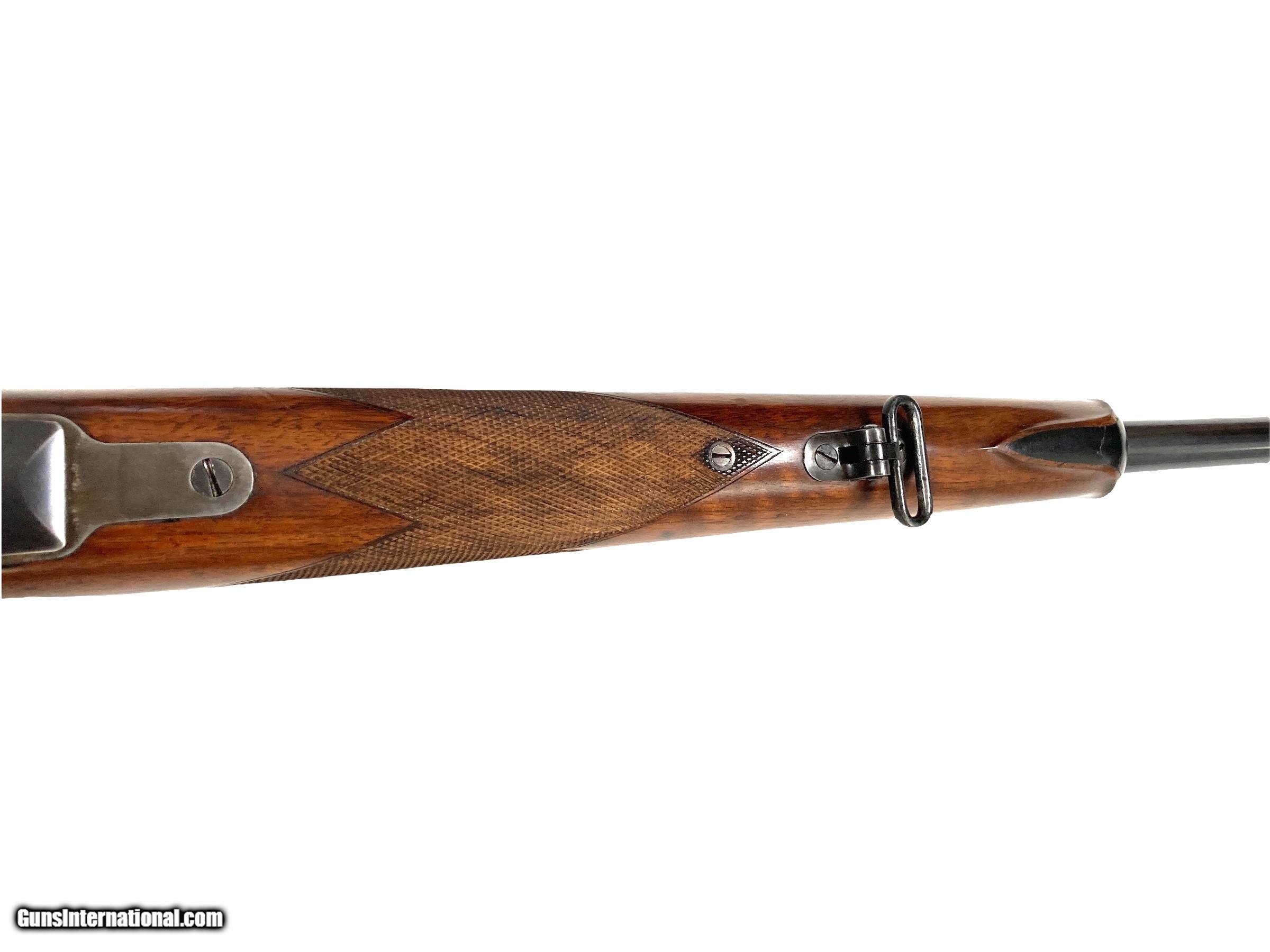 Description: Griffin & Howe custom enfield 375 H&H rifle 26" barrel with banded rear sight base with blank insert( Lyman adjustable peep installed on action) banded ramp matted front sight Very good bore G&H side mount with excellent condition Lyman Alaskan 2.5x scope with post reticle Action converted to cock on open with fantastic adjustable trigger G&H did all the action and barrel work, I do not know who stocked the rifle LOP 13 1/2 ( could be 14 1/2 with addition of 1" pad) 11lbs 2oz with scope 10lbs 3oz without scope Very nice custom 375 H&H rifle that is ready to hunt SOLD Curio/Relic: Yes Rifle Caliber: .375 H&H Magnum |
