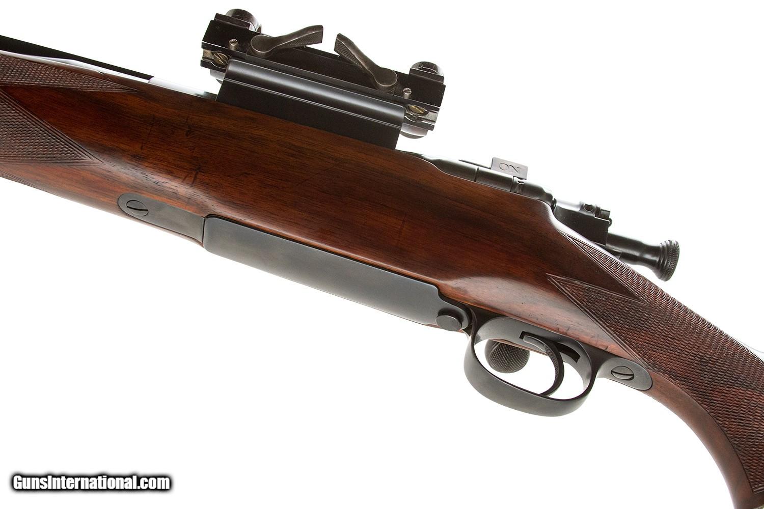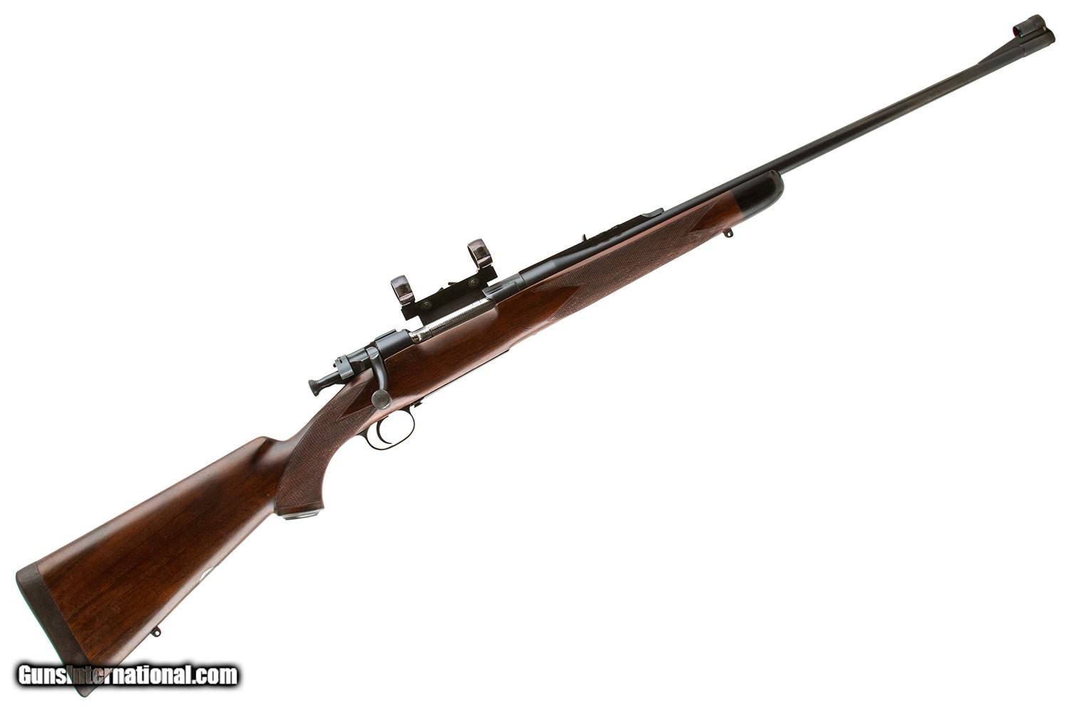 Description: GRIFFIN #2267 24" BARREL WITH HOODED FRONT SIGHT 1/4 RIB EXPRESS SIGHT WITH 3 FOLDING AND 1 STANDING G&H SIDE MOUNT 2 PANEL CHECKERED BOLT JEWELED BOLT MINT CONDITION 8LBS 3 OZ 14 1/4 LOP SOLD |