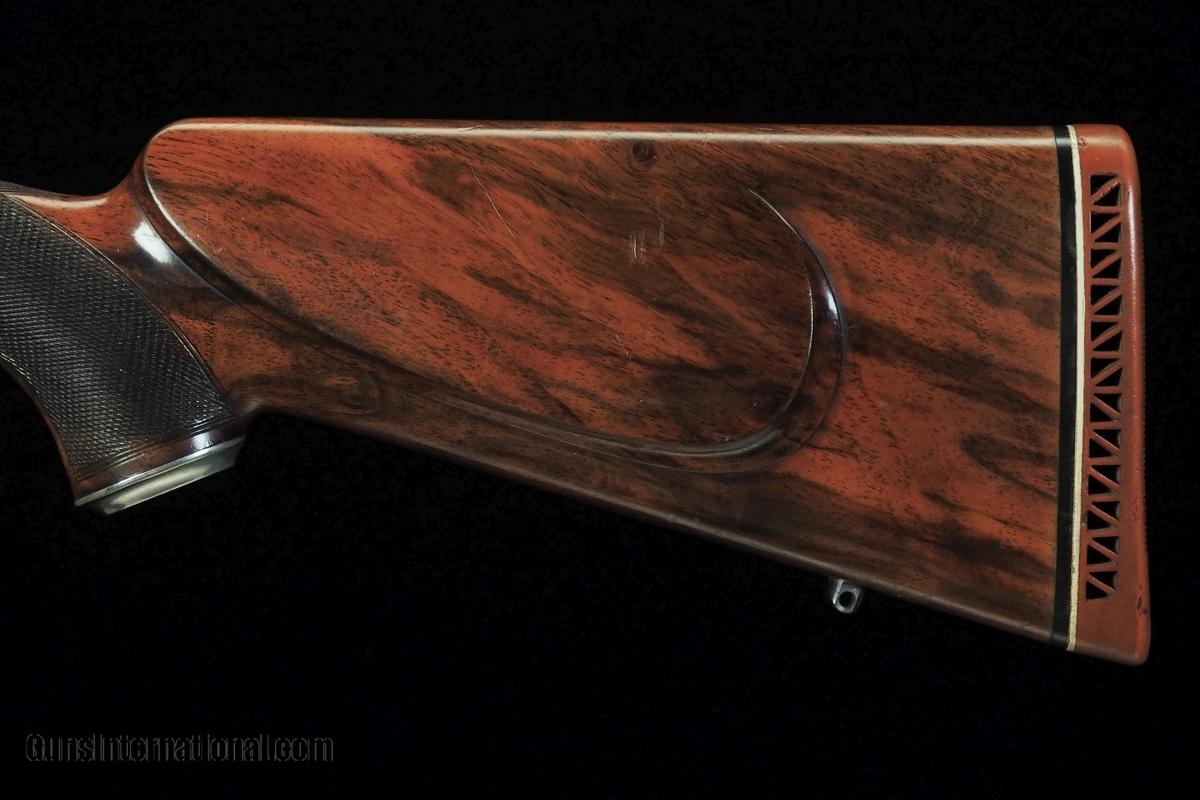 Description: ** Sale Pending** Griffin & Howe Pre-64 Model 70 Sporter, circa 1961, .300 H&H Magnum, 9 lbs. 2 oz., 25" barrel engraved "No. 2425 Griffin & Howe Inc. New York, NY" with banded front ramp site (missing hood), Pre-64 Winchester model 70 action with jeweled bolt and follower, checkered bolt knob in a 360 degree band, standard 3-position Winchester safety, inside triggerguard floorplate release, bright steel grip cap, nicely figured 13" LOP stock with cheekpiece, wrap checkering, engraved recoil bolt, and ebony forend tip, swivel studs, red Pachmayr pad, Griffin & Howe sidemount scope mount with Redfield 3-9x scope mounted, side mounted rear peep site frame with site missing. Excellent mechanical condition showing typical marks and blue wear from hunting use. This would make an excellent hunter but is not a collector's specimen. This rifle has traveled and seen the world with it's original owner and is ready for it's next adventure. Provenance: Owned and hunted with by Dr. Walter Brandon Macomber, a famed world hunter. Dr. Macomber completed his Grand Slam in 1966. He was the 1966 Weatherby Award winner presented by Roy Weatherby. He was inducted into the SCI Hunter Hall of Fame in 1985. SOLD |