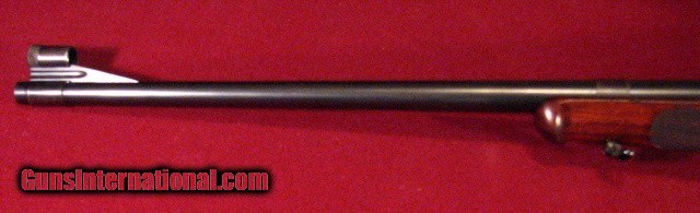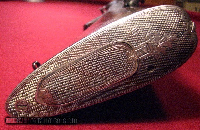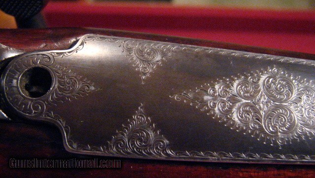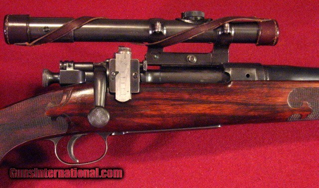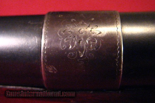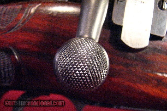 Description: Very early Kornbrath engraved Griffin & Howe Springfield 30-06 with 24 " barrel with banded hooded ramp front sight and banded sling swivel barrel tie down. Early single lever Griffin & Howe sidemount marked "Pat. Appl. For". Zeiss Zeilklein 2x scope with original leather lens covers. Lyman 48 receiver peep sight.Serrated trigger face. Bolt knob flattened and checkered on the inside with a pear shaped checkered panel on the outside. Rudolph Kornbrath scroll engraving on the barrel shank, barrel band, floorplate, and trigger guard. This gun does not have a Griffin & Howe serial number on the barrel. Stocked in a very nice piece of European Walnut with an early style Fleur-de-Lis checkering pattern, horn pistol grip cap, and schnabel forend tip. Checkered and engraved trap buttplate containing an oil bottle. Overall good condition with an excellent bore. 13 3/8" LOP 9lb 2oz as scoped. Seymour Griffin and James Howe formed Griffin & Howe in May of 1923. This is one of their earliest guns with no Griffin & Howe serial number but with Griffin & Howe Inc., New York engraved on the floorplate. This gun is from the Michael Petrov collection and pictured on page 25 of his book "Custom Gunmakers of the 20th Century". A rare piece of Americana. SOLD |