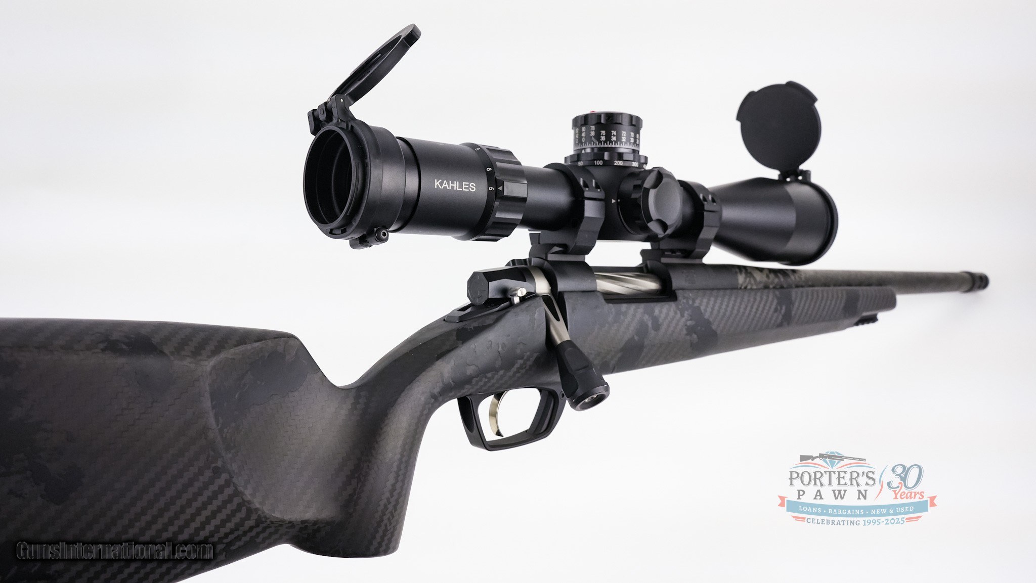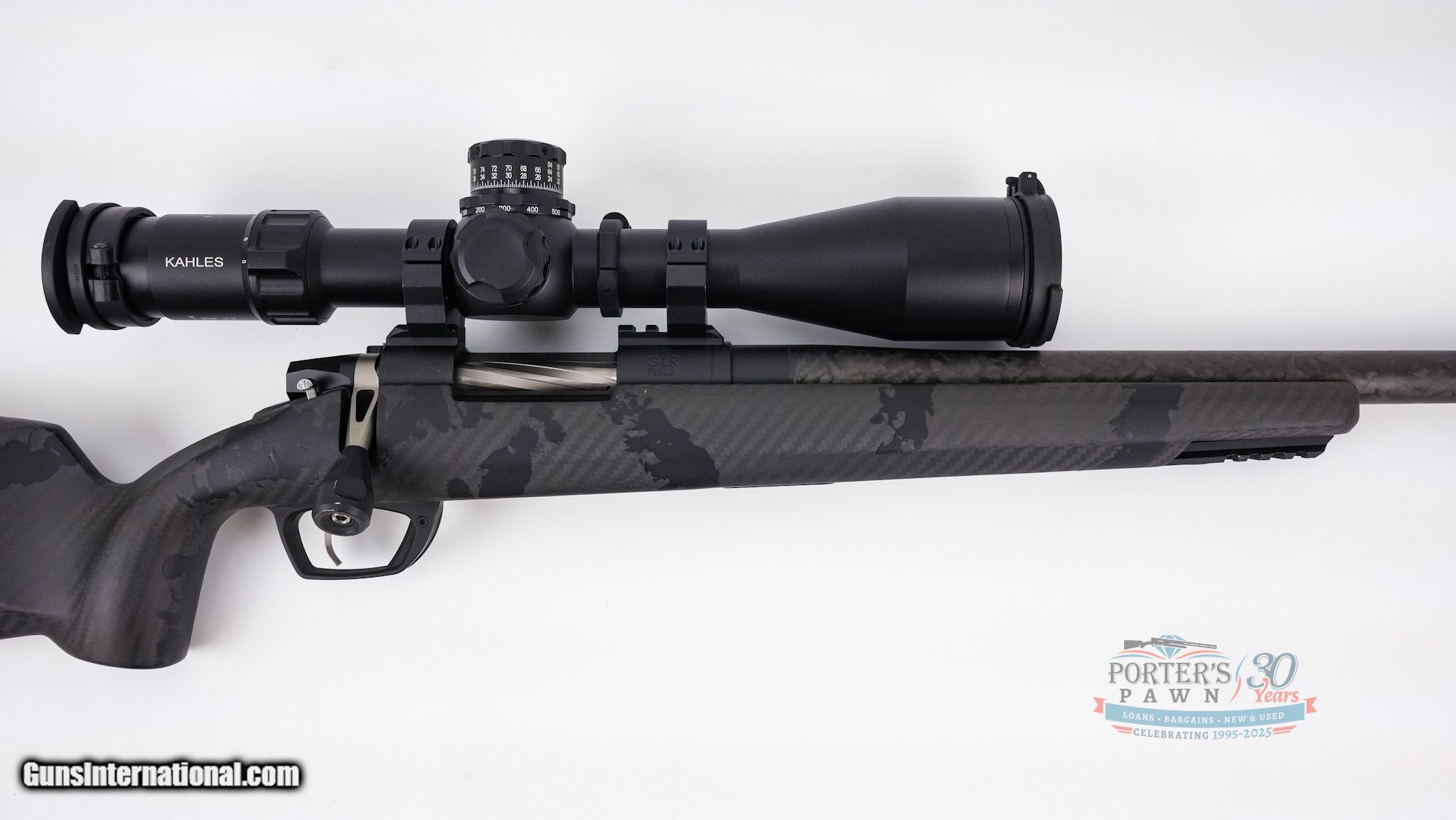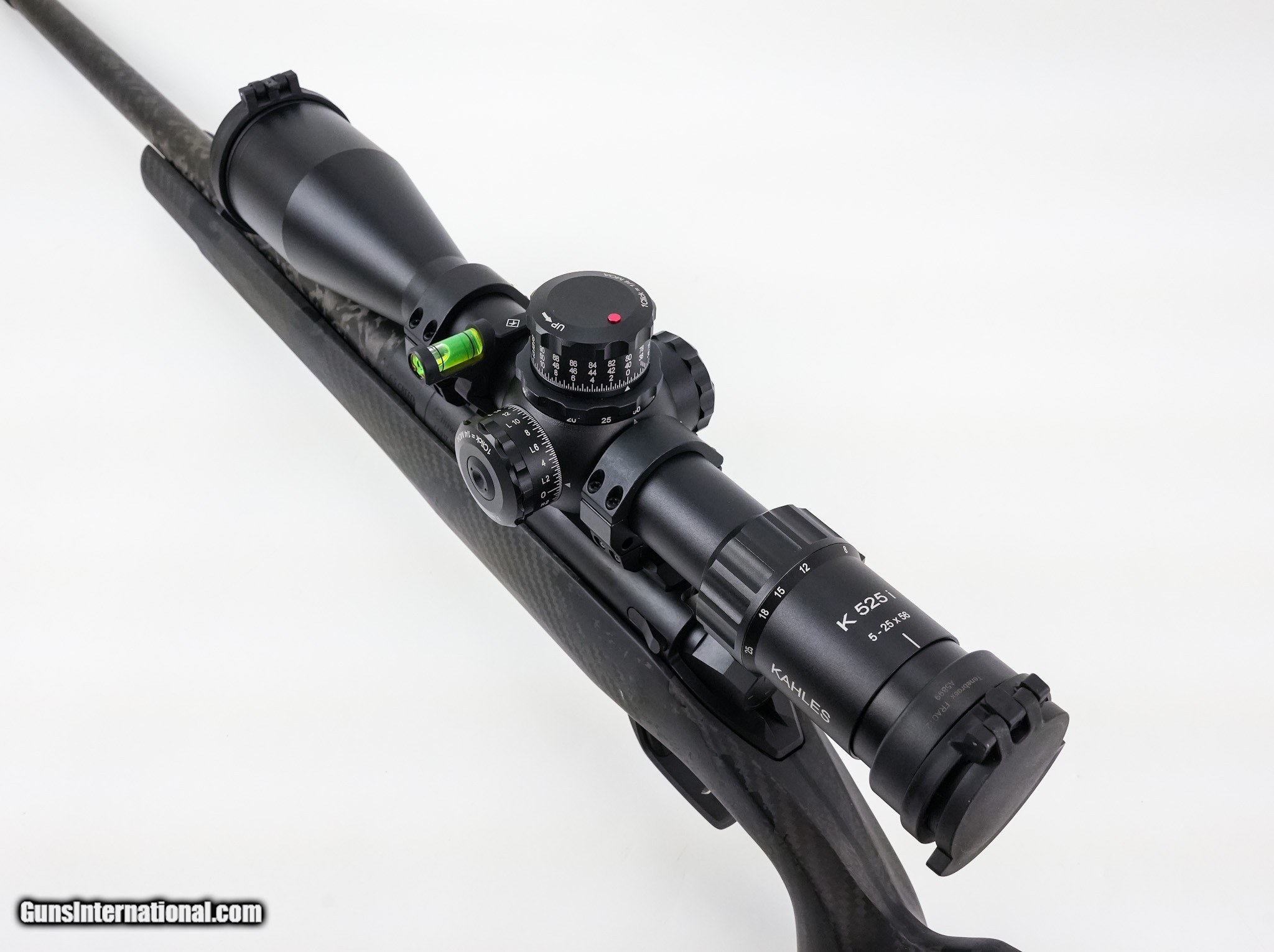 Description: Gunwerks ClymR Mountain Rifle – Kahles K525i 5-25x56 – Complete Precision Package This Gunwerks ClymR represents the pinnacle of mountain rifle engineering, paired with a Kahles K525i 5-25x56mm premium scope in excellent used condition. The rifle features a 20" carbon-wrapped barrel with 2" directional muzzle brake, stainless steel action, and carbon fiber stock in black camo. The Kahles K525i offers exceptional optical performance with 5-25x magnification, 56mm objective lens, and illuminated first focal plane reticle. Key features include TWIST GUARD windage protection, integrated parallax wheel (20m to 8), and zero-stop turrets. Includes flip-up lens covers and bubble level. With an overall length of 40.5", 13.5" length of pull, and total weight of 9lbs 13oz, this package balances precision with portability. The flush plate magazine maintains sleek profiles for backcountry mobility. Ready for extreme long-range shooting right out of the case. Rifle Specifications