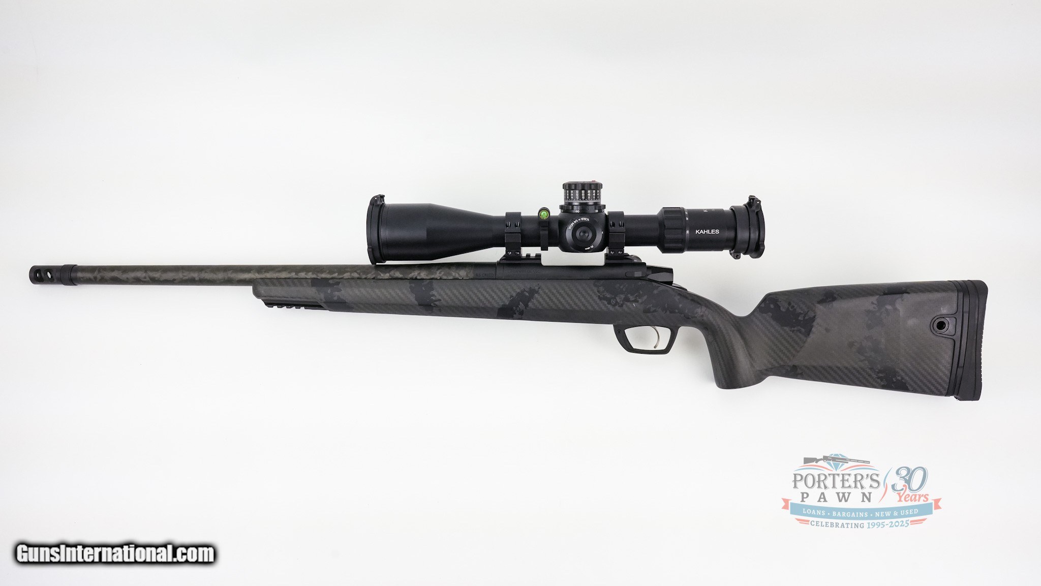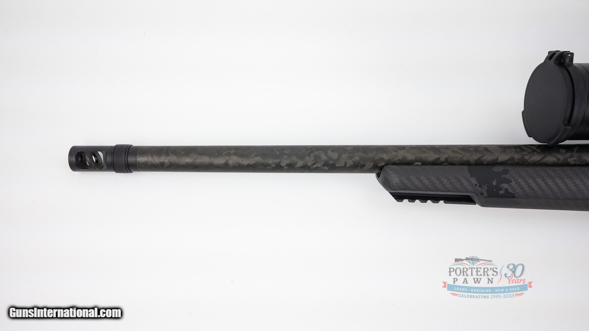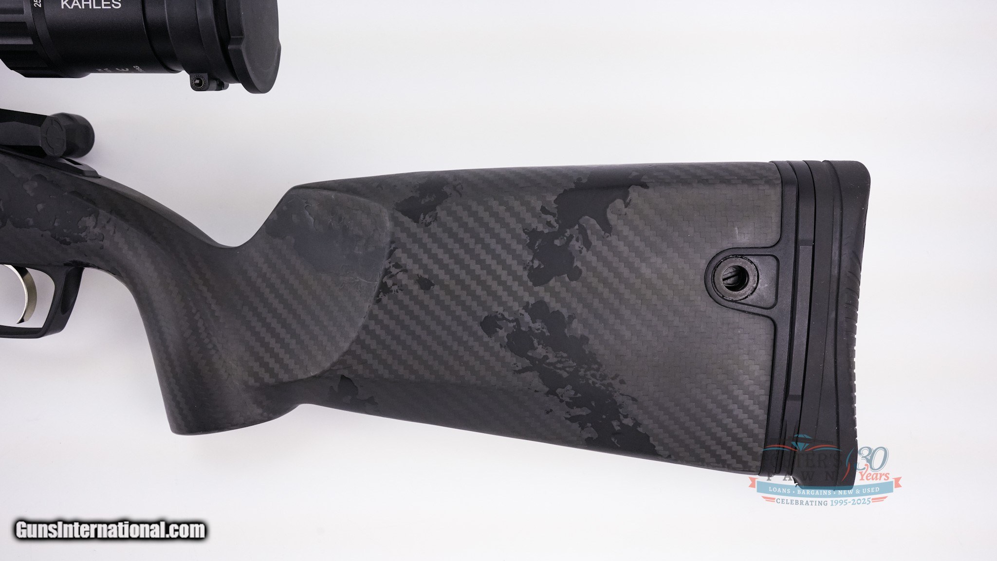 Description: Gunwerks ClymR Mountain Rifle – Kahles K525i 5-25x56 – Complete Precision Package This Gunwerks ClymR represents the pinnacle of mountain rifle engineering, paired with a Kahles K525i 5-25x56mm premium scope in excellent used condition. The rifle features a 20" carbon-wrapped barrel with 2" directional muzzle brake, stainless steel action, and carbon fiber stock in black camo. The Kahles K525i offers exceptional optical performance with 5-25x magnification, 56mm objective lens, and illuminated first focal plane reticle. Key features include TWIST GUARD windage protection, integrated parallax wheel (20m to 8), and zero-stop turrets. Includes flip-up lens covers and bubble level. With an overall length of 40.5", 13.5" length of pull, and total weight of 9lbs 13oz, this package balances precision with portability. The flush plate magazine maintains sleek profiles for backcountry mobility. Ready for extreme long-range shooting right out of the case. Rifle Specifications