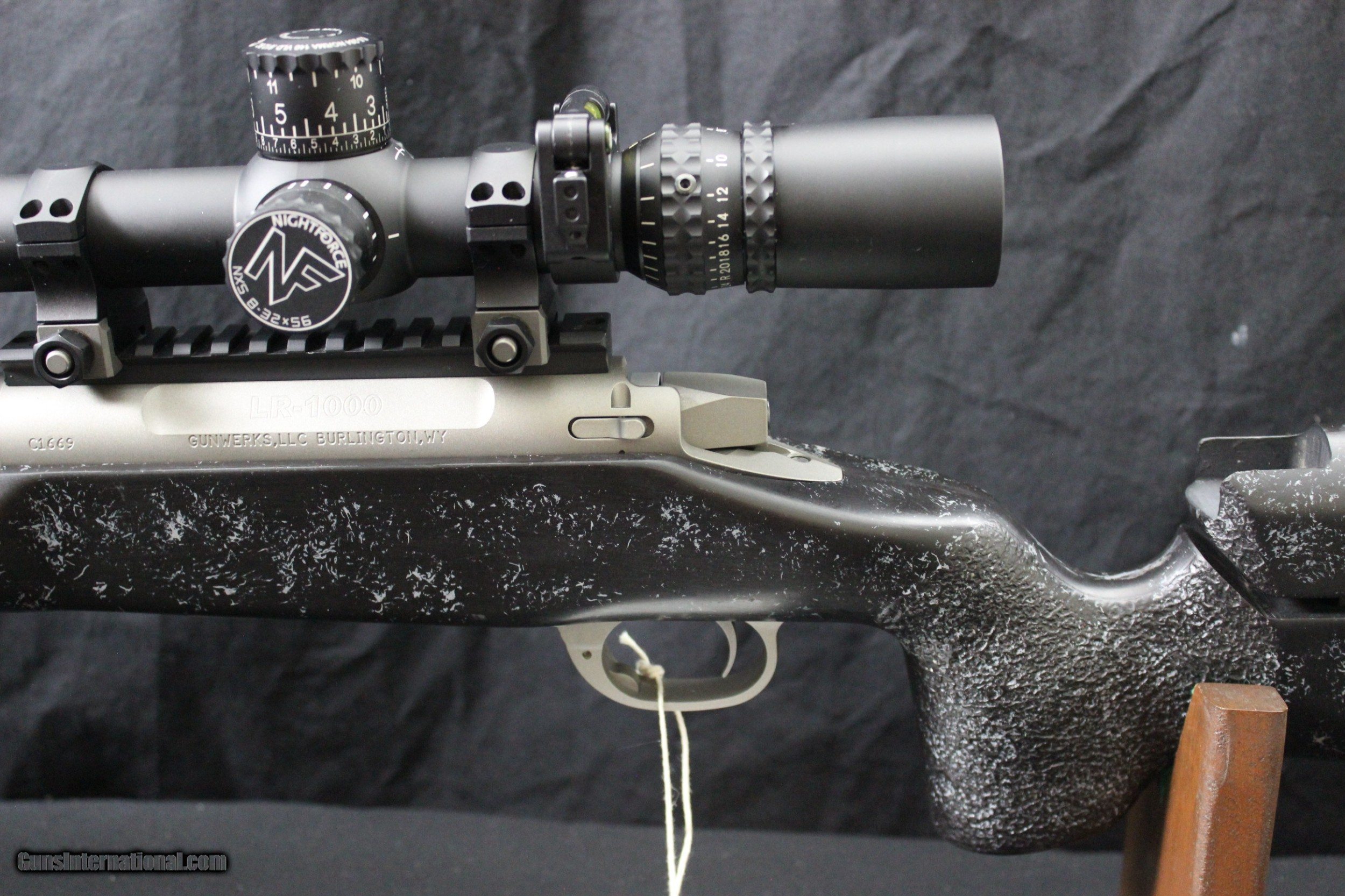 Description: Gunwerks LLC custom "Verdict" LR-1000 chambered in 6.5-.284 Norma with bipod & Nightforce 8-32x56MM scope that features a custom ballistically calibrated scope turret. The full featured fiberglass rifle stock has an adjustable cheek and recoil pad and the customization of a chasis system with the fit and feel of a traditional rifle stock. If you're looking for an accurate long range rifle, this is it! Dimensions are as follows BBL. 27 1/2" with brake WT. 15lbs 6oz. DIM. 13 3/4" L.O.P. SOLD |