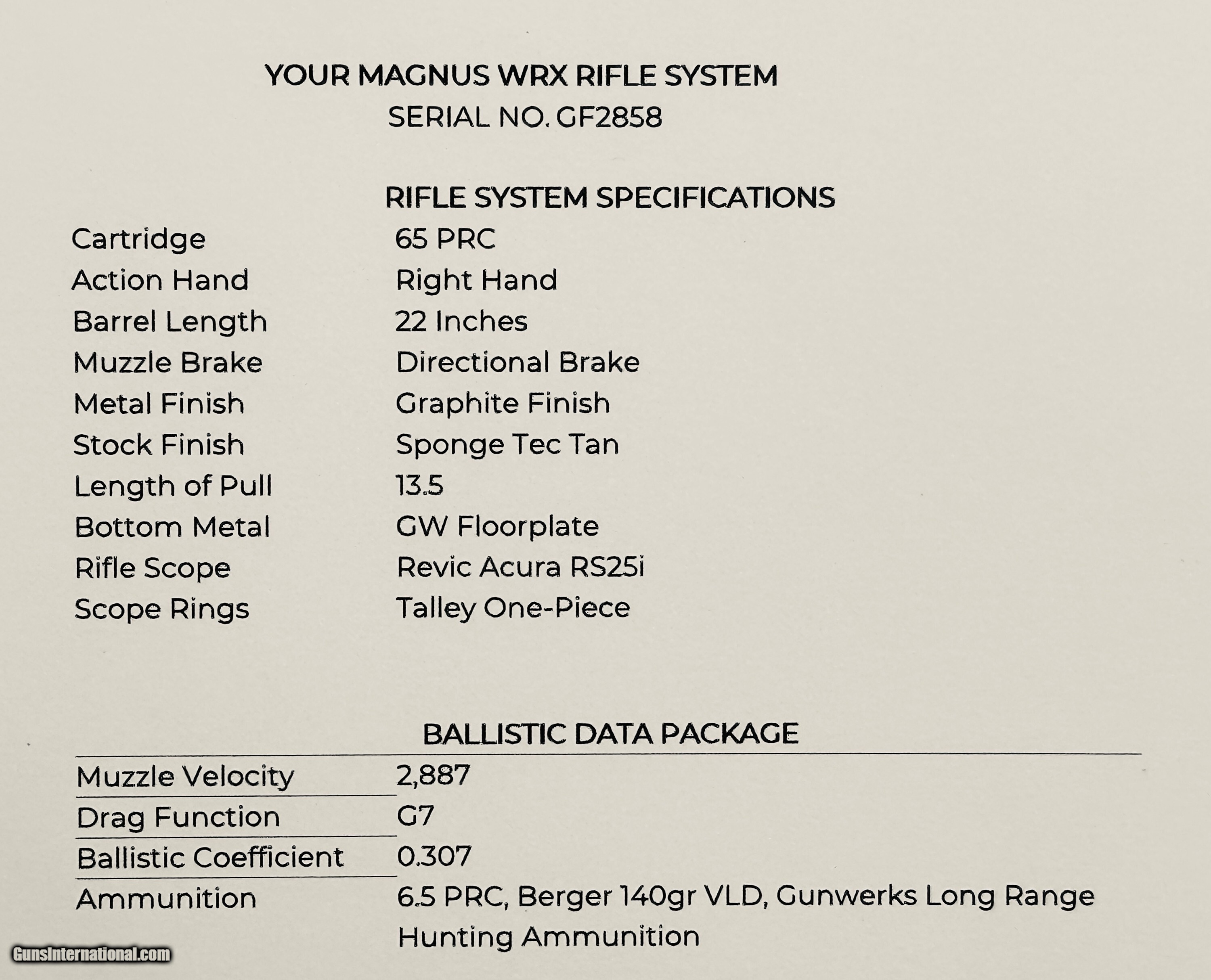 Description: NEW GUNWERKS MAGNUS WRX PROBUILD PACKAGE 6.5 PRC 22" BARREL, REVIC ACURA RS25i SCOPE W/ FREE 200-RDS AMMO, BIPOD AND HARD CASE - LAYAWAY AVAILABLE The WRX blends Gunwerk's Magnus stock with a stainless steel barrel to give the most balance and shootability for a long-range platform. The optimized geometry of the Magnus stock provides the control needed to execute the most difficult shots and tame heavier recoiling cartridges. The Magnus WRX is configured for hunts where performance matters and opportunities are rare. No compromises can be made when it's time to shoot. Features Of This Great Bolt Action Rifle Include: