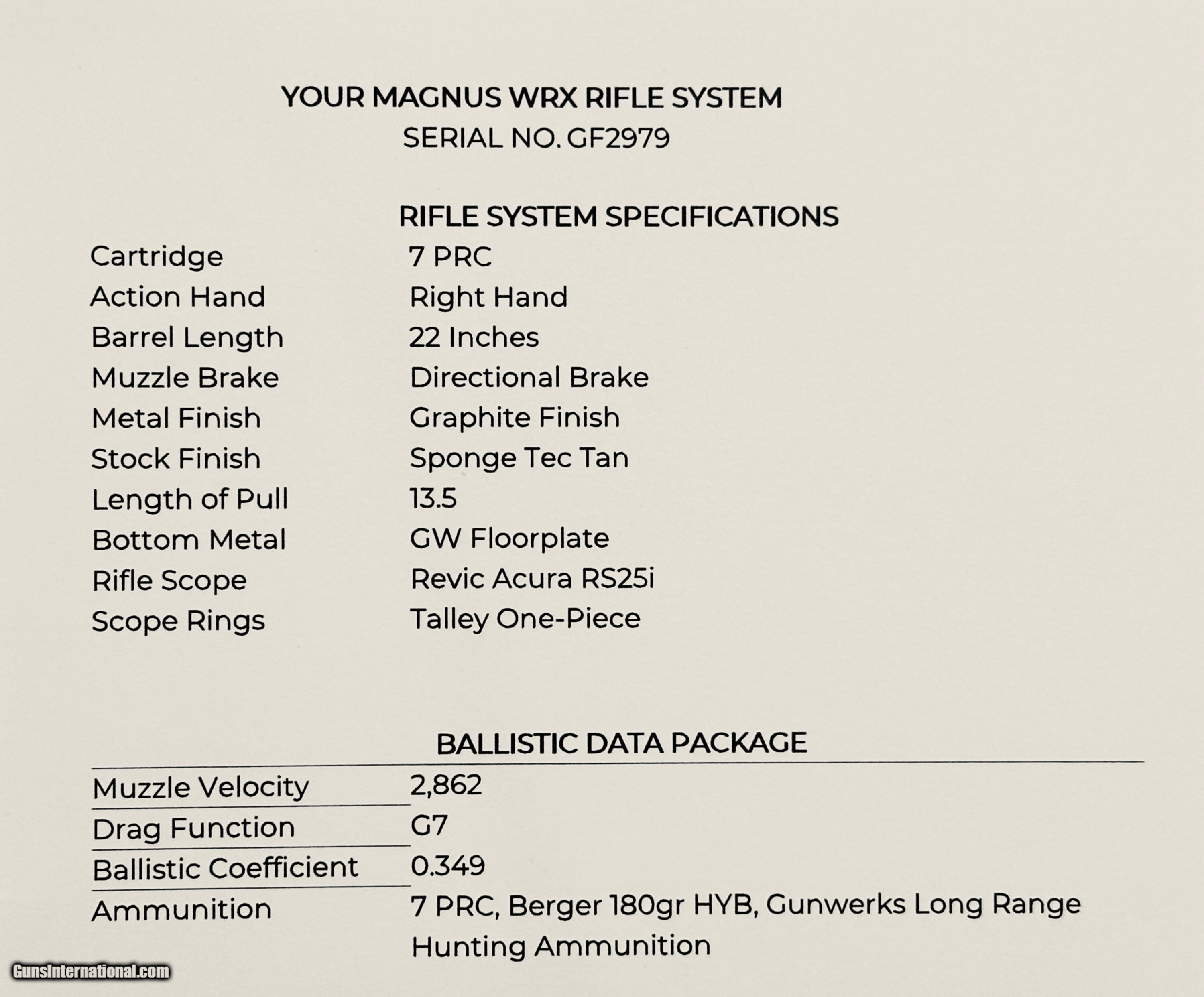 Description: NEW GUNWERKS MAGNUS WRX PROBUILD PACKAGE 7 PRC 22" BARREL, REVIC ACURA RS25i SCOPE W/ FREE 200-RDS AMMO, BIPOD AND HARD CASE - LAYAWAY AVAILABLE The WRX blends Gunwerk's Magnus stock with a stainless steel barrel to give the most balance and shootability for a long-range platform. The optimized geometry of the Magnus stock provides the control needed to execute the most difficult shots and tame heavier recoiling cartridges. The Magnus WRX is configured for hunts where performance matters and opportunities are rare. No compromises can be made when it's time to shoot. Features Of This Great Bolt Action Rifle Include:
