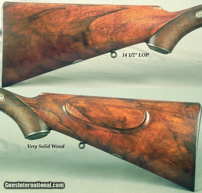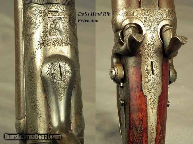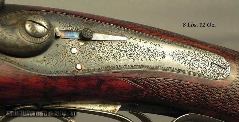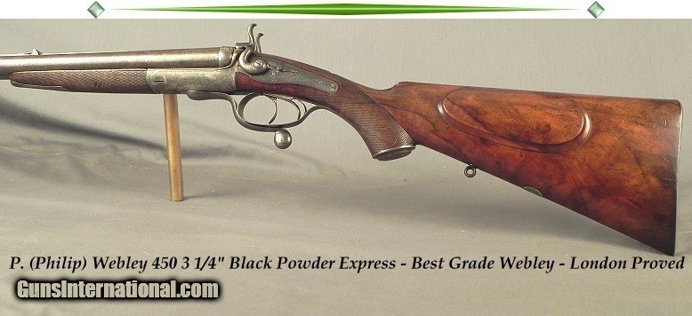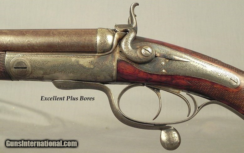 Description: #1216, P. Webley & Son, St. James's, London: A Best Grade Webley That is Totally Original With a Jones Action Underlever Back-Action Lock Non-Rebounding Hammer 450 3 1/4" Black Powder Express Double Rifle Completed by Webley Approximately in 1893, 28" Damascus Henry rifled barrels, Dolls head rib extension, Full length rib with 1 standing & 1 folding rear sights that are platinum or silver lined, Percussion style fences, Stalking hammer safeties to the rear of the hammers, Dolphin hammers, Bushed strikers, Full length trigger guard tang to a steel engraved grip cap, Extremely solid and sound wood with nice color & contrast, Shadowline cheekpiece, Sling eyes, Lever release forend tiedown, 14 1/2" LOP over a steel buttplate, 8 lbs. 12 oz., 70% coverage of classic fine scroll engraving, The original & honest barrel brown remains at 55-60% with near perfect striking, This piece has 30-35% original case colors remaining, The butt & forend are as solid as they were approximately 127 years ago, The original stock finish is at 83-85% and never refinished, The original checkering remains at 90%, The bores remain almost like they did in 1893 and are absolutely excellent plus and totally free of any pits the entire way. This piece is accurate, and all the loading information is available from a very astute rifleman. I have had my fair share of classic pre-turn of the century double guns and rifles and this piece represents a lot of years with very good custodians as it was well kept. As my friend Mr. Wal Winfer would say, "We are but temporary custodians of all things on this planet. Treat this old piece gently. Load and shoot it with care. But, above all, preserve its integrity for the future enjoyment of the next temporary custodian. SOLD Antique: Yes |