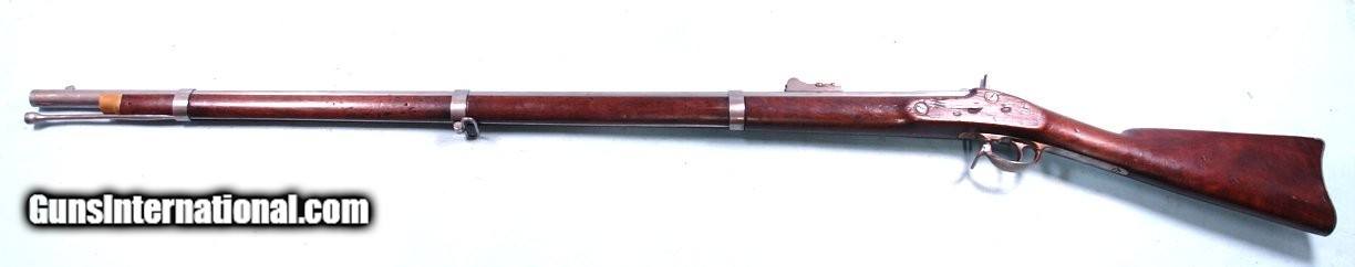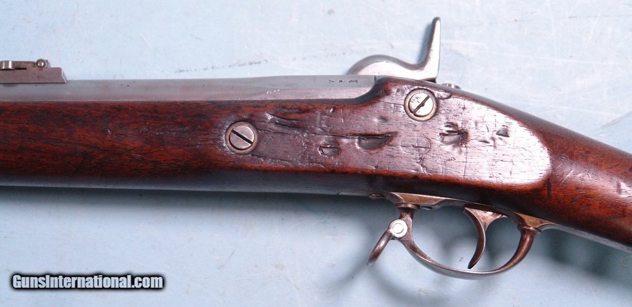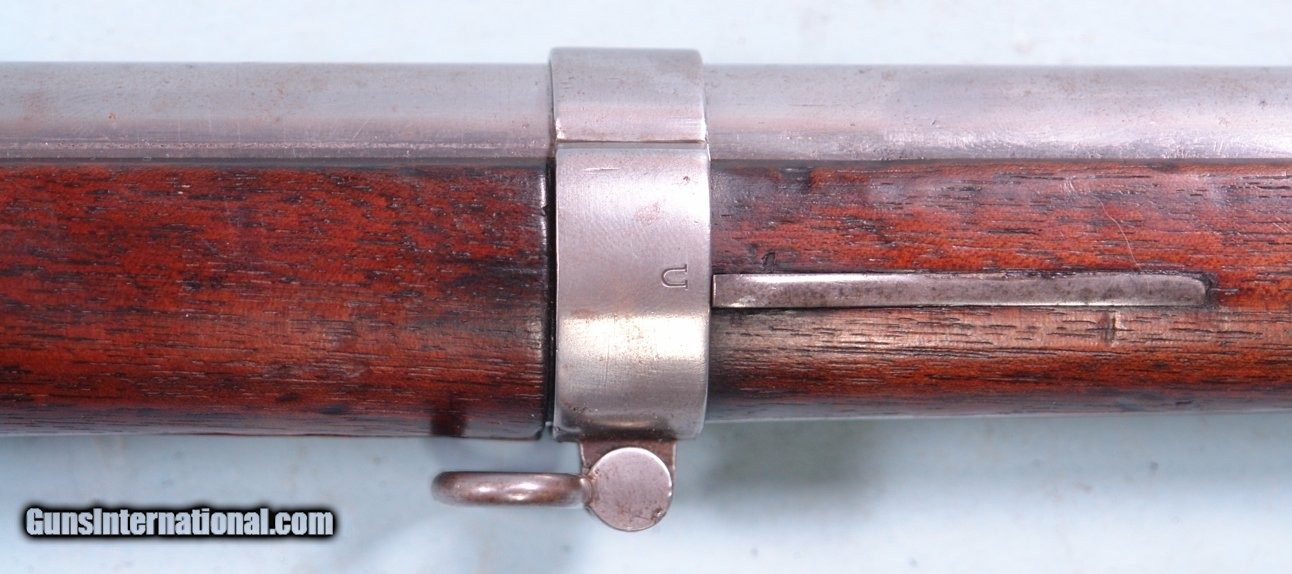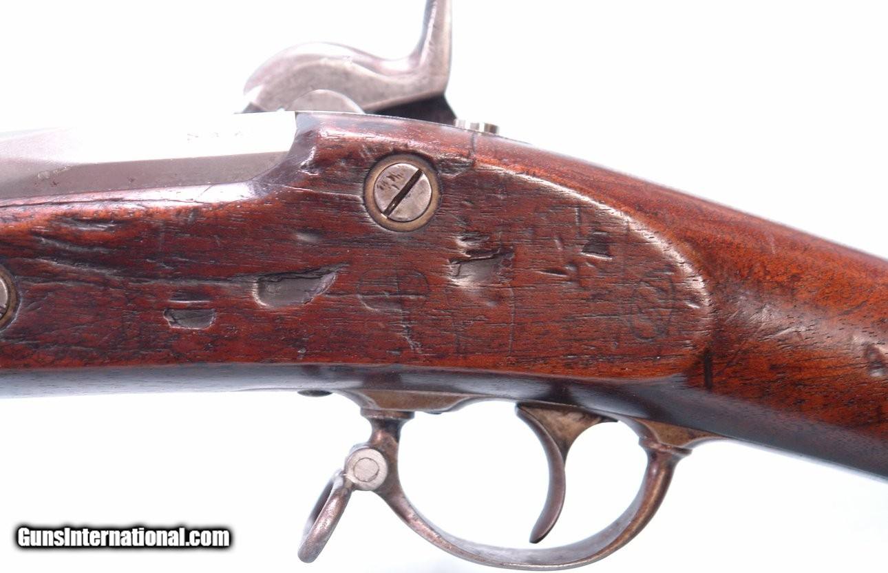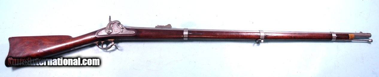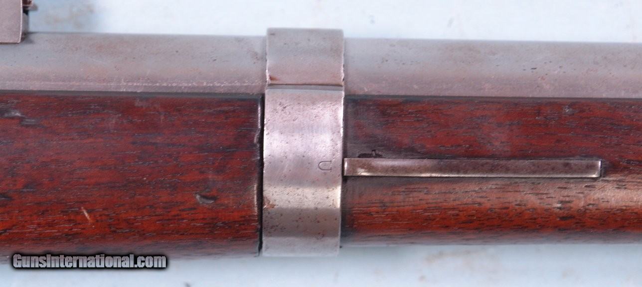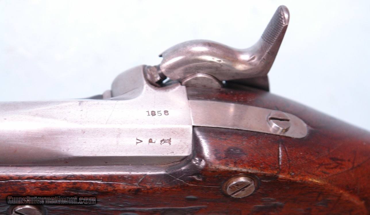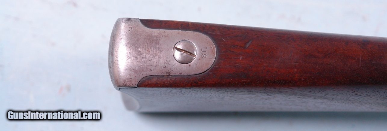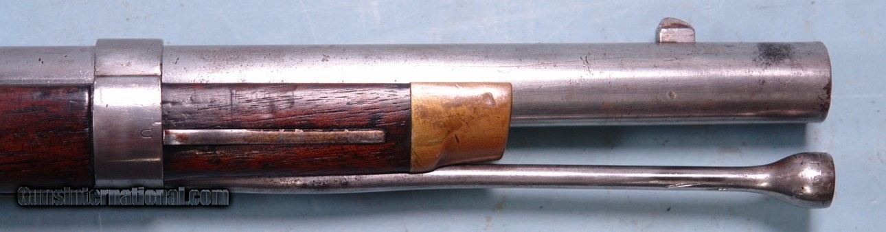 Description: EXCELLENT CIVIL WAR HARPERS FERRY U.S. MODEL 1855 RIFLE MUSKET DATED 1858. Desirable 1858 dated which have the Long Range rear sights and brass forend caps not seen on the later dated Model 1855’s. Considered a Confederate Secondary Martial arm as nearly all were supplied to Southern State Militias before the start of the war. 100% original as issued and with all the original parts including the Maynard Tape Primer parts and the ramrod. Lock and barrel dated 1858 and lock with very sharp “U.S./HARPERS FERRY” stamp . Tape primer door with “EAGLE/SHIELD” motif. Beat of these we have with this date with much original military arsenal bright finish. Stock with all the original finish with very light handling patina. Has two near mint Ordnance cartouches on the side panel. Perfect working order and extra nice bore with very sharp rifling. Exceptional 1858 example very hard to find in this condition as surviving examples very heavily used thru the whole war. SOLD Antique: Yes |