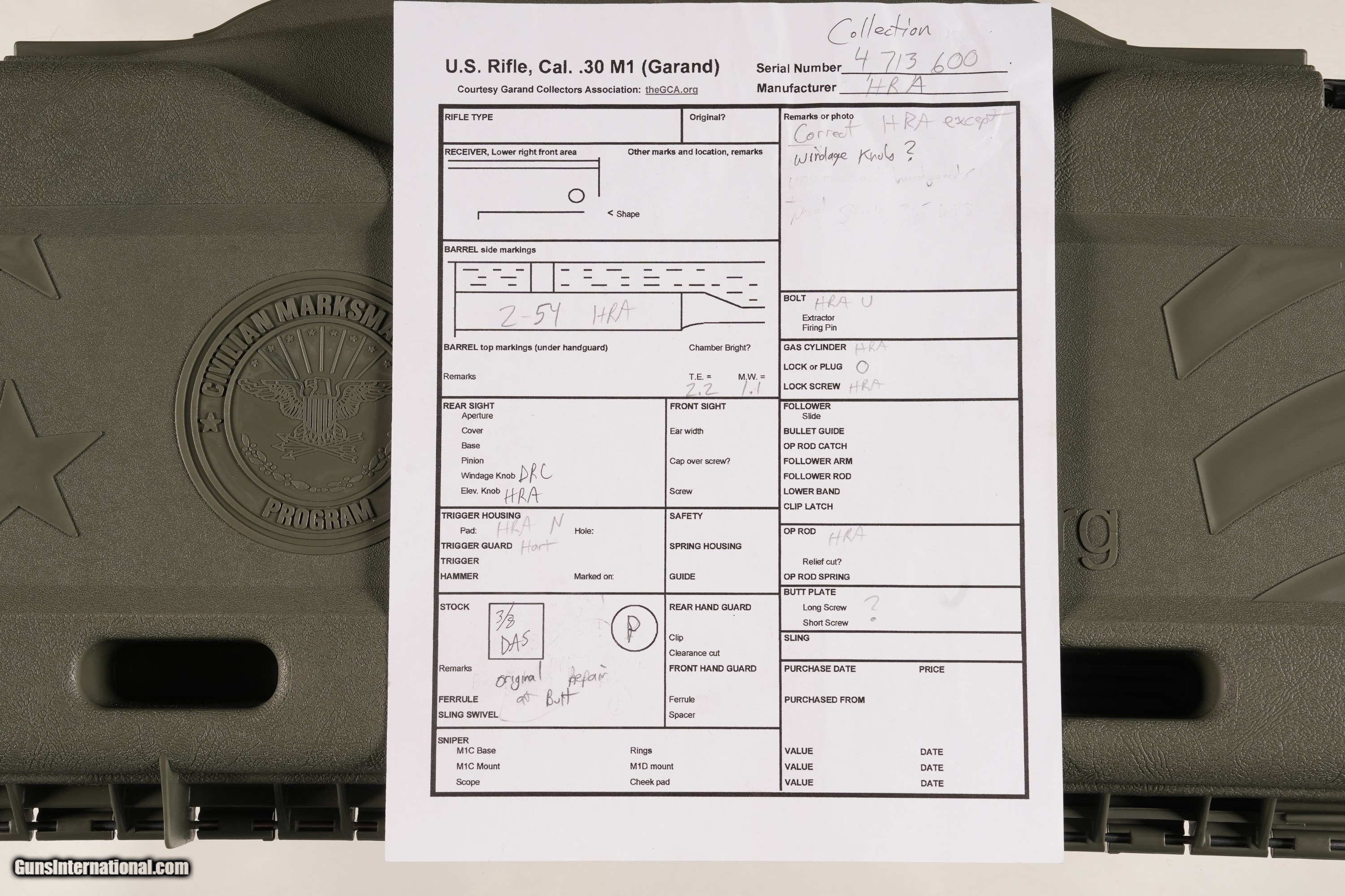 Description: Harrington & Richardson M1 Garand rifle Mfd 1953 with CMP certificate, case, manual and end block clip. Certificate from Grand Collector's assn, attesting to being all correct & authentic. HRA 2-54 Bbl TE=2.2 ME=1.1 Parts inspection certificate asserts all parts with exception of rear sight windage knob as being HRA. Condition, Very fine with most all parkerized finish, Bright fine bore. Excellent stocks with crisp markings. Mechanically fine • Free Shipping, No Credit Card Fees. • Lay-a-way available for this firearm. • 1/3 Down, a 1/3 in 30 Days, 1/3 in 60 Days. SOLD Curio/Relic: Yes Manufacturer: H&R Model: M1 Garand Serial Number: 4713600 Barrel Length: 24 |