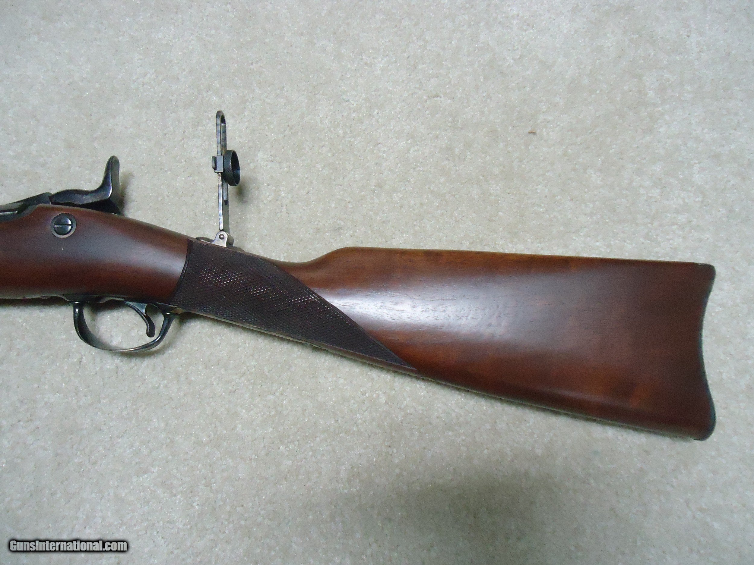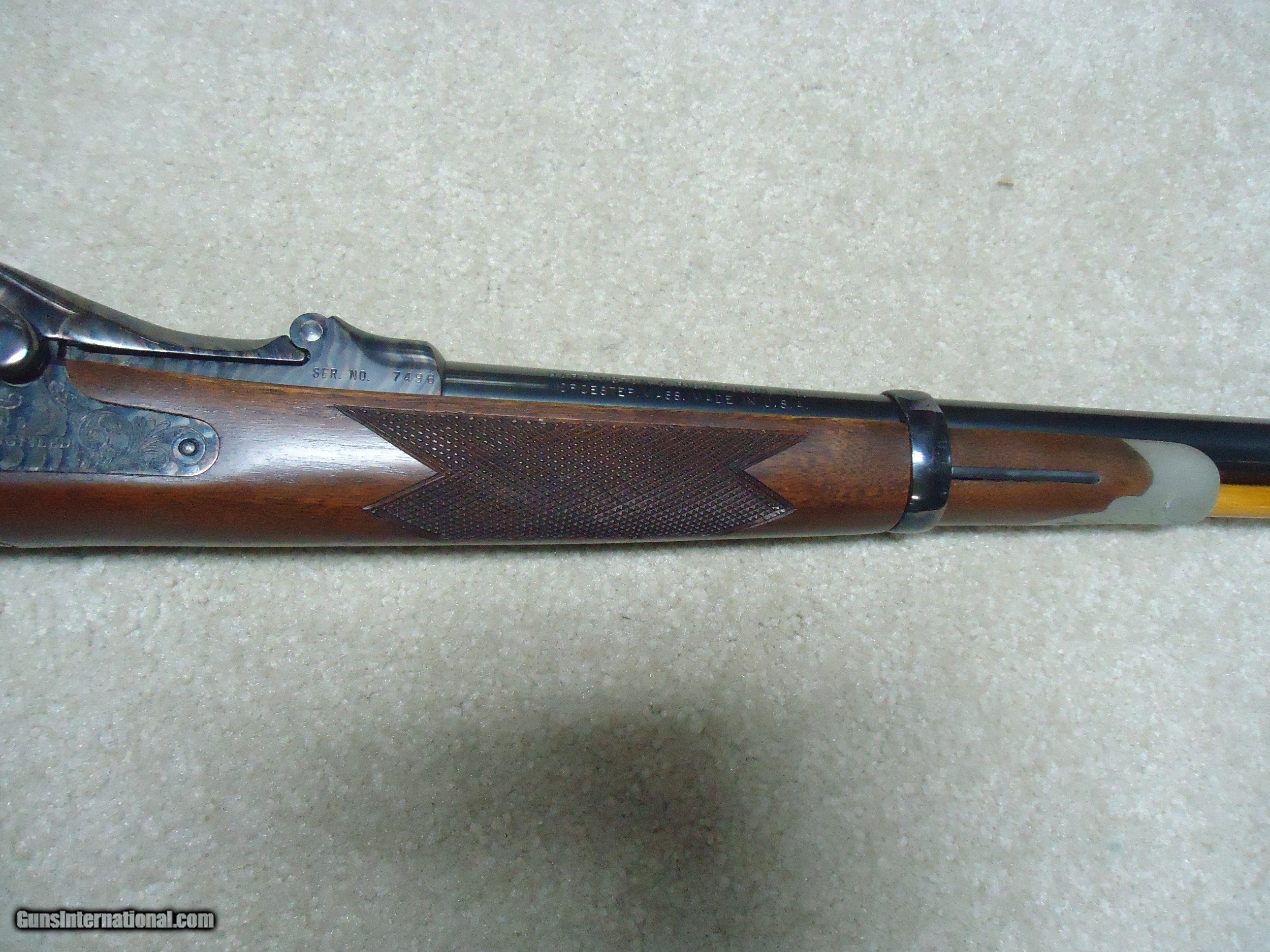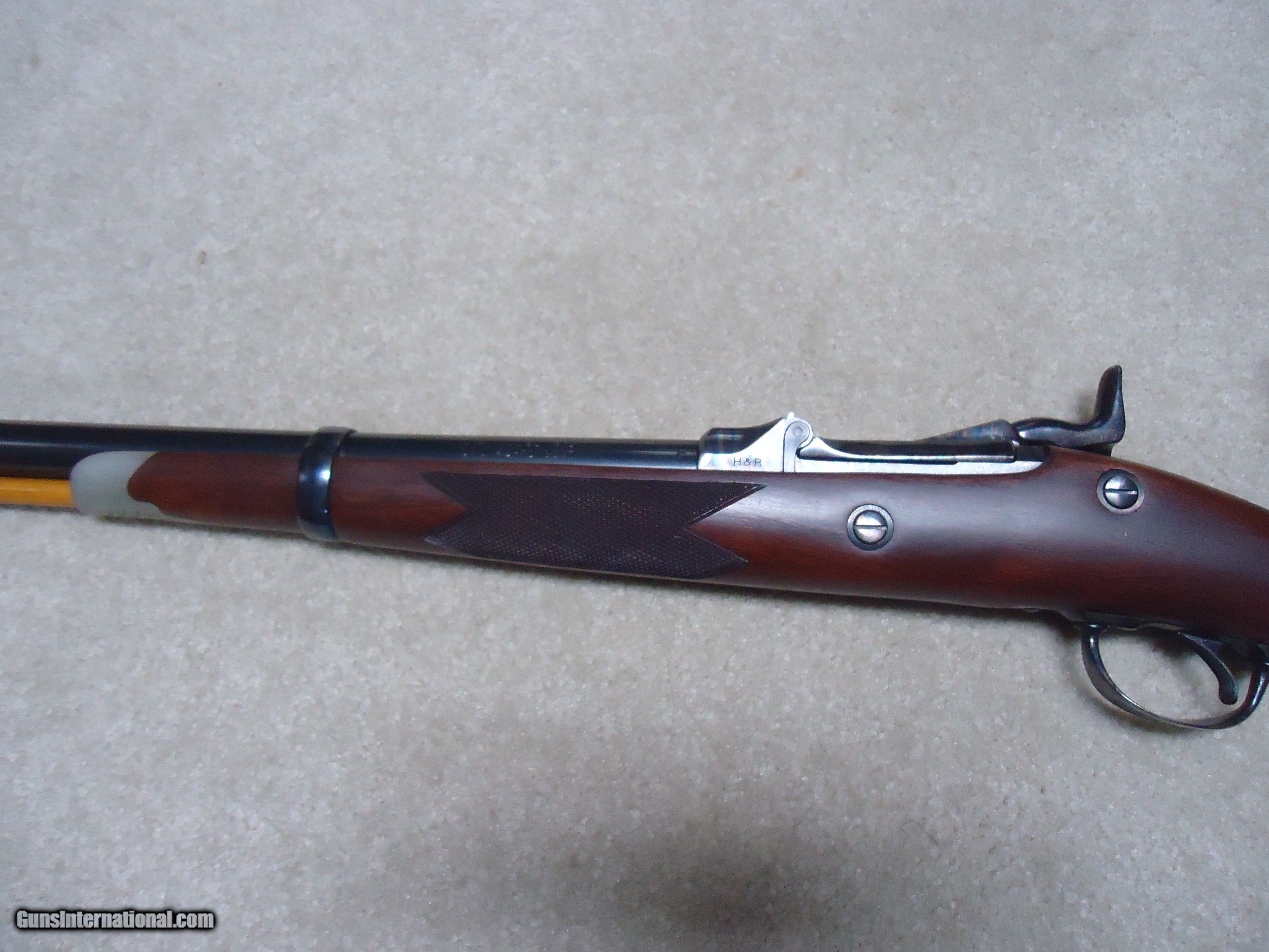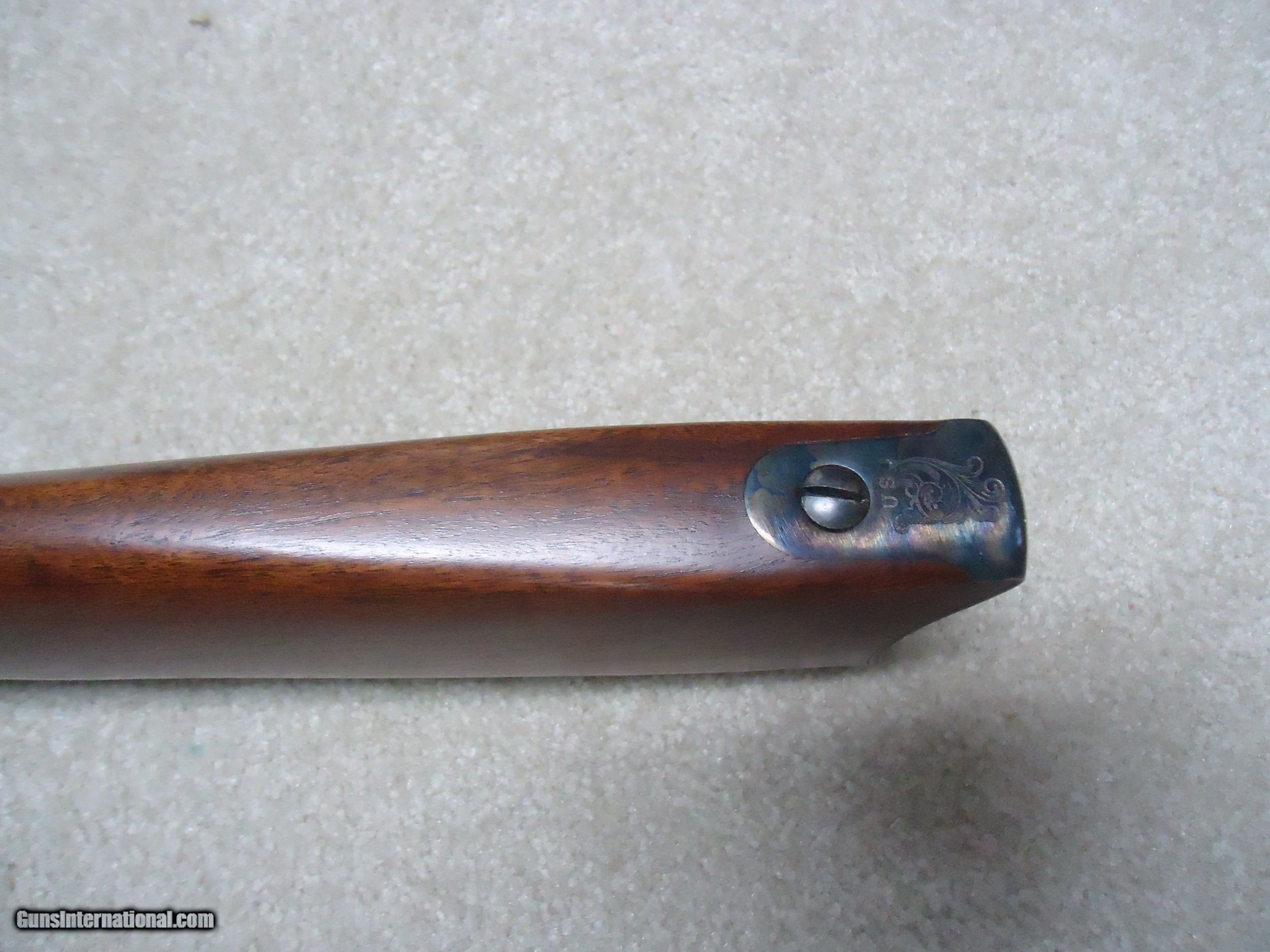 Description: ABOUT NEW CONDITION HARRINGTON & RICHARDSON "OFFICERS MODEL" .45-70 TRAPDOOR. This is a fairly high serial number example, #7XXX. I believe these were made in the 1970s. All American made with all the case colored parts engraved (hammer, breech block, lock plate, trigger guard, barrel band, butt plate etc.). Deeply blued barrel fitted with a wiping rod underneath. Tang sight on the wrist. Sharply checkered walnut stock and forearm with engraved pewter tip. These were an almost exact replica of the Springfield Officers Model of the 1870s (which will bring $20,000+ depending on condition). Great all American Made quality and this one appears unused inside and out. When you can find one, for now these remain a bargain. SOLD Curio/Relic: Yes Manufacturer: HARRINGTON & RICHARDSON Model: OFFICERS MODEL Serial Number: 7XXX Barrel Length: 26 Condition: LIKE NEW Bore Condition: EXCELLENT |
