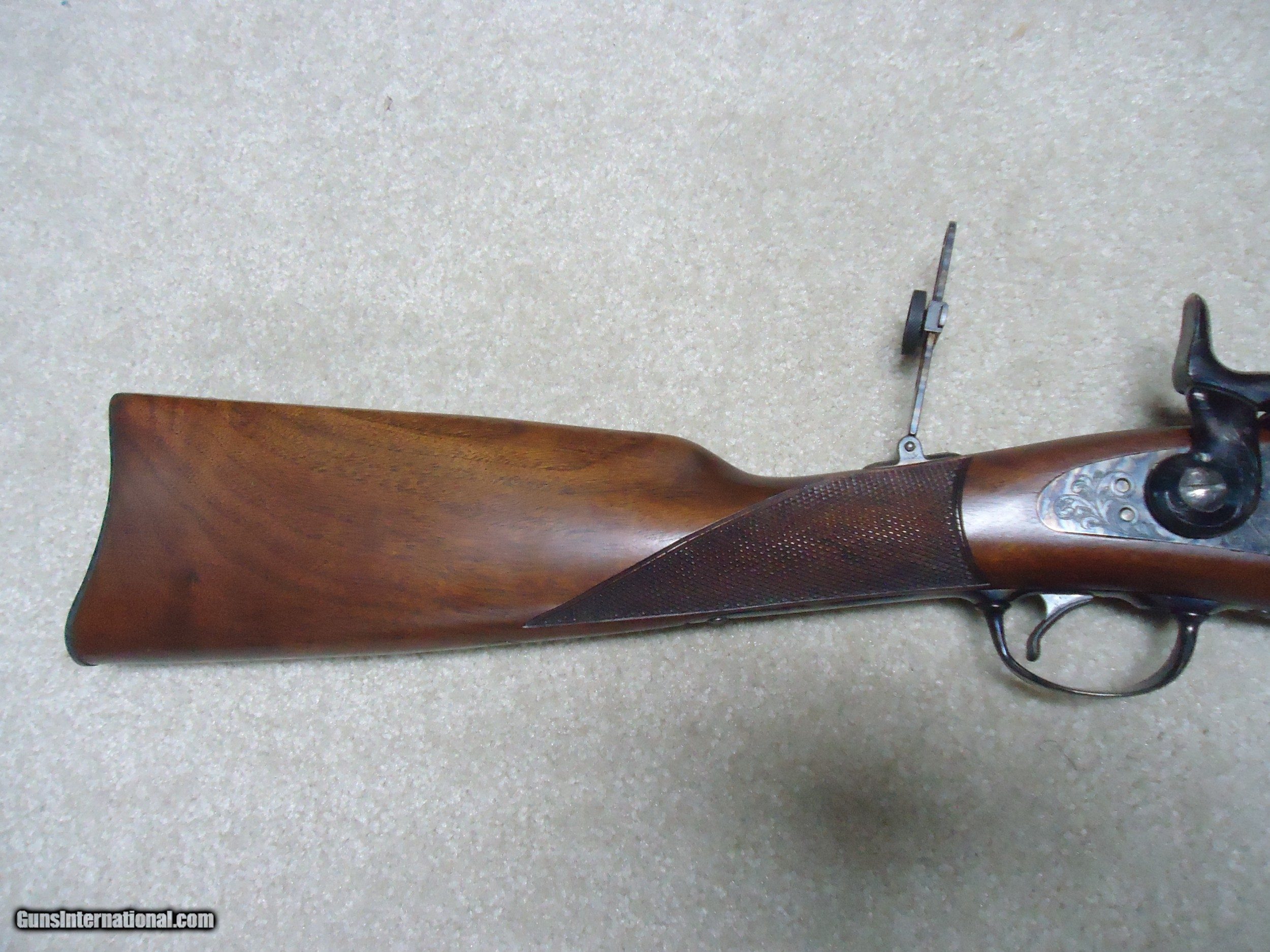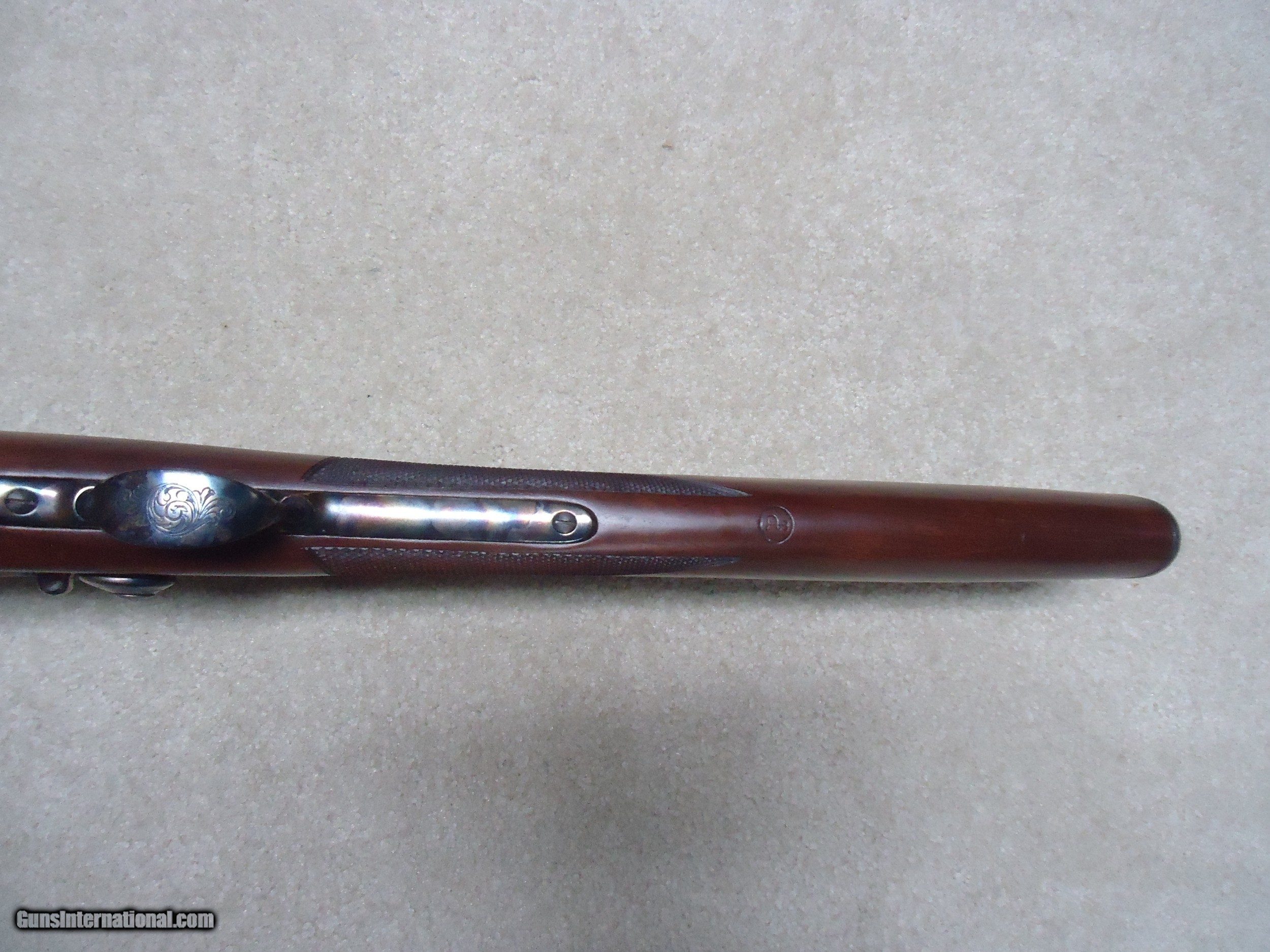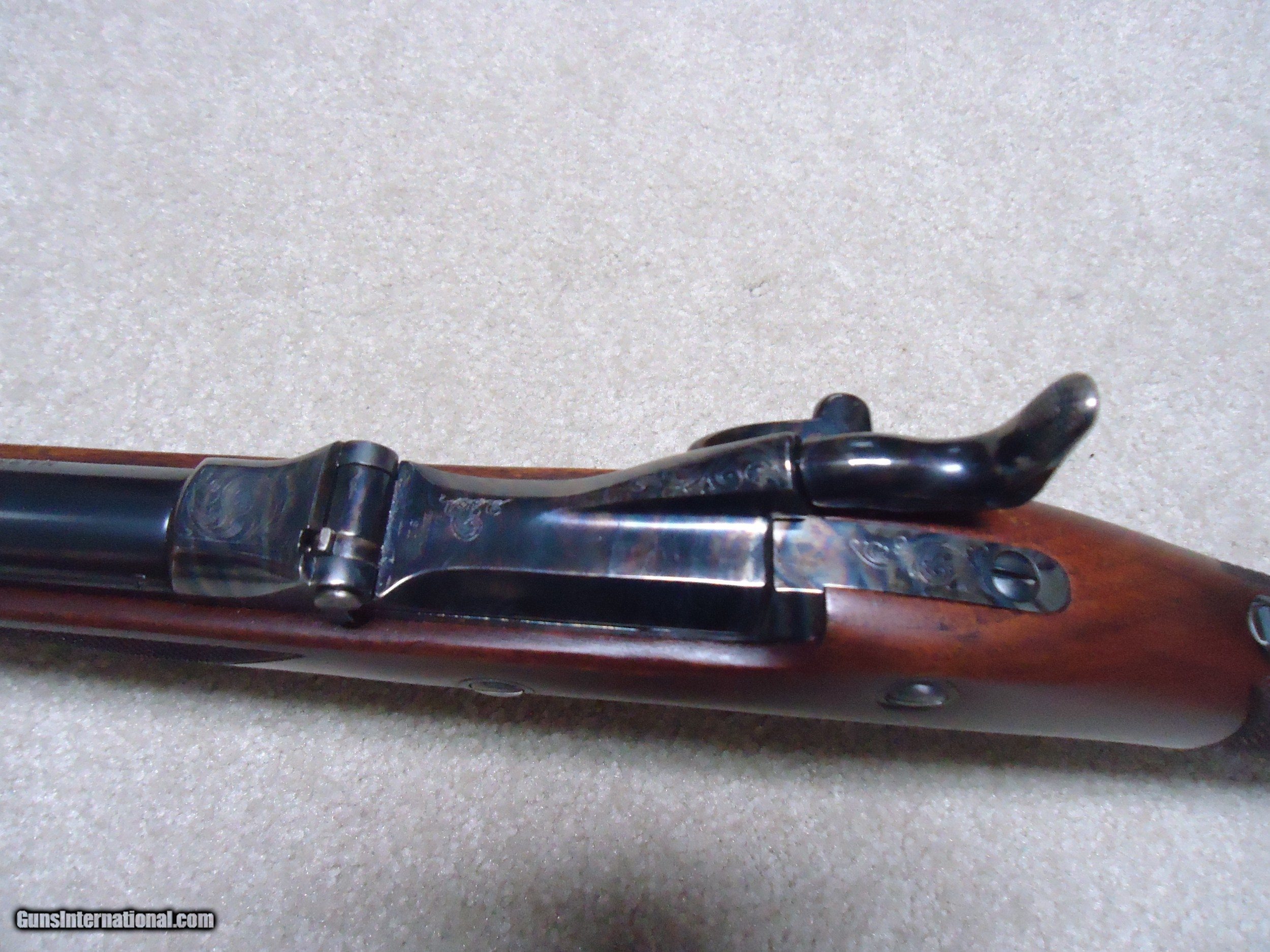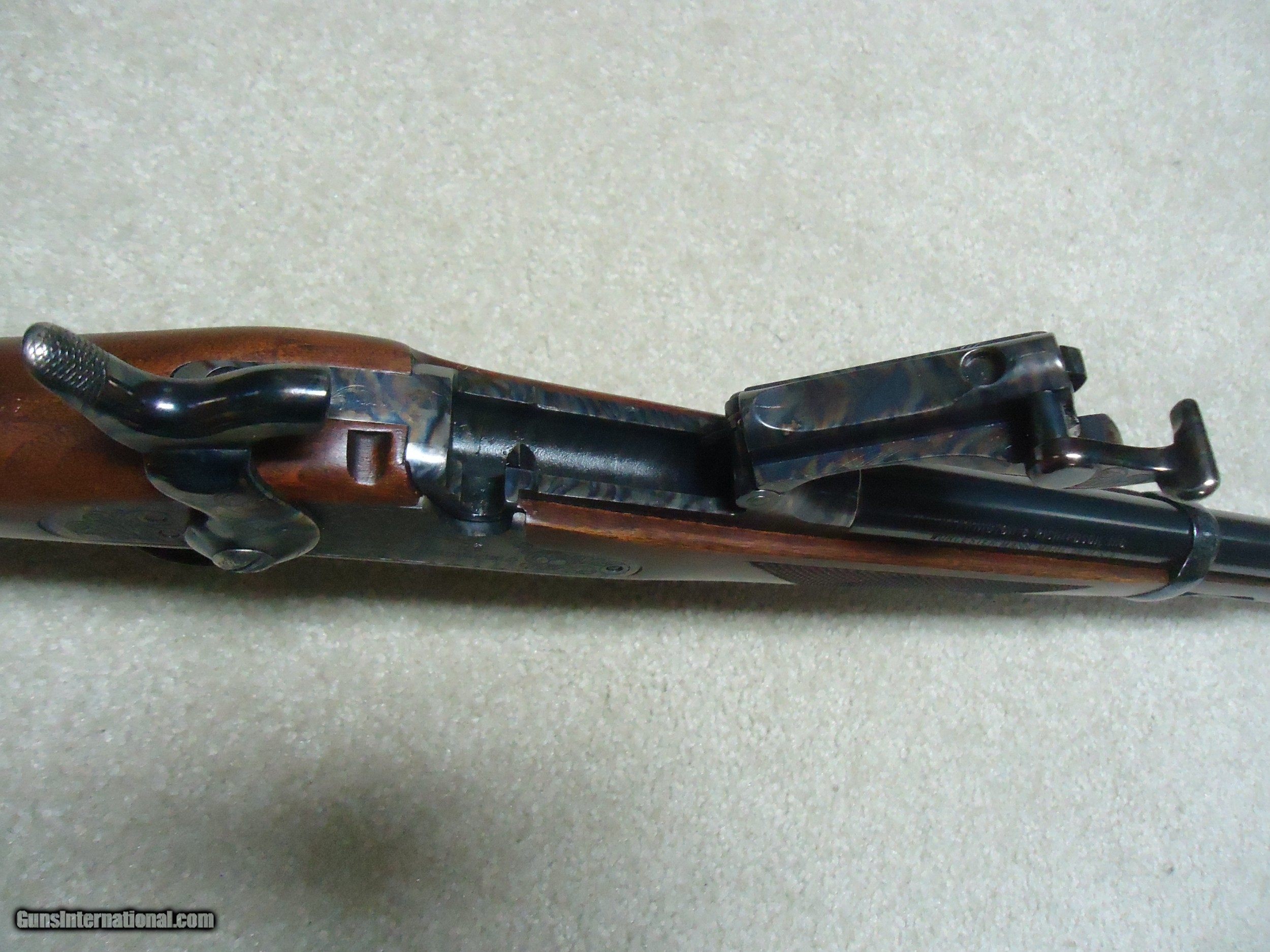 Description: ABOUT NEW CONDITION HARRINGTON & RICHARDSON "OFFICERS MODEL" .45-70 TRAPDOOR. This is a fairly high serial number example, #7XXX. I believe these were made in the 1970s. All American made with all the case colored parts engraved (hammer, breech block, lock plate, trigger guard, barrel band, butt plate etc.). Deeply blued barrel fitted with a wiping rod underneath. Tang sight on the wrist. Sharply checkered walnut stock and forearm with engraved pewter tip. These were an almost exact replica of the Springfield Officers Model of the 1870s (which will bring $20,000+ depending on condition). Great all American Made quality and this one appears unused inside and out. When you can find one, for now these remain a bargain. SOLD Curio/Relic: Yes Manufacturer: HARRINGTON & RICHARDSON Model: OFFICERS MODEL Serial Number: 7XXX Barrel Length: 26 Condition: LIKE NEW Bore Condition: EXCELLENT |
