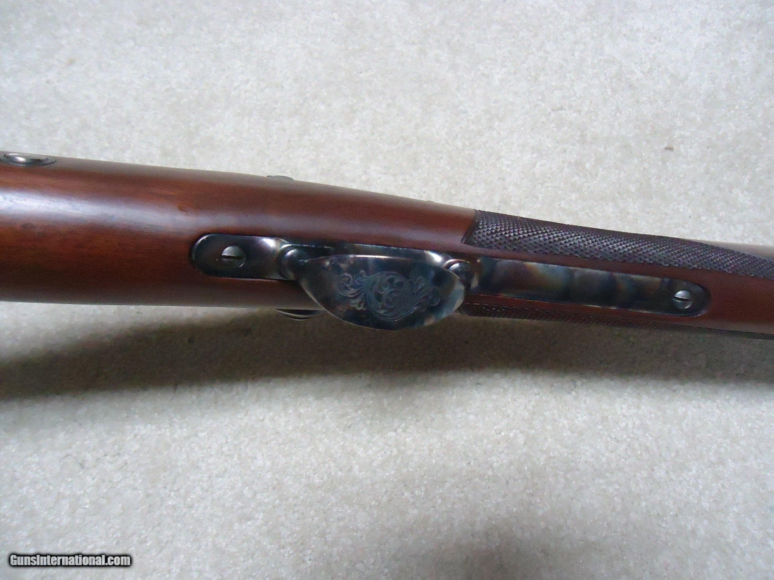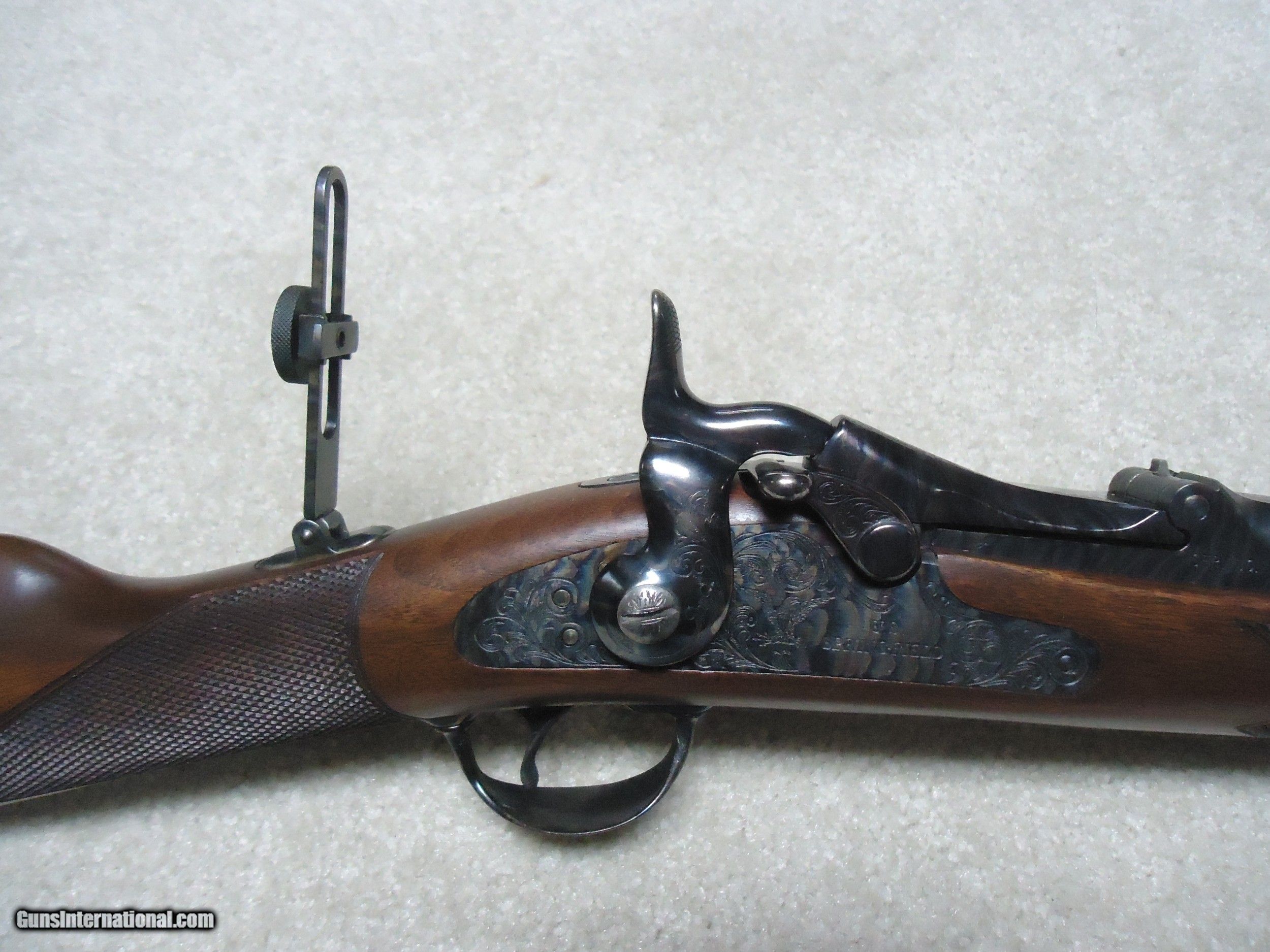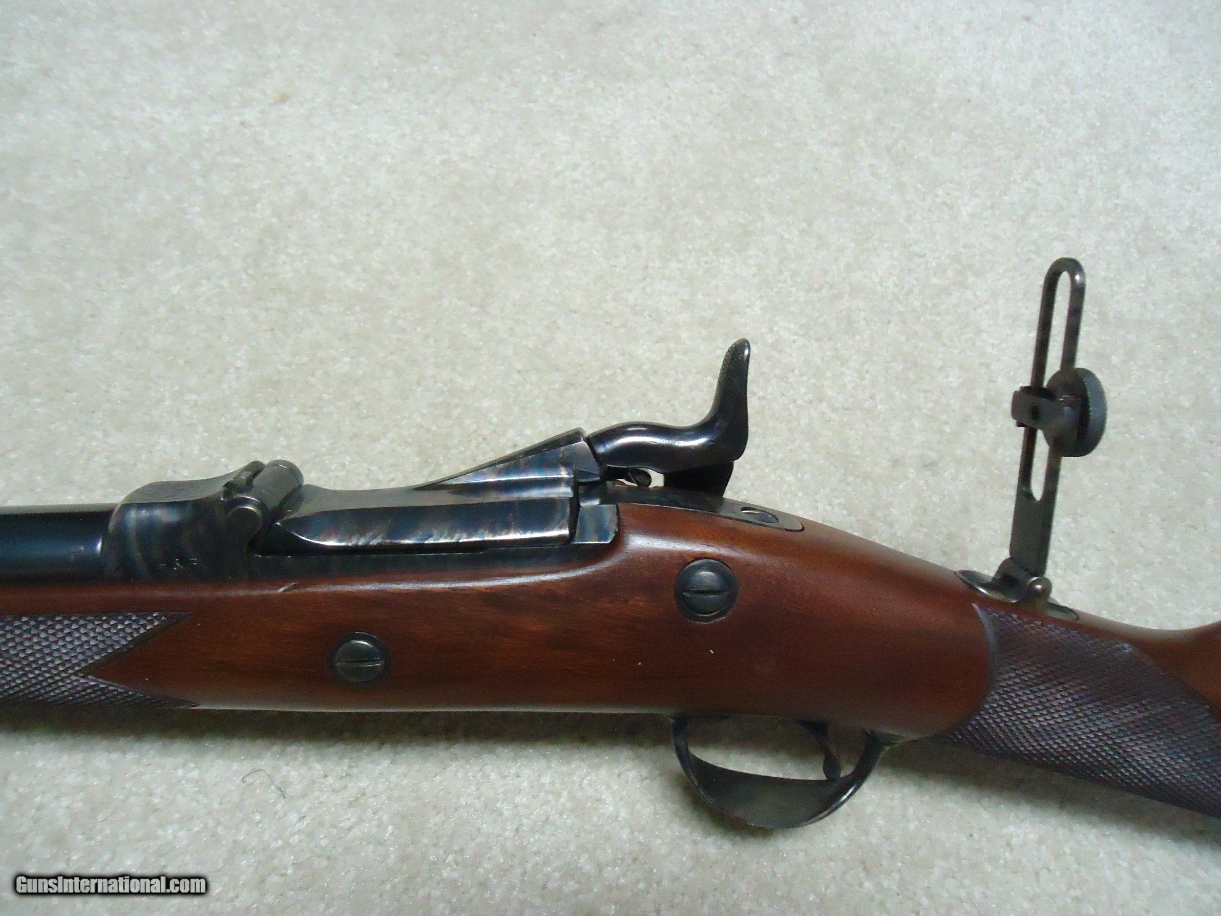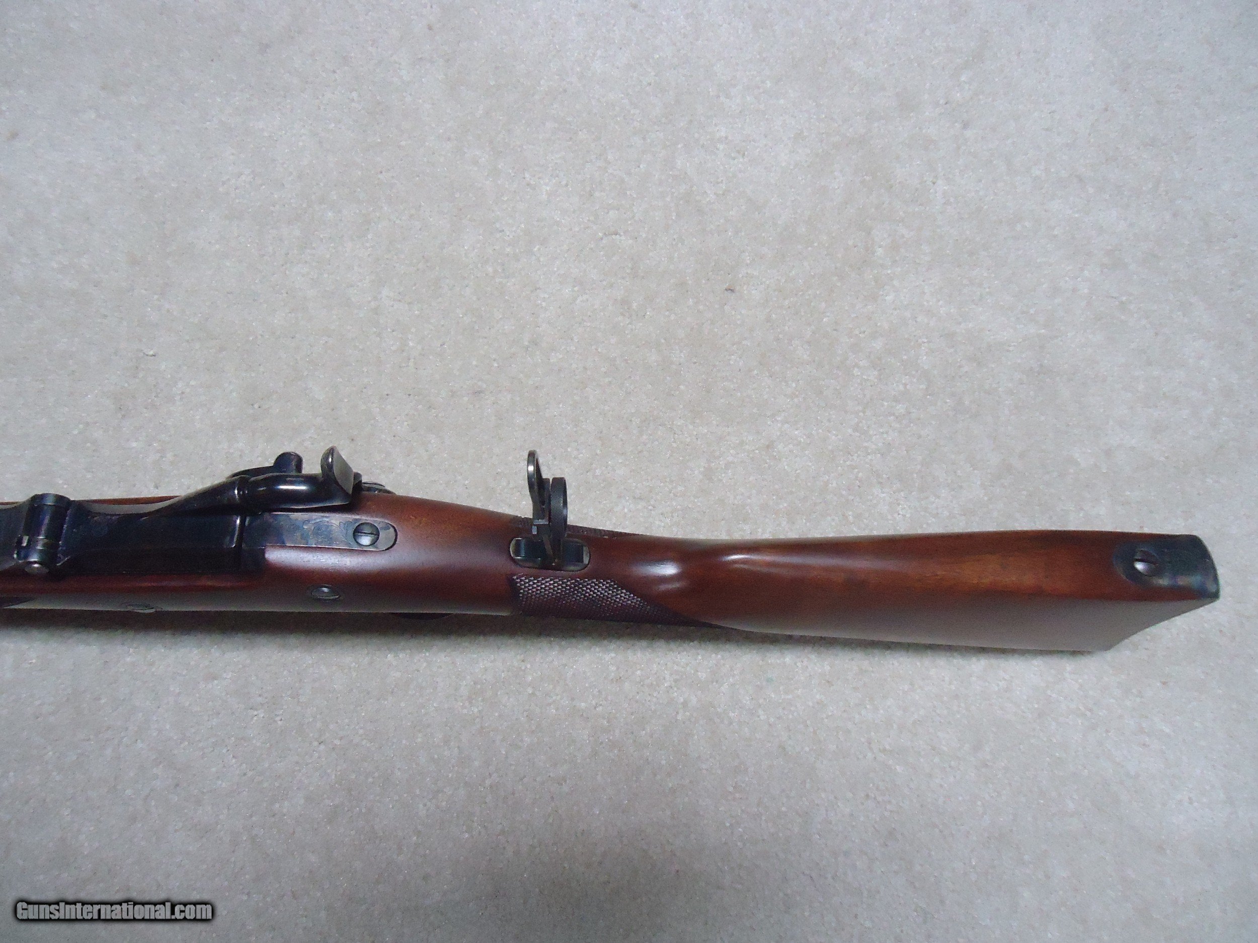 Description: ABOUT NEW CONDITION HARRINGTON & RICHARDSON "OFFICERS MODEL" .45-70 TRAPDOOR. This is a fairly high serial number example, #7XXX. I believe these were made in the 1970s. All American made with all the case colored parts engraved (hammer, breech block, lock plate, trigger guard, barrel band, butt plate etc.). Deeply blued barrel fitted with a wiping rod underneath. Tang sight on the wrist. Sharply checkered walnut stock and forearm with engraved pewter tip. These were an almost exact replica of the Springfield Officers Model of the 1870s (which will bring $20,000+ depending on condition). Great all American Made quality and this one appears unused inside and out. When you can find one, for now these remain a bargain. SOLD Curio/Relic: Yes Manufacturer: HARRINGTON & RICHARDSON Model: OFFICERS MODEL Serial Number: 7XXX Barrel Length: 26 Condition: LIKE NEW Bore Condition: EXCELLENT |