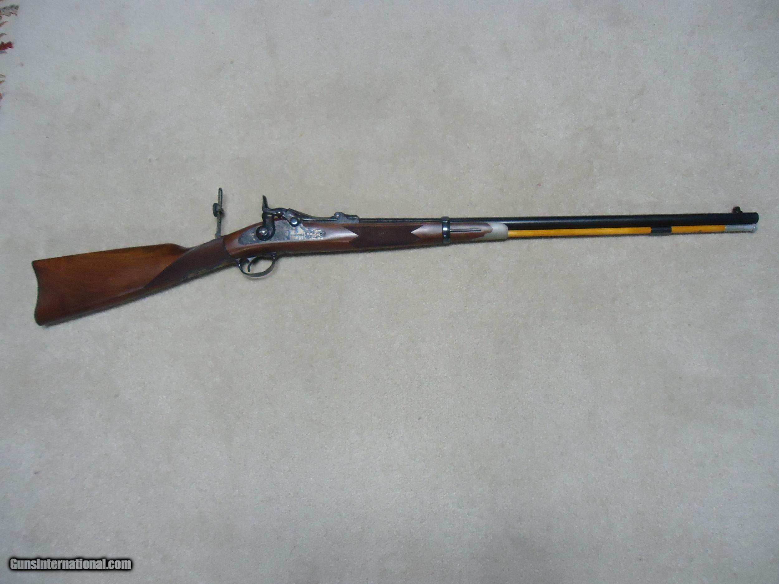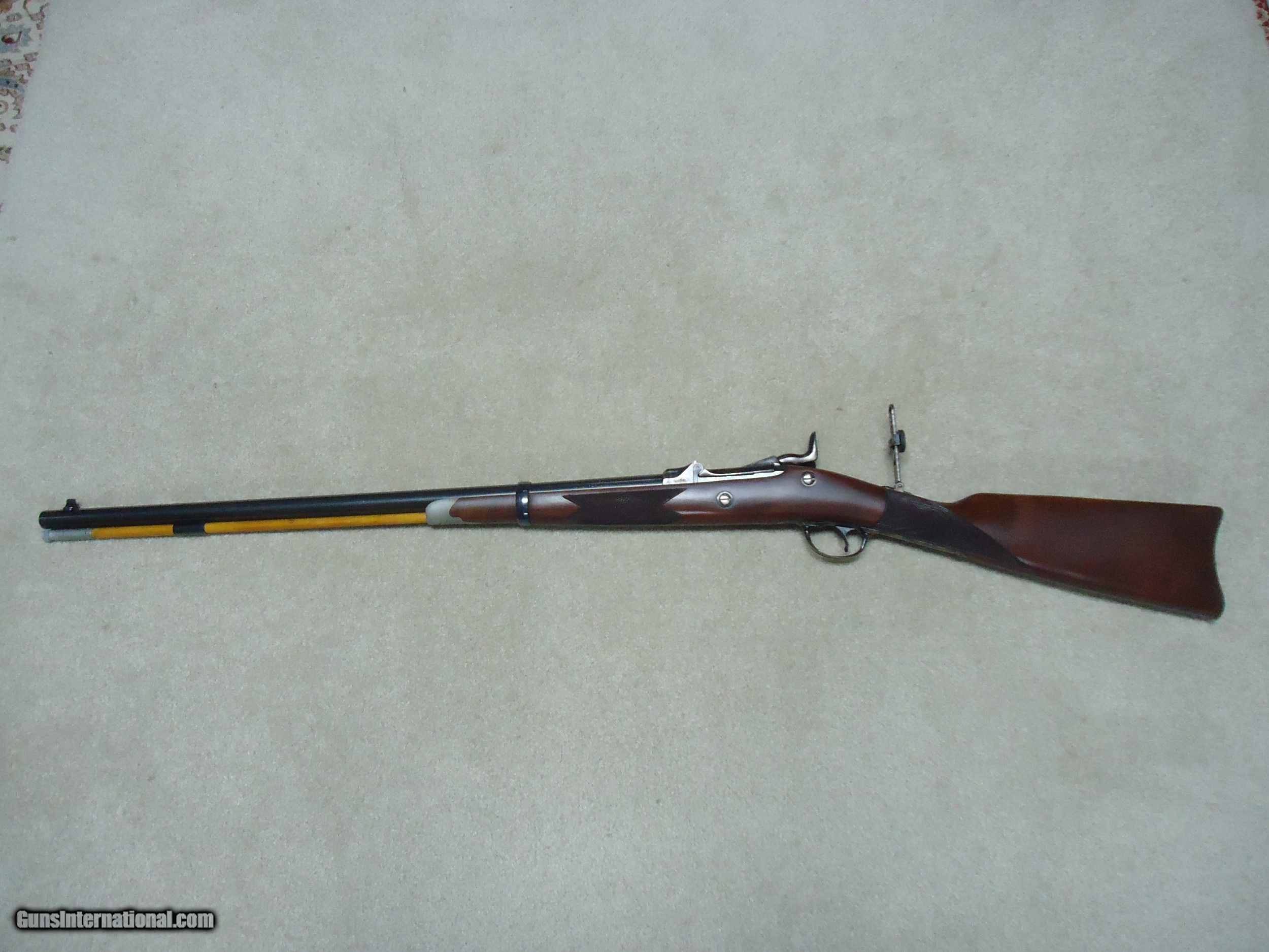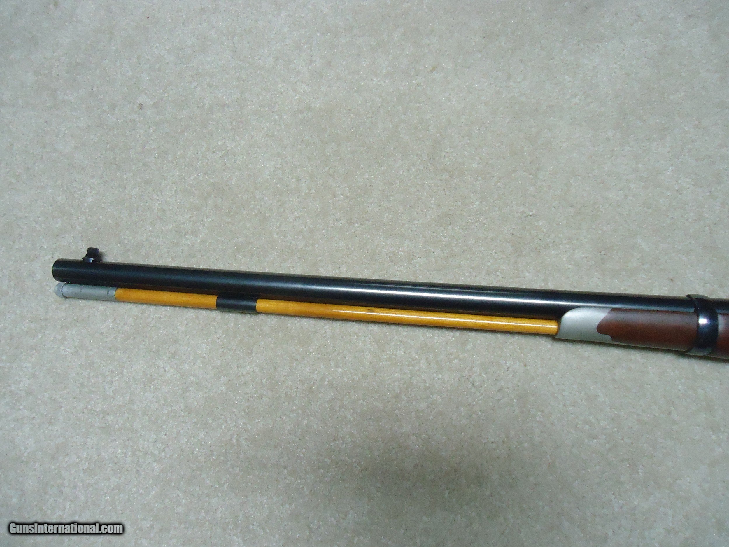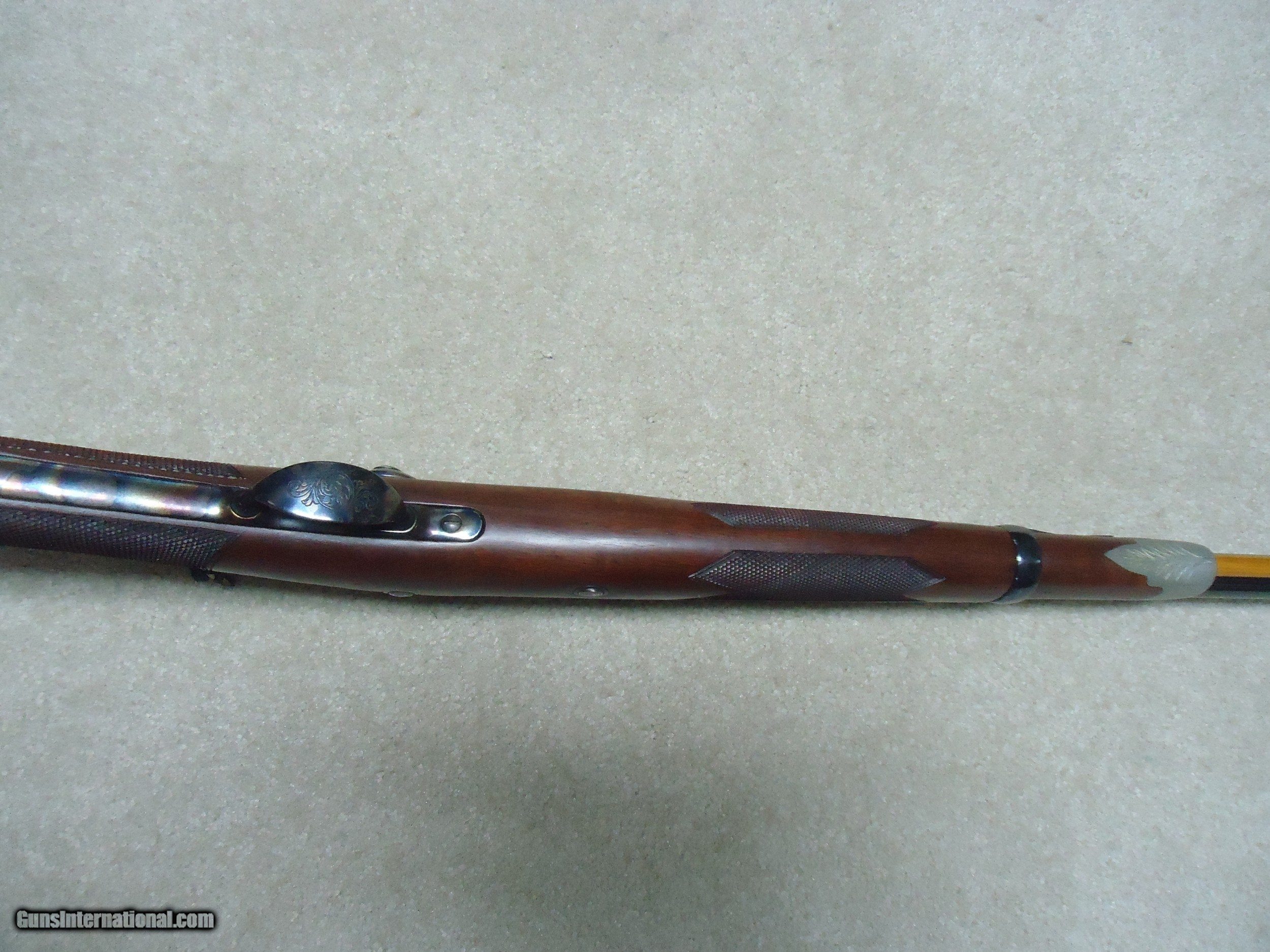 Description: ABOUT NEW CONDITION HARRINGTON & RICHARDSON "OFFICERS MODEL" .45-70 TRAPDOOR. This is a fairly high serial number example, #7XXX. I believe these were made in the 1970s. All American made with all the case colored parts engraved (hammer, breech block, lock plate, trigger guard, barrel band, butt plate etc.). Deeply blued barrel fitted with a wiping rod underneath. Tang sight on the wrist. Sharply checkered walnut stock and forearm with engraved pewter tip. These were an almost exact replica of the Springfield Officers Model of the 1870s (which will bring $20,000+ depending on condition). Great all American Made quality and this one appears unused inside and out. When you can find one, for now these remain a bargain. SOLD Curio/Relic: Yes Manufacturer: HARRINGTON & RICHARDSON Model: OFFICERS MODEL Serial Number: 7XXX Barrel Length: 26 Condition: LIKE NEW Bore Condition: EXCELLENT |