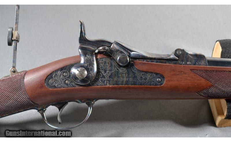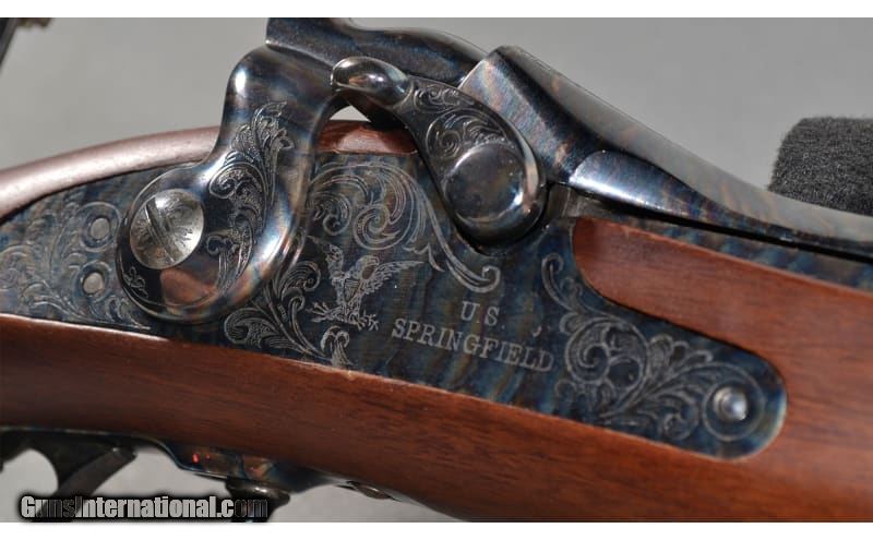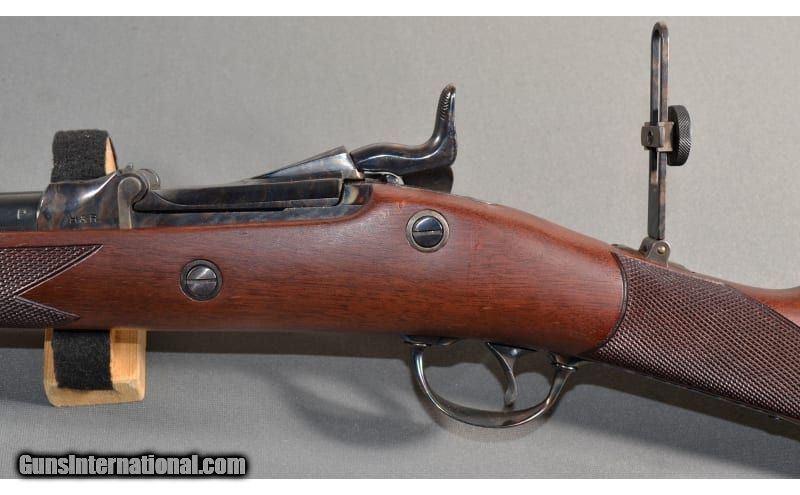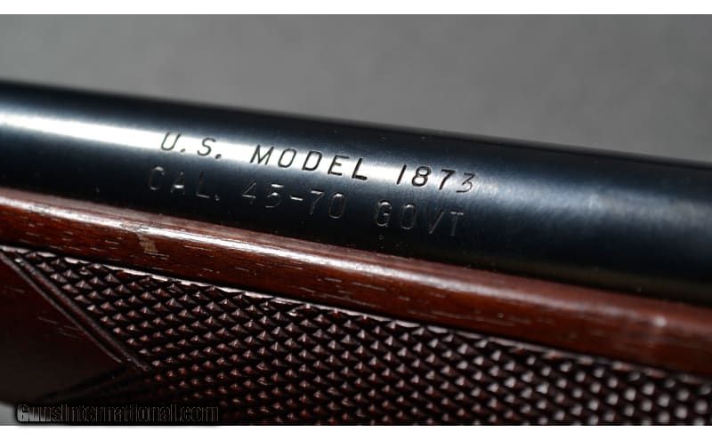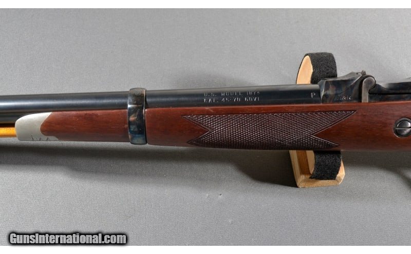 Description: This Harrington & Richardson Springfield Model 1873 Trapdoor replica chambered in 45-70 Government is a modern reproduction of the Springfield Model 1873 Officer's Rifle. It has a cleaning ramrod, an engraved receiver and lock, case color lock, hammer, receiver, trigger guard and butt plate. This firearm has some handling marks near the tang and barrel band. .45-70 Government SOLD Metal Condition: Very good with a few small scratches Wood Condition: Very good with a few small scratches Bore Condition: Clean with bright lands Barrels: 26 Stock Dimensions: 13 1/4" LOP Fore End: Checkered oil-finished walnut Butt Pad: Curved color case steel Weight: 7 lbs. 8 oz. Sights: "Blade front, tang-mounted aperture rear Item Location: Lacey, WA |