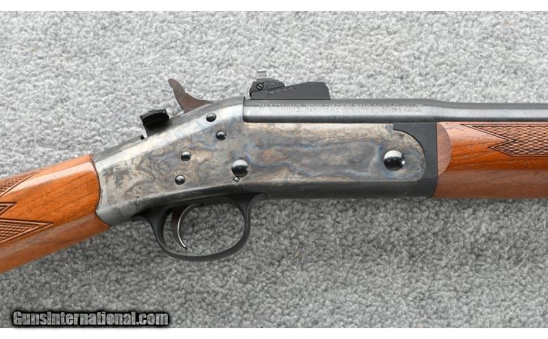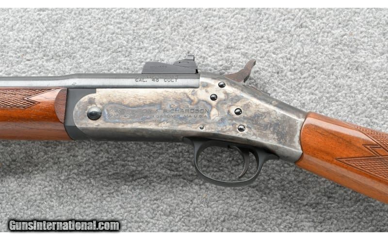Description: Introduced in 1995 along with the rifle version in .45-70 and .38-55 the carbine in .45 Colt is a handy and fun single shot. Harrington & Richardson ceased operations in 2015 .45 Colt SOLD Chambers: .45 Colt in a break action single shot rifle Metal Condition: Very good few small scratches Wood Condition: "Very good, with a couple of scratch marks on the butt stock Bore Condition: Bright and Sharp Barrels: 20 Triggers: Factory Stock Dimensions: 13 1/2" LOP Fore End: Checkered walnut with Schnabel tip Butt Pad: Case colored metal crescent Weight: 6 Lbs. 2 Oz. Sights: "Drift adjustable blade front, Williams adjustable aperture rear Item Location: Grand Junction, CO |