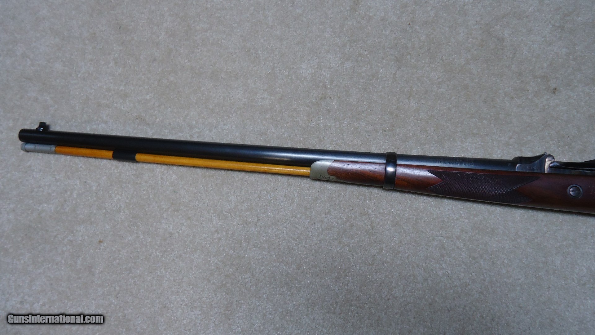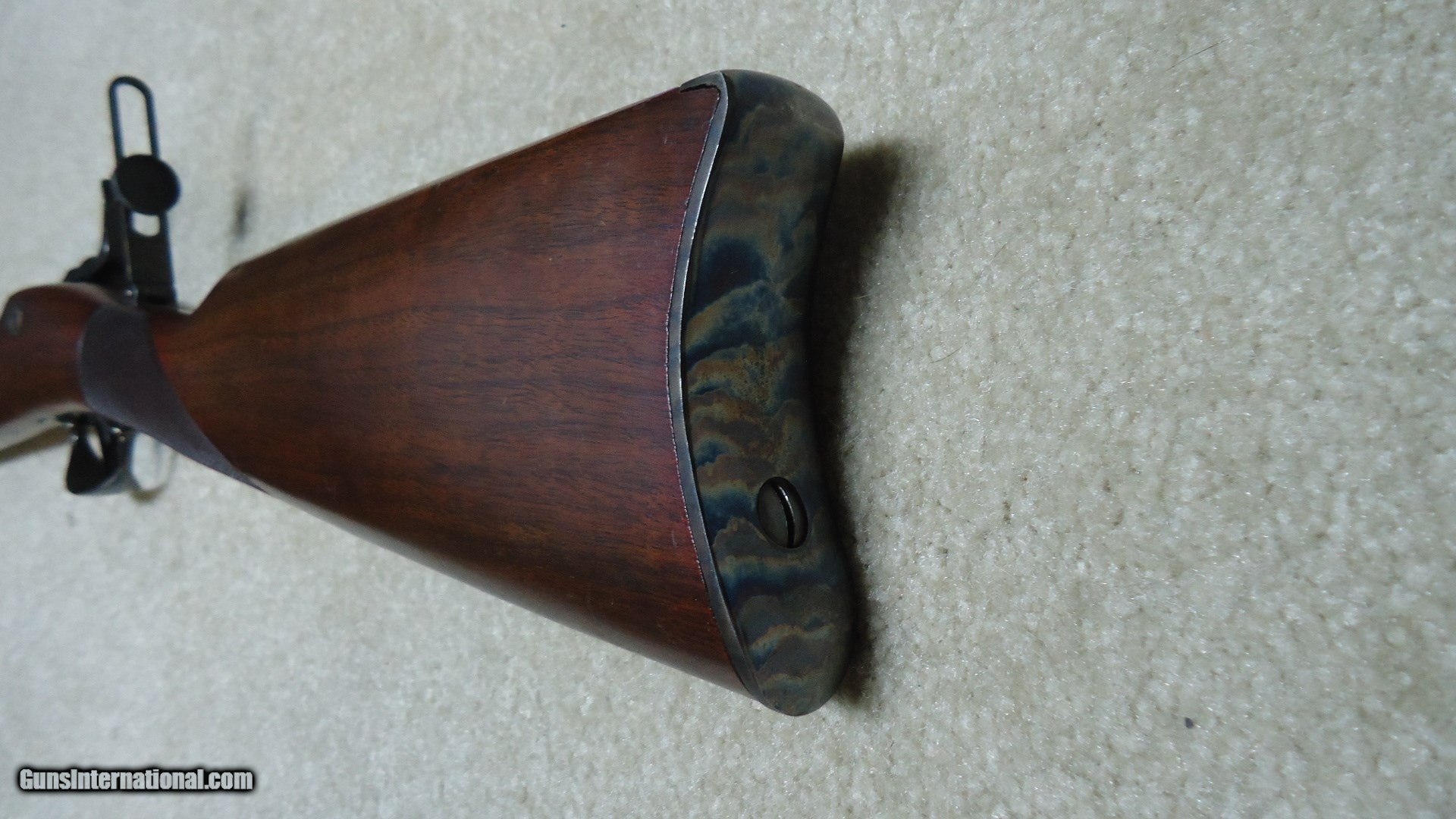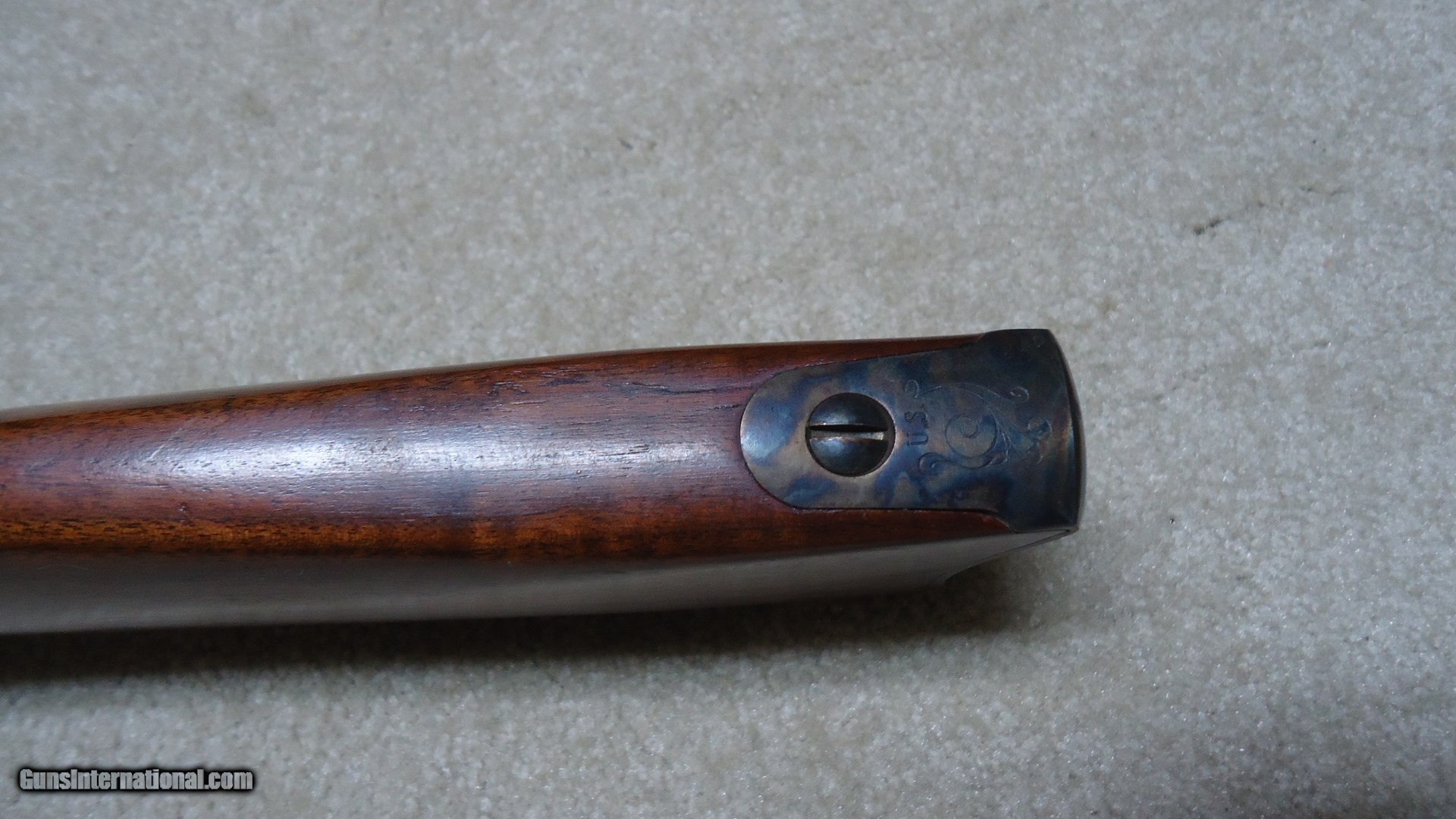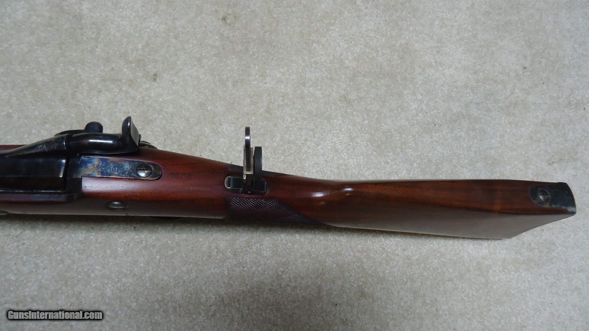 Description: HARRINGTON AND RICHARDSON MODEL 1873 OFFICERS MODEL TRAPDOOR SPRINGFIELD, .45-70 CALIBER. I believe these fine American made replicas were made from 1975-1981. Copied from the originals, they feature checkering, tang sight, wiping rod, engraved case colored action, lock plate, trigger guard and hammer, and engraved pewter forend tip. It also has a tall blade/bead front sight on the 26” barrel to match up nicely with the tang sight. These are fine rifles that don’t turn up for sale much anymore. Aside from a couple of tiny handling marks in the wood that are too minor to describe, it is in near new condition. These are still a bargain. SOLD Manufacturer: HARRINGTON & RICHARDSON Model: 1873 OFFICERS MODEL TRAPDOOR Serial Number: 3XXX Caliber Info: .45-70 Condition: Excellent Barrels: 26" |