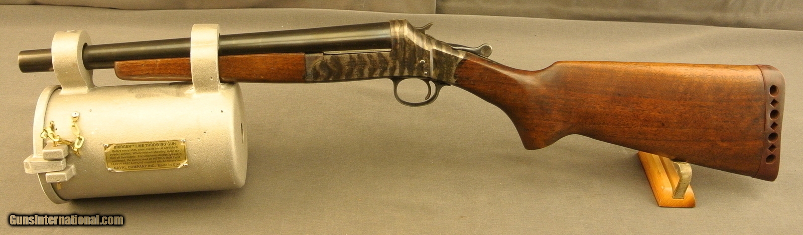 Description: SN DR4881, H&R single shot break top gun in .45-70 Blank cal. .45-70 is marked on the barrel top and marked on the left frame "Re-enforced breech." The 14 1/4" barrel is designed to accept a weighted brass projectile for throwing line. Plain walnut stocks with a recoil pad marked "Harrington" a bright bore with one patch of corrosion near the chamber. Attached is a newly made line holder from the original maker, Bridger, who is still in business. Very nice case color on the frame and 98% bright blue on the barrel. *Warning* The Line holder must remain attached to the "thrower" for legal purposes. If removed the thrower becomes an illegal short barreled, smooth bore rifle. FFL SOLD Manufacturer: H&R Model: Linegun Caliber Info: .45-70 Gauge Info: .45-70 |
