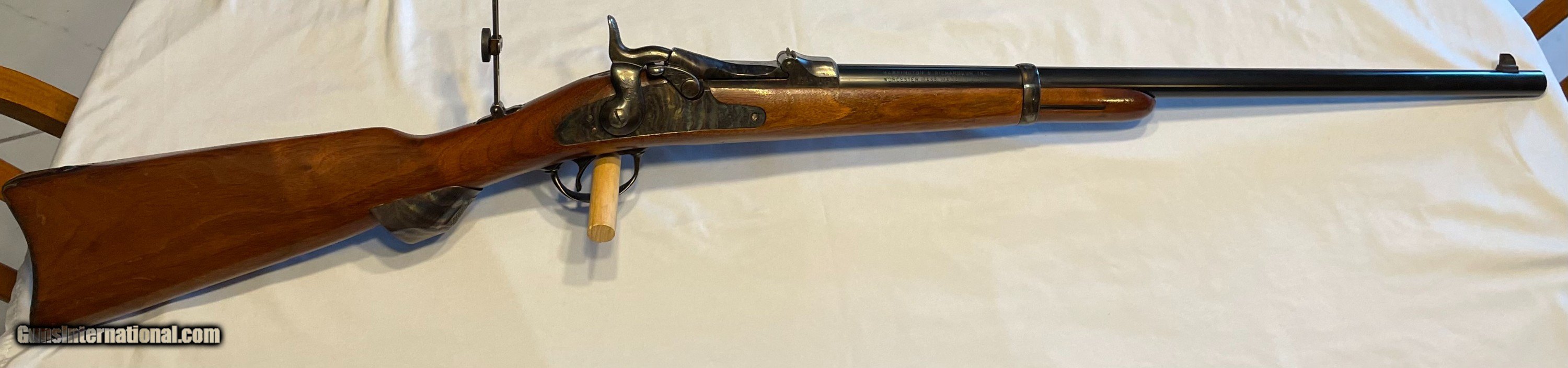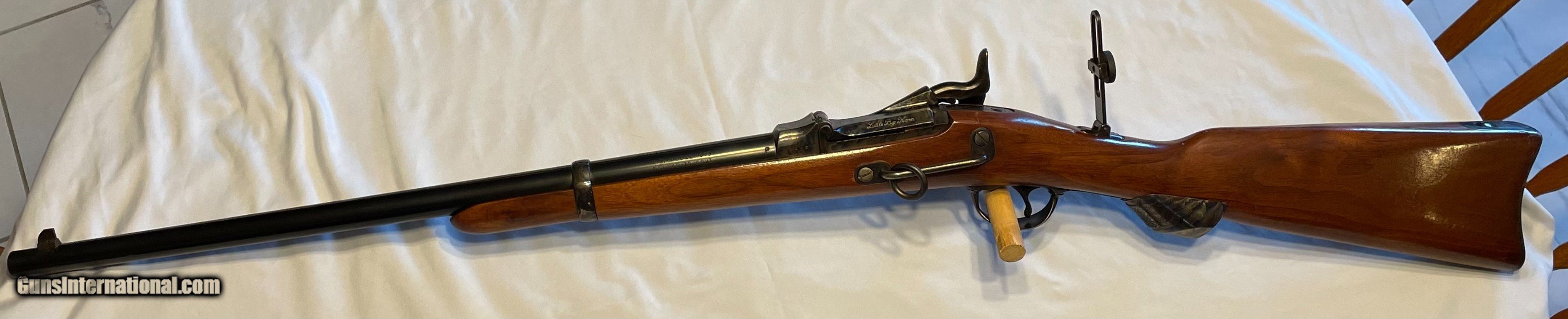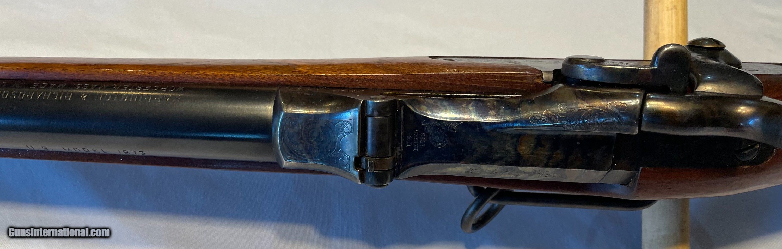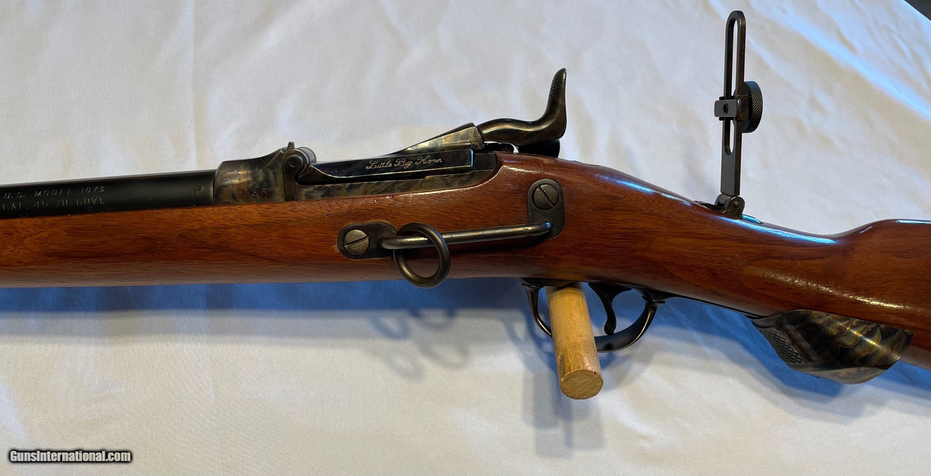 Description: Harrington & Richardson US Model 1873-Little Big Horn Commemorative rifle - 45-70 Serial #LBH169X. Unfired and mint condition. From local estate. No California sales. SOLD Rifle Caliber: .45-70 Government Manufacturer: H & R Model: US Model 1873 Serial Number: LBH1696 Condition: near mint Metal Condition: Unfired |