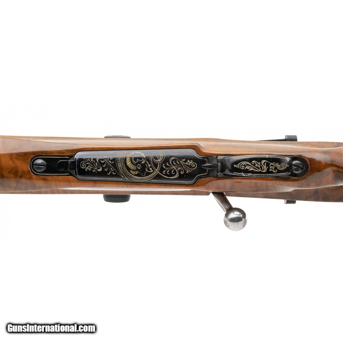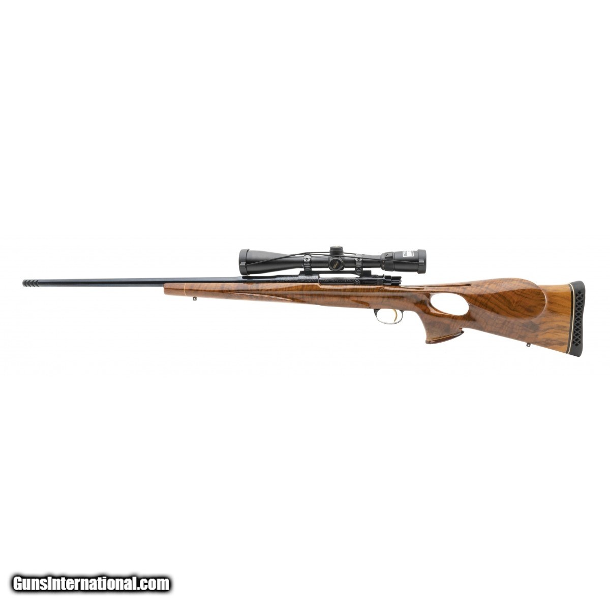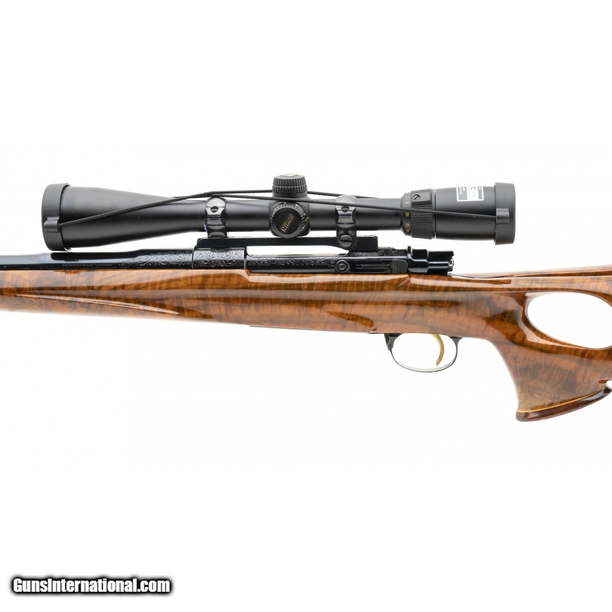Description: " SN: 6X36176. Belgian made Medallion grade rifle customized by Harry Lawson. Has the classic Lawson thumbhole stock made of deluxe figured walnut and muzzle brake, with the factory engraving on the receiver and floor plate. A Nikon 4.5-14 scope is mounted. An outstanding custom rifle, in excellent condition. SOLD |
