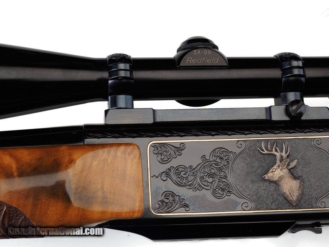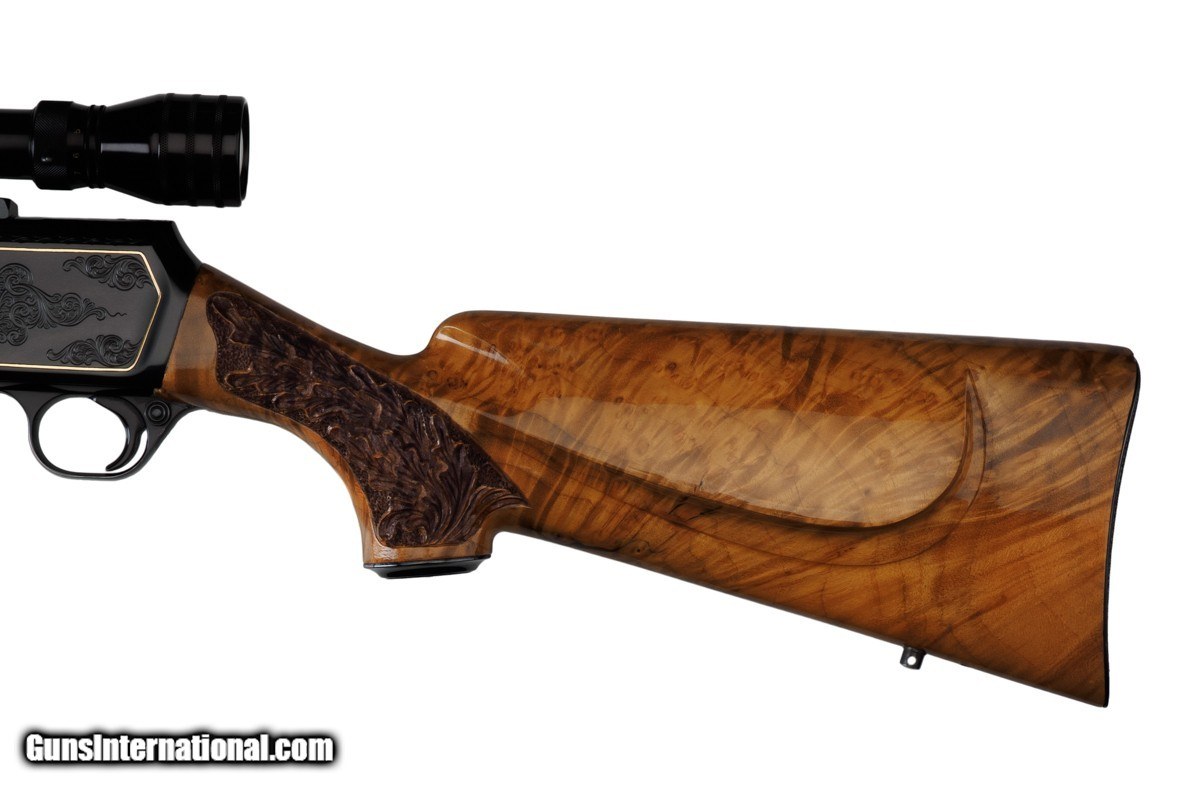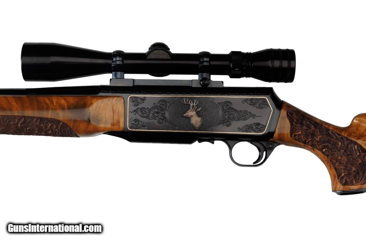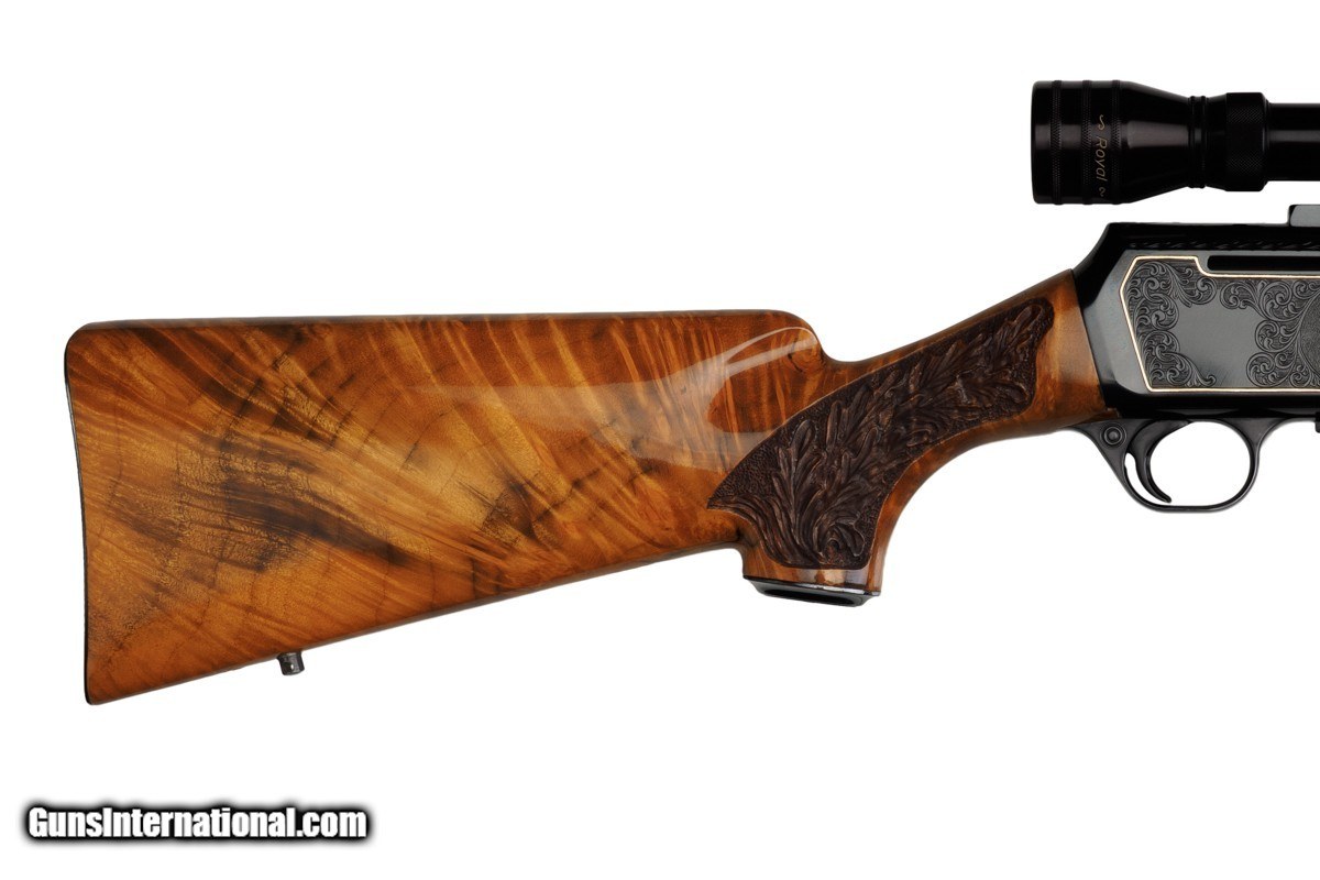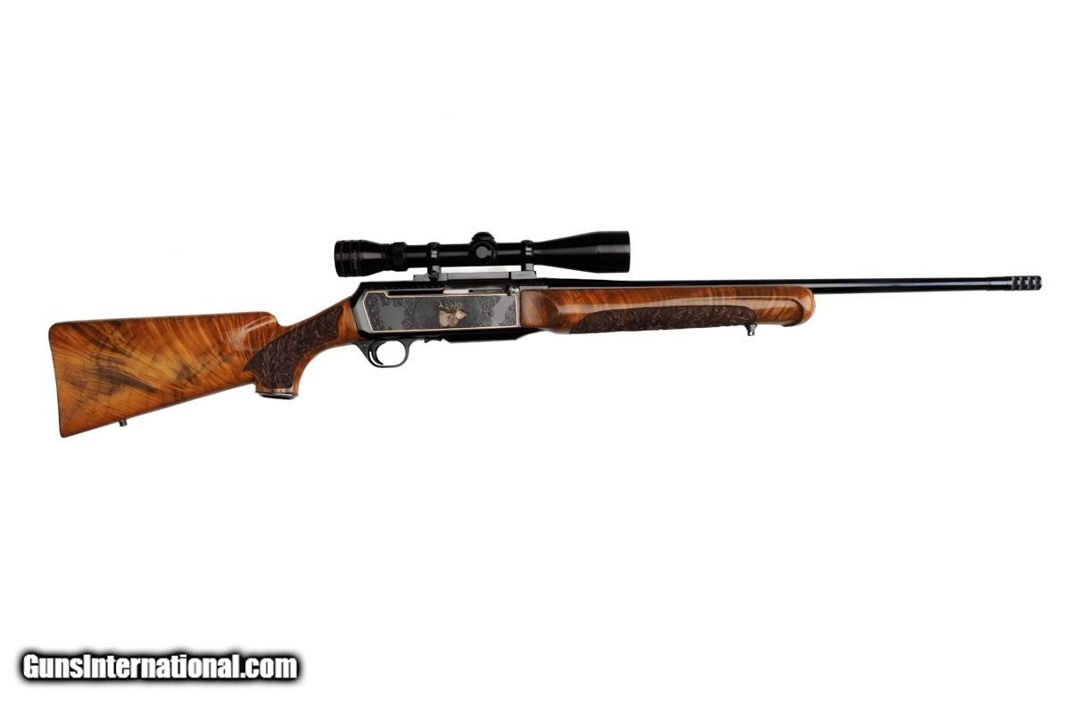 Description: 22-1/4" BARREL WITH MUZZLE BREAK, REDFIELD ROYAL 3-9X40MM SCOPE, LEUPOLD MOUNTS, PISTOL HAND GRIP, ENGRAVED RECEIVER, 14" LOP, BUTTPLATE, 8 LBS 14 OZ WITH SCOPE/MOUNTS Custom Belgium made semi-automatic rifle. It has a 22-1/4" barrel with muzzle break. The engraved and inlaid blued steel receiver is fit with a Redfield Royal 3-9x40mm rifle scope and Leupold mounts. The receiver is adorned with scrolls with an inlaid deer portrait on left and elk portrait on right of the receiver. "SEC" is engraved on the magazine cover. The action is fitted with a single trigger, cross bolt safety and a detachable magazine. Feather crotch rich honey colored custom Harry Lawson walnut stock with pistol hand grip, grip cap, beaded cheekpiece, oak leaf checkering, studs for sling on both the toe line of buttstock and forearm and 14" LOP to a checkered steel buttplate. Schnabel forearm similarly checkered. 8 Lbs.14 Oz. with scope/mounts.