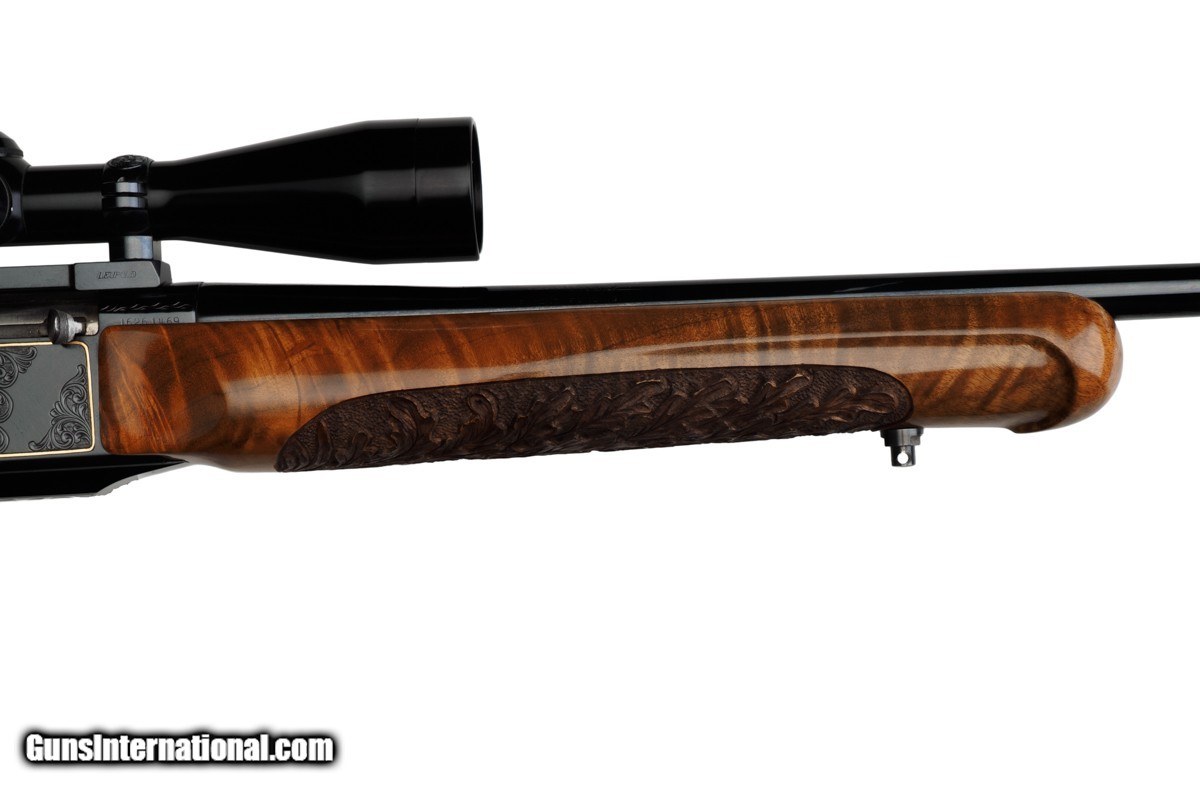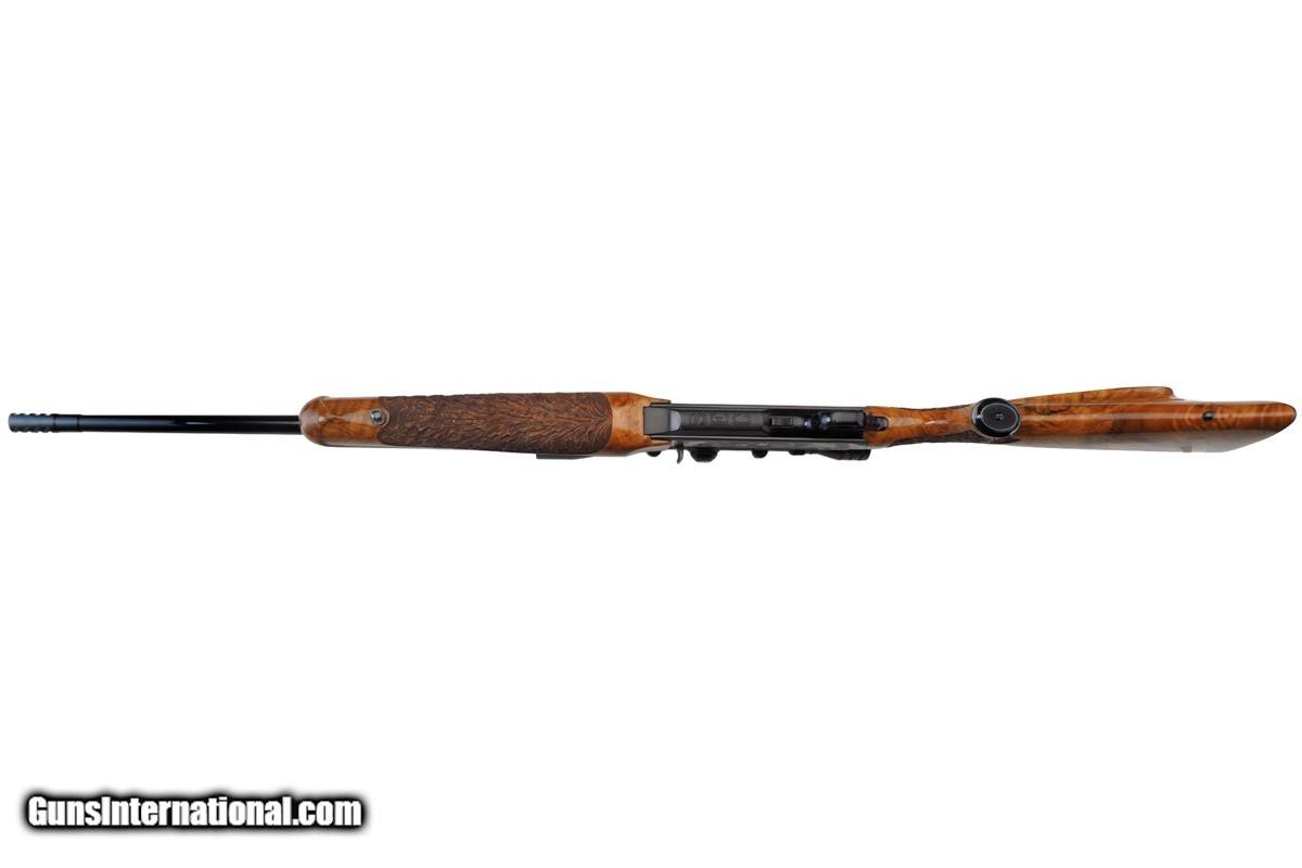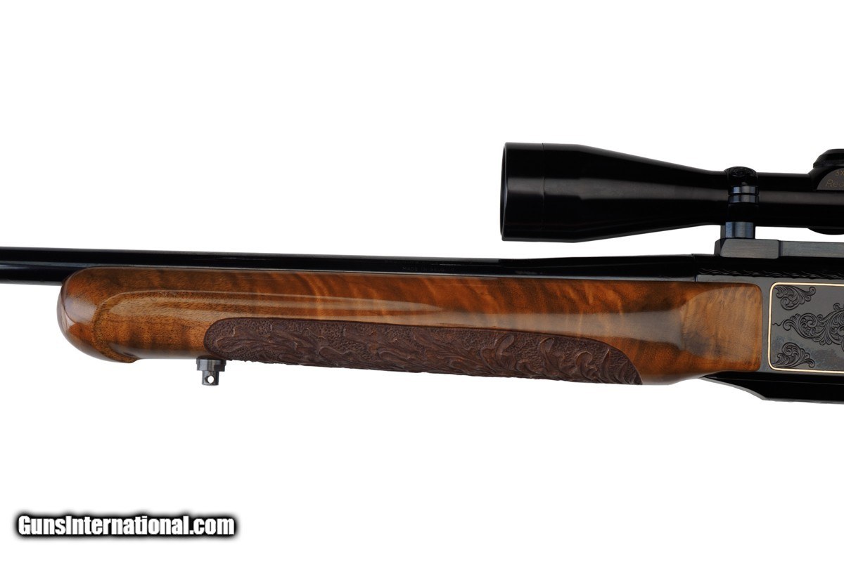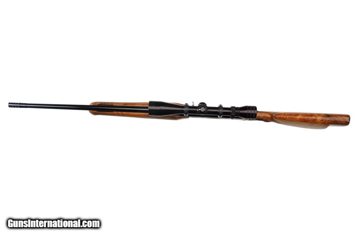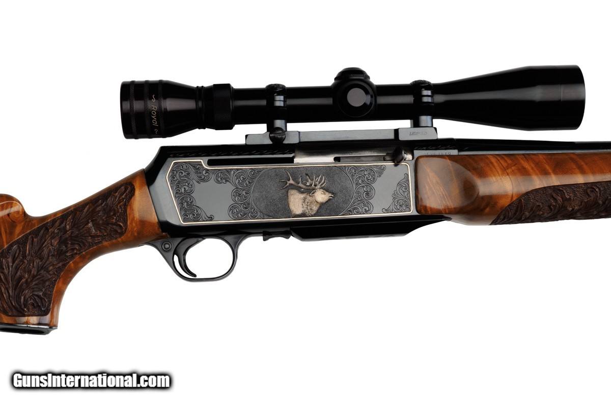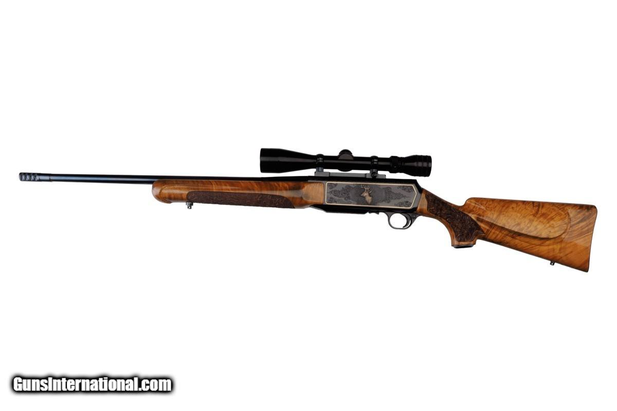 Description: 22-1/4" BARREL WITH MUZZLE BREAK, REDFIELD ROYAL 3-9X40MM SCOPE, LEUPOLD MOUNTS, PISTOL HAND GRIP, ENGRAVED RECEIVER, 14" LOP, BUTTPLATE, 8 LBS 14 OZ WITH SCOPE/MOUNTS Custom Belgium made semi-automatic rifle. It has a 22-1/4" barrel with muzzle break. The engraved and inlaid blued steel receiver is fit with a Redfield Royal 3-9x40mm rifle scope and Leupold mounts. The receiver is adorned with scrolls with an inlaid deer portrait on left and elk portrait on right of the receiver. "SEC" is engraved on the magazine cover. The action is fitted with a single trigger, cross bolt safety and a detachable magazine. Feather crotch rich honey colored custom Harry Lawson walnut stock with pistol hand grip, grip cap, beaded cheekpiece, oak leaf checkering, studs for sling on both the toe line of buttstock and forearm and 14" LOP to a checkered steel buttplate. Schnabel forearm similarly checkered. 8 Lbs.14 Oz. with scope/mounts.