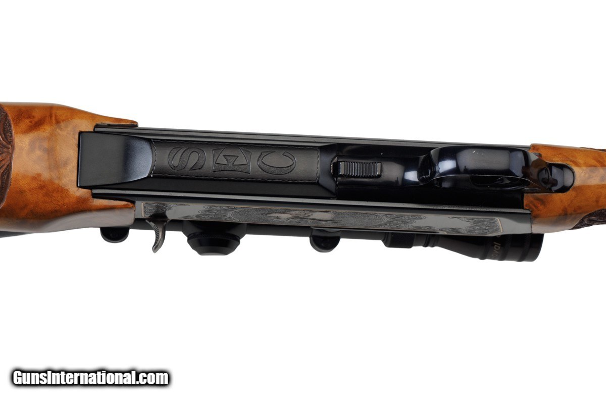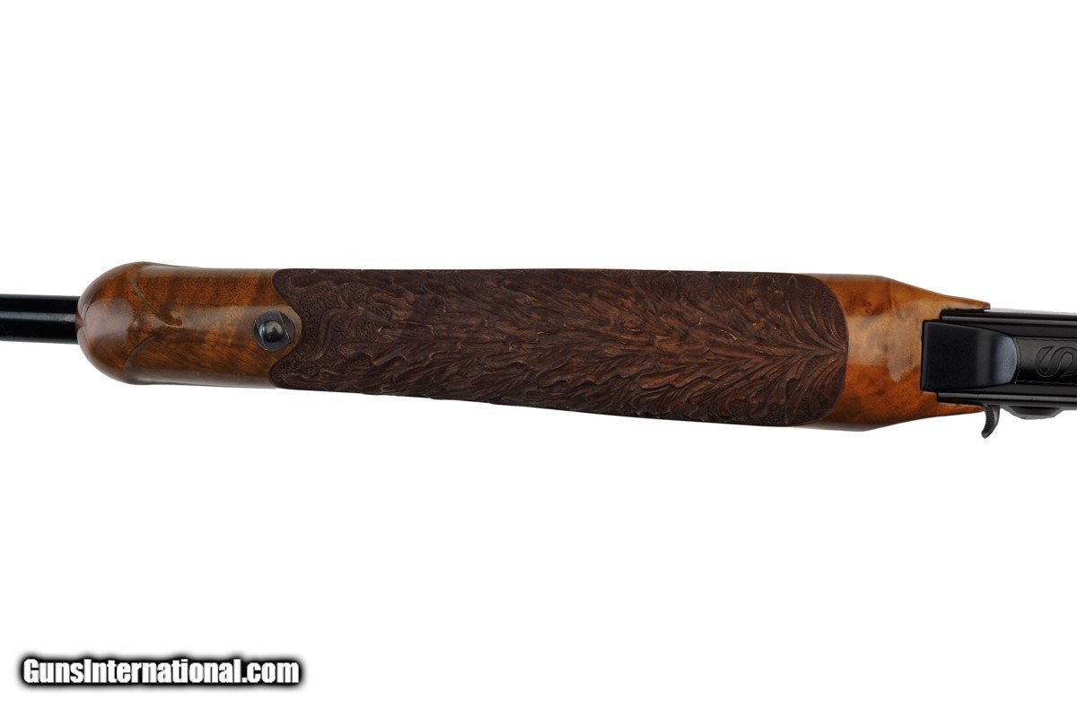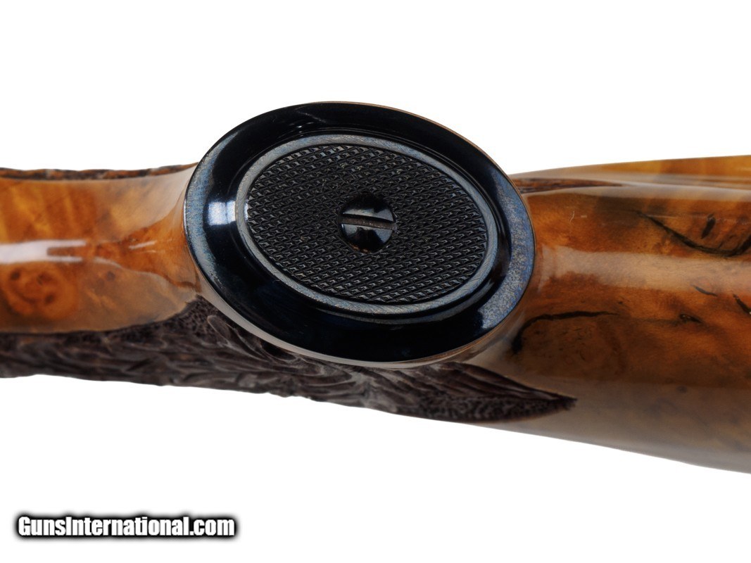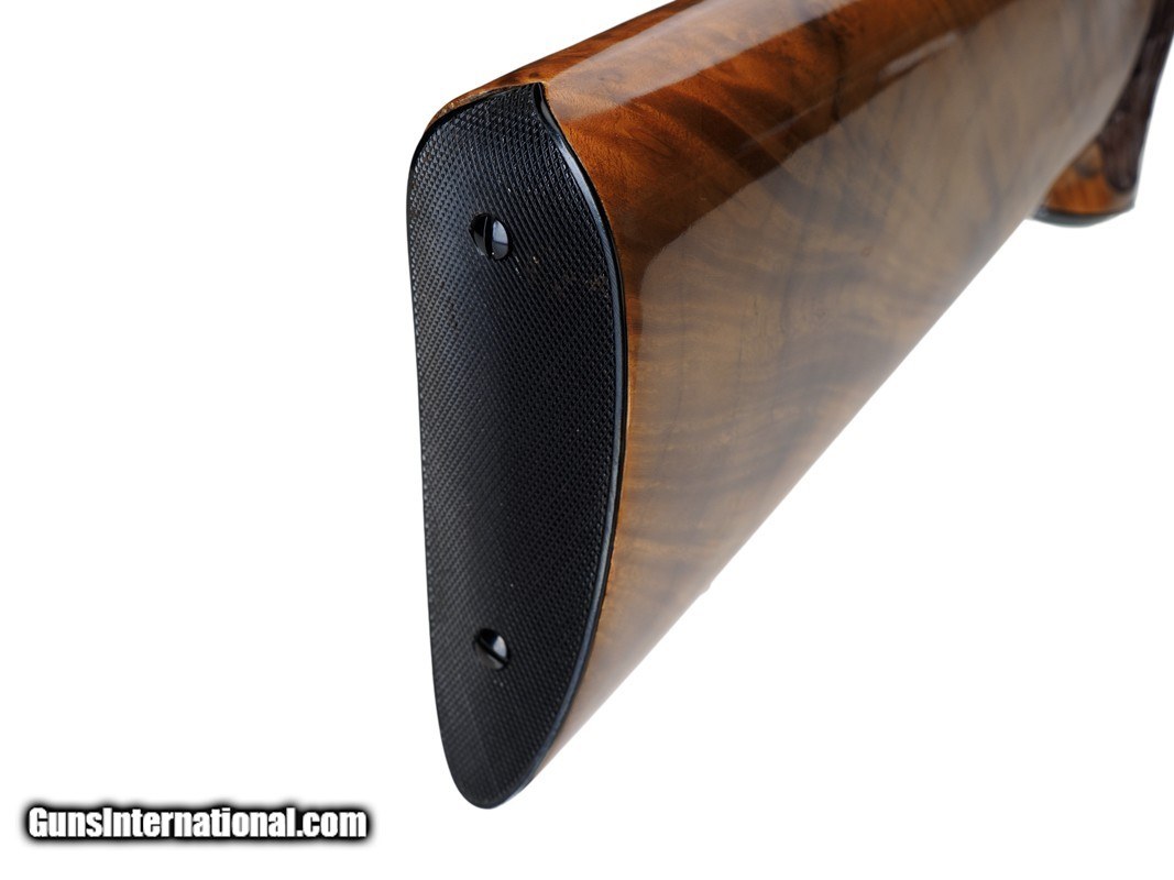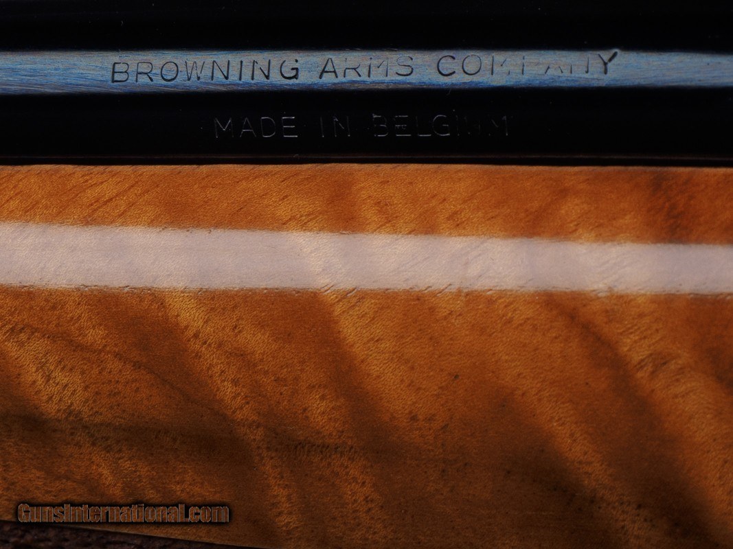 Description: 22-1/4" BARREL WITH MUZZLE BREAK, REDFIELD ROYAL 3-9X40MM SCOPE, LEUPOLD MOUNTS, PISTOL HAND GRIP, ENGRAVED RECEIVER, 14" LOP, BUTTPLATE, 8 LBS 14 OZ WITH SCOPE/MOUNTS Custom Belgium made semi-automatic rifle. It has a 22-1/4" barrel with muzzle break. The engraved and inlaid blued steel receiver is fit with a Redfield Royal 3-9x40mm rifle scope and Leupold mounts. The receiver is adorned with scrolls with an inlaid deer portrait on left and elk portrait on right of the receiver. "SEC" is engraved on the magazine cover. The action is fitted with a single trigger, cross bolt safety and a detachable magazine. Feather crotch rich honey colored custom Harry Lawson walnut stock with pistol hand grip, grip cap, beaded cheekpiece, oak leaf checkering, studs for sling on both the toe line of buttstock and forearm and 14" LOP to a checkered steel buttplate. Schnabel forearm similarly checkered. 8 Lbs.14 Oz. with scope/mounts.