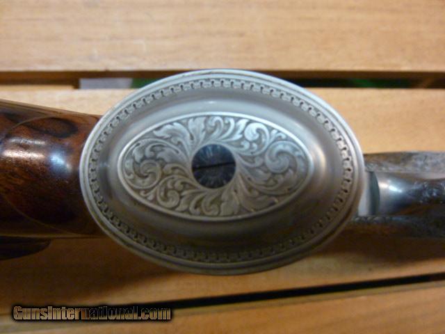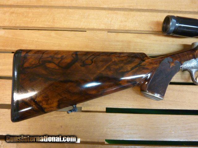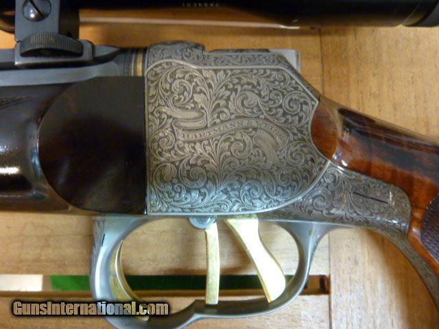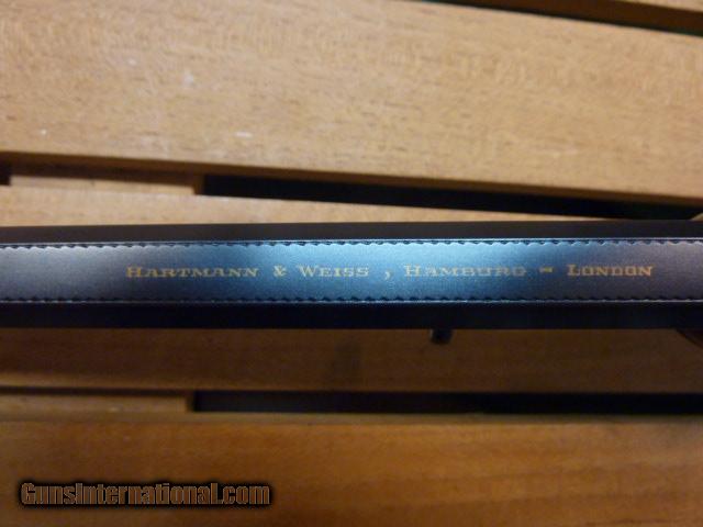 Description: A very fine and all original, Hartmann & Weiss falling-block action rifle (Heeren System), in the fine caliber .240 Weatherby Magnum. The gun has been engraved by Master engraver Heinz Funk. Total length 39.4 inches (100 cm), barrel length 23.6 inches (58 cm), excellent bore. Integral scope mount, one sight. Original claw mount Zeiss Diatal 6x42 recticle 1 scope included. Highly figured walnut stock 14.2 inch (36 cm) LOP to a leather cover pad. A very lovely, rifle! Additional and high-res photos available upon request. Rifle can be viewed in Germany. Will ship to the US. Prices for international shipments upon request. SOLD |