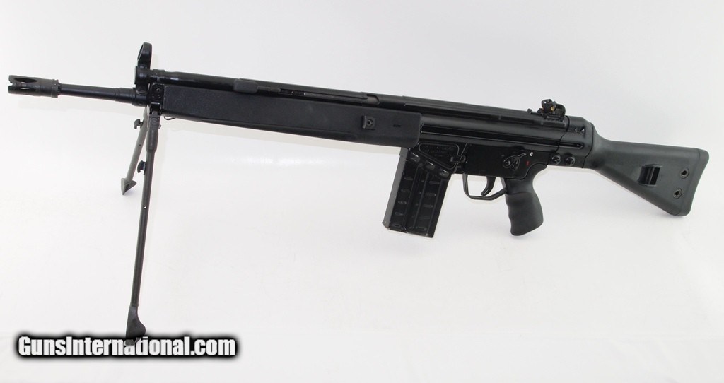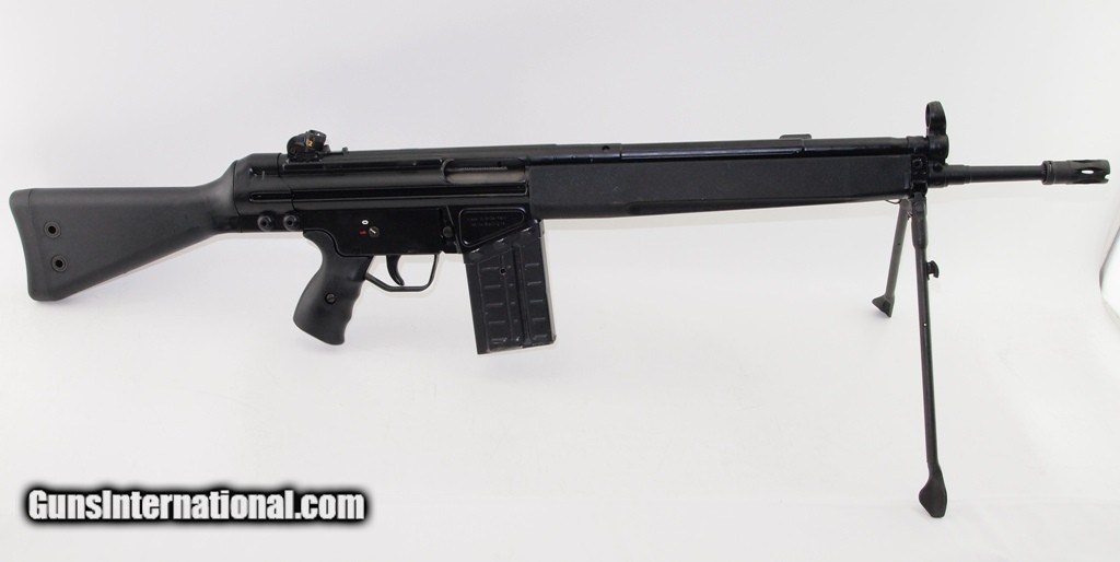 Description: H&K 91A2 .308 WBox, 20" bbl, black matte finish, black synthetic stock and forearm, attached bipod, flash hider, with one 20rd magazine (not original), Diopter rear sight and ring with post front sight. Includes olive drabsling, original box, no documentation. Looks unfired. VERY CLEAN RIFLE. Add 3% for Credit Card Shipping $40.00 SOLD |