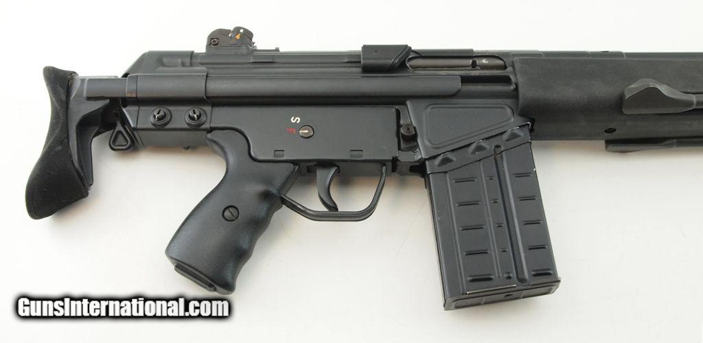 Description: H&K 91A3 .308 Win, 17.7" bbl, bright shiny bore, good rifling, multiple aperture rear sight, post front sight, black finish, light bi-pod, flash hider and collapsible stock. This rifle comes with three 20 round magazines, magazine pouch, sling, and manual. See pictures. Add 3% for Credit Card Shipping $30.00 SOLD |