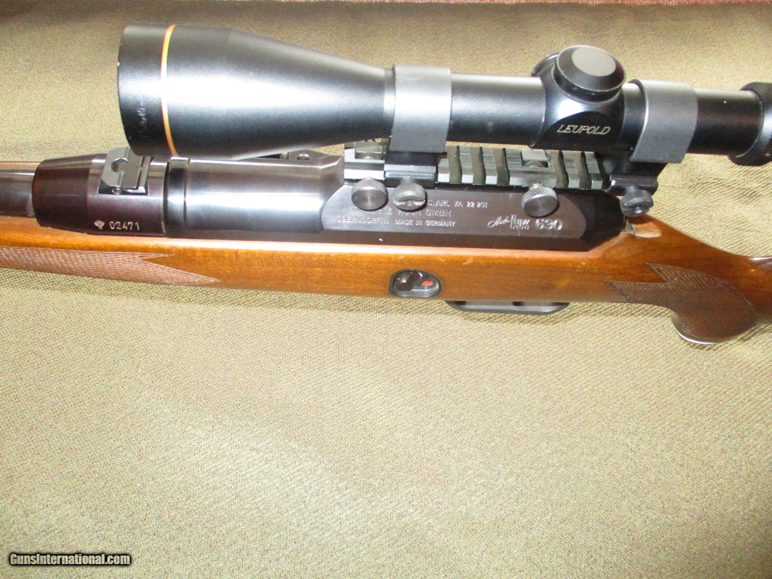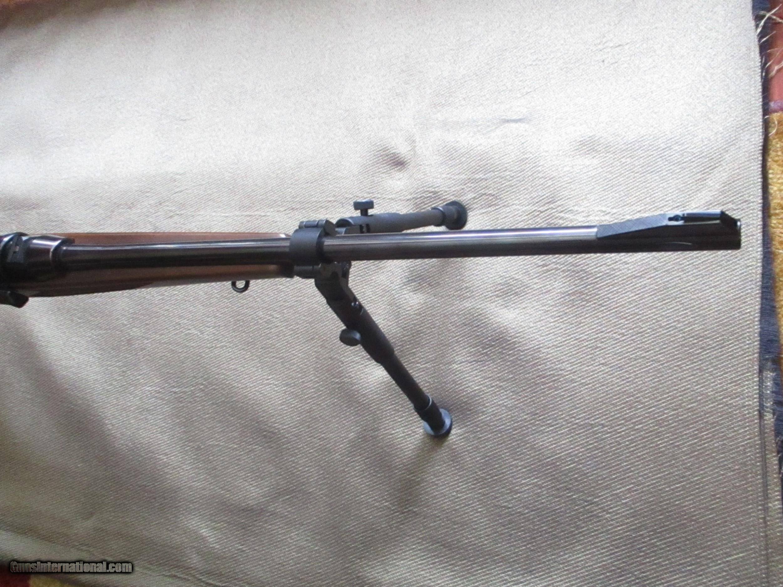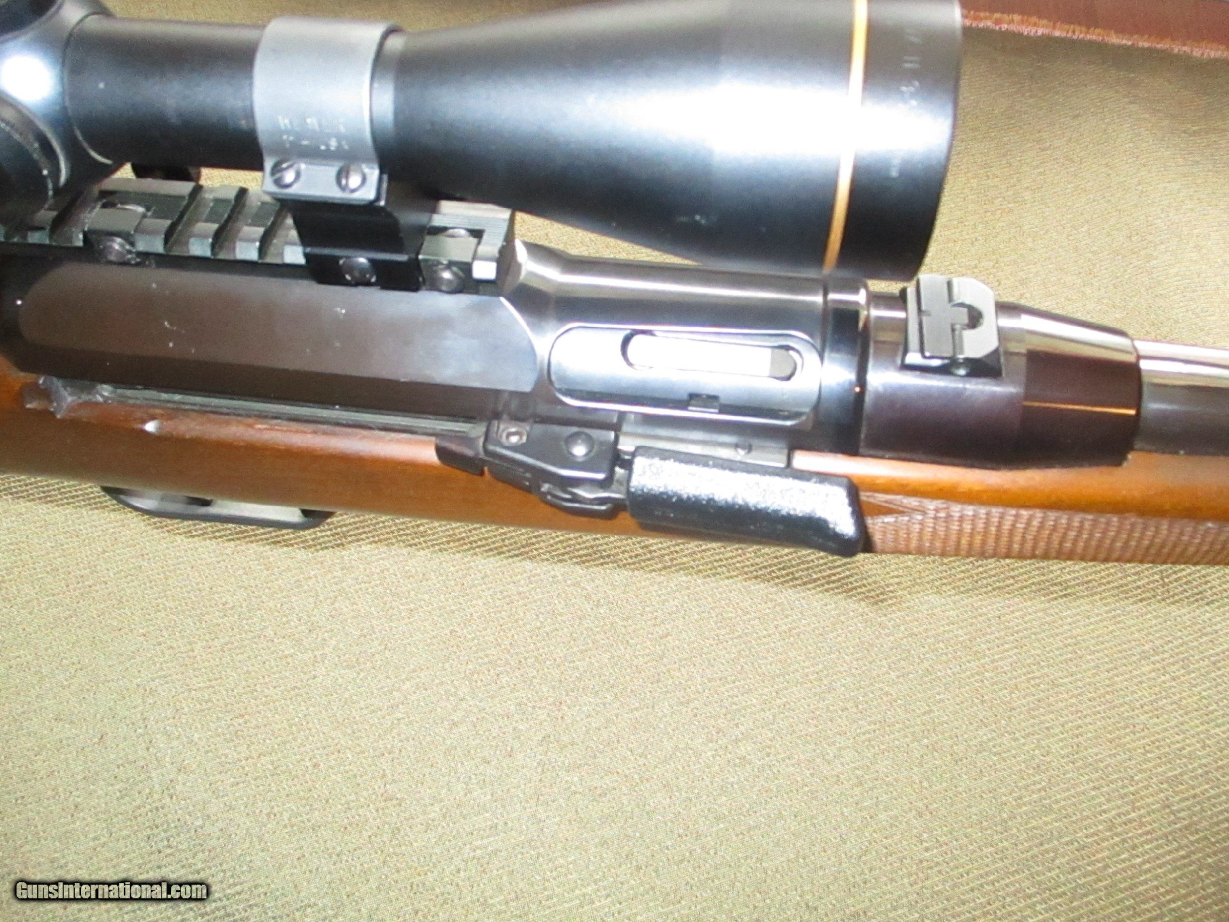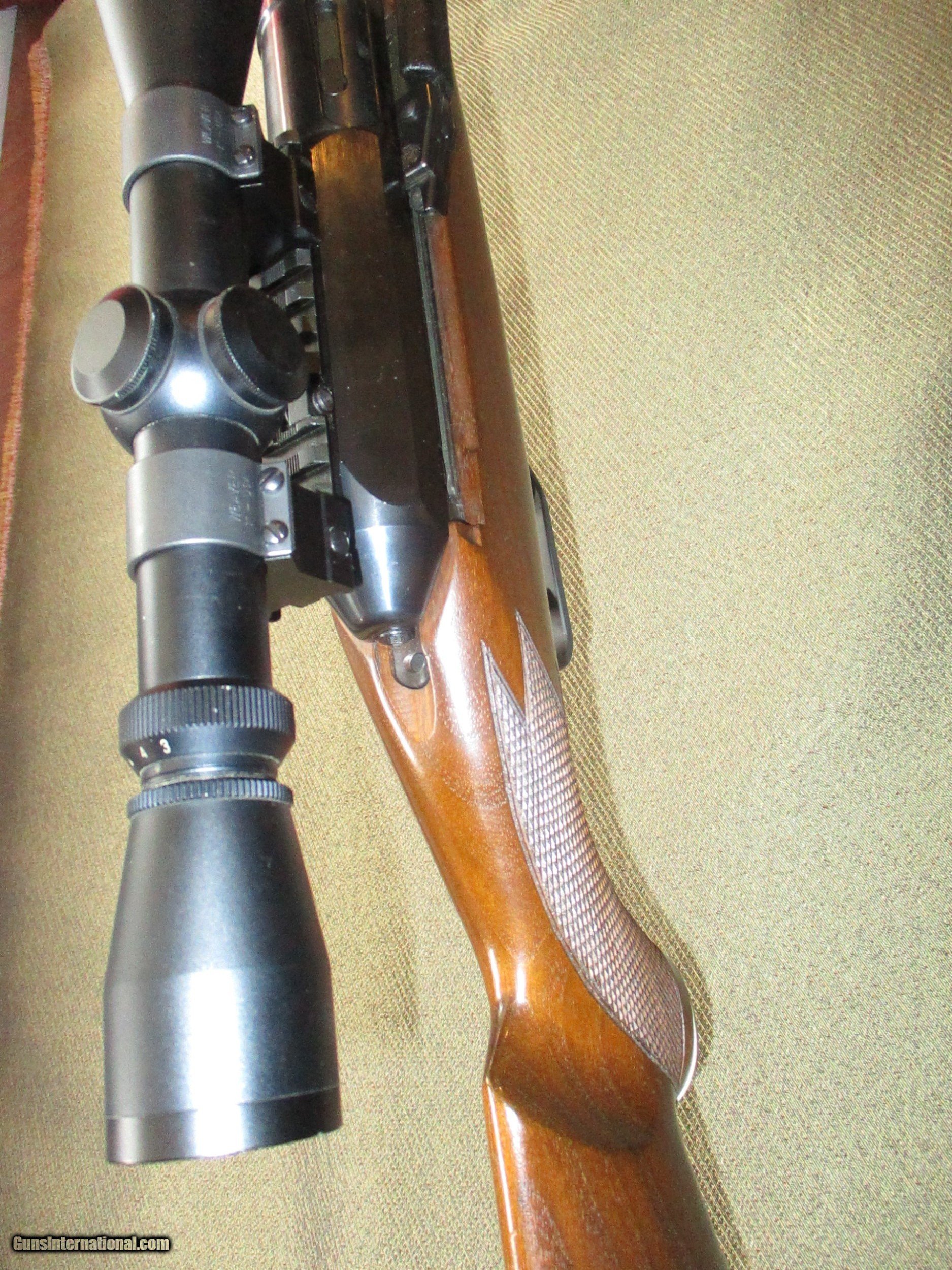 Description: 17.7" bbl. with or W/ muzzlebrake , raised front blade, open rear, quick detatch Optics mounts with Leupold Vari-X 11 3x X 9x X40mm WA, blowback action , 4rd. factory mag., select European checkered walnut with EURO style cheekpiece, bbl. mount bi-pod, 99% as new, no visable blemishes, SOLD |