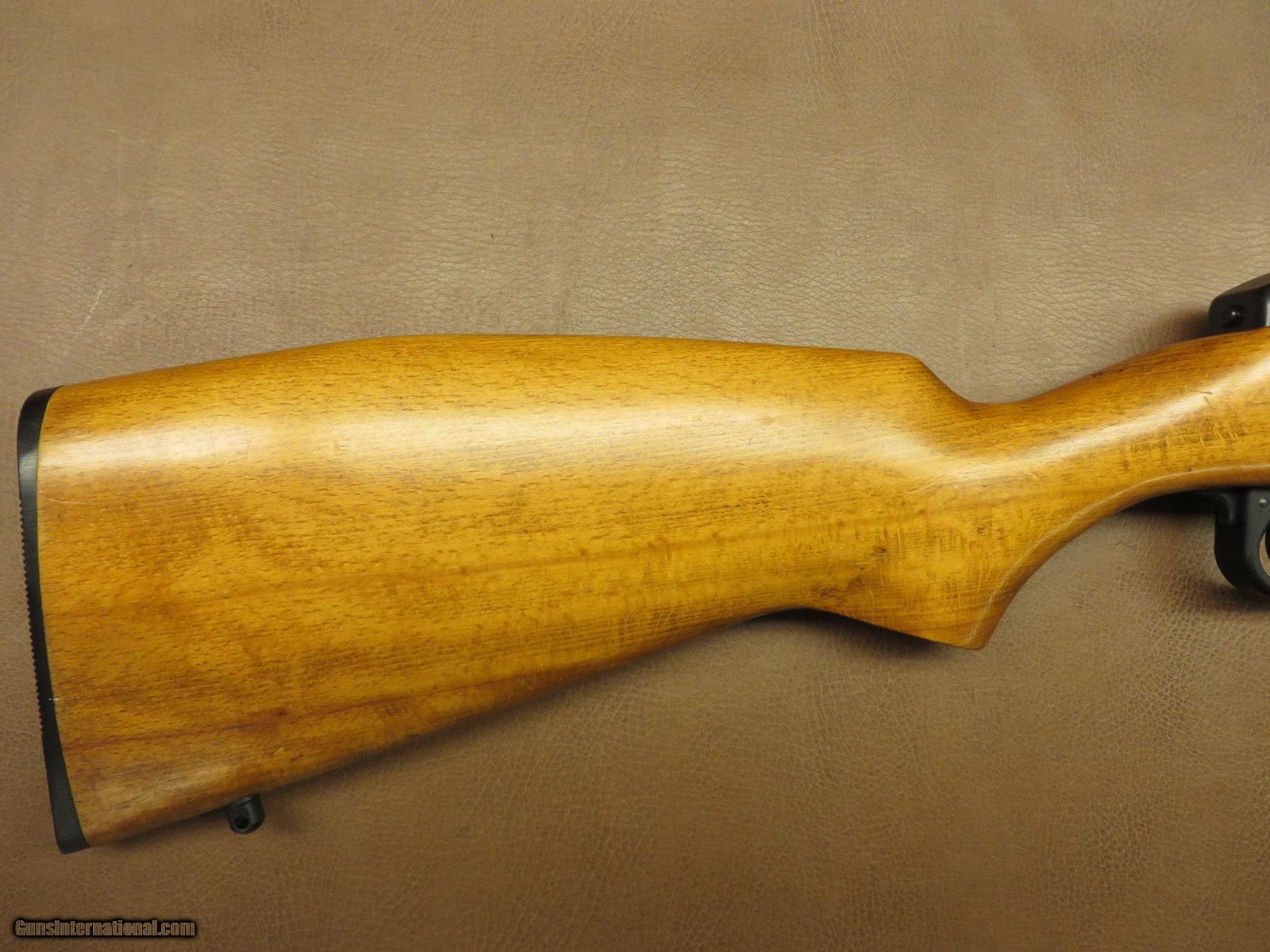 Description: .22 Long Rifle has 19 3/4 inch barrel with original front sight and a Lyman folding rear sight. Serial number 09xx. Grooved receiver for scope mounting. Non checkered wood stock with sling swivel studs and the original butt plate. Blue is 90%+ and the wood is 95%. SOLD |