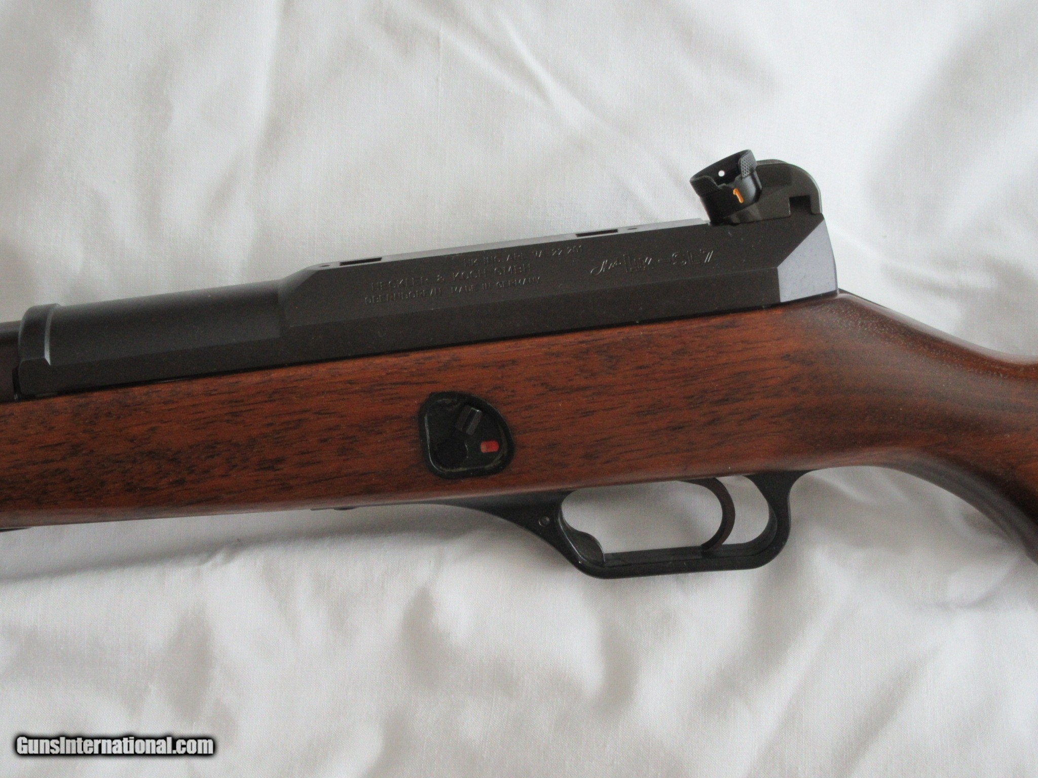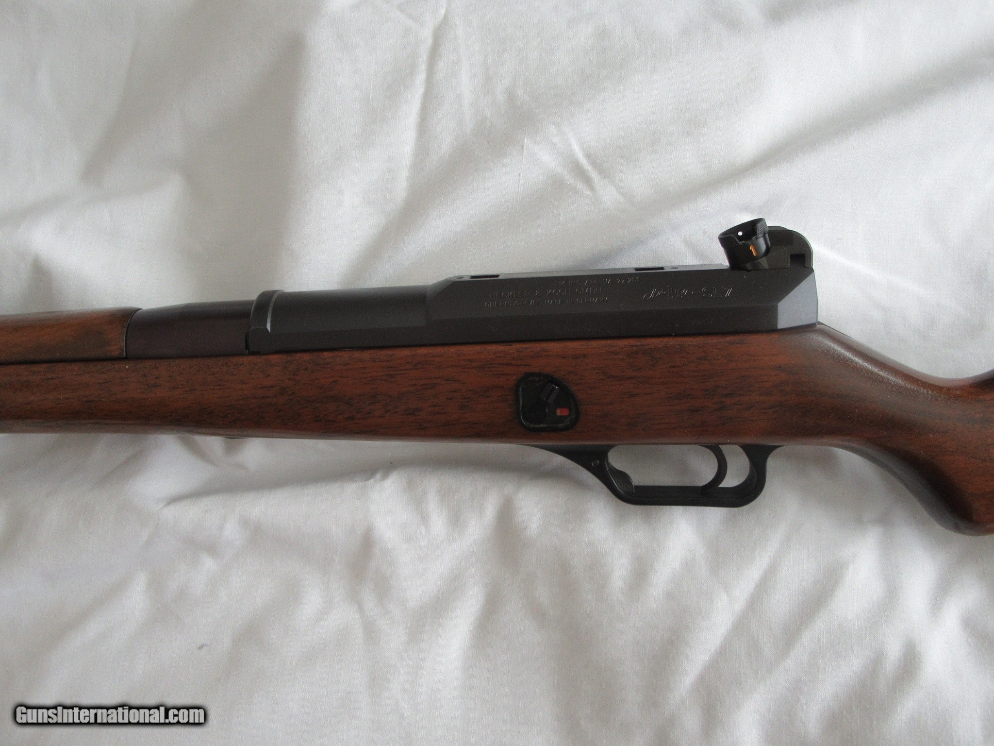 Description: H&K SL7 .308 semi-automatic rifle. Condition: 99% stock and blueing, H&K Q5 scope mount, military leather sling, w/ 3 & 10 round clip. Sale Price $2350.00 +S&H (Original Price $2500.00 +S&H) 17.7" barrel. Two piece smooth walnut stock w ventilated handguard and sling attachment on left, semi-pistol grip stock w straight comb that drops at heel, smooth steel buttplate and military sling bar inlay to left of buttstock. Bore - excellent bright w polygonal rifling. Diaopter sights. Extra 10 round clips $100.00 each with gun purchase. SOLD |