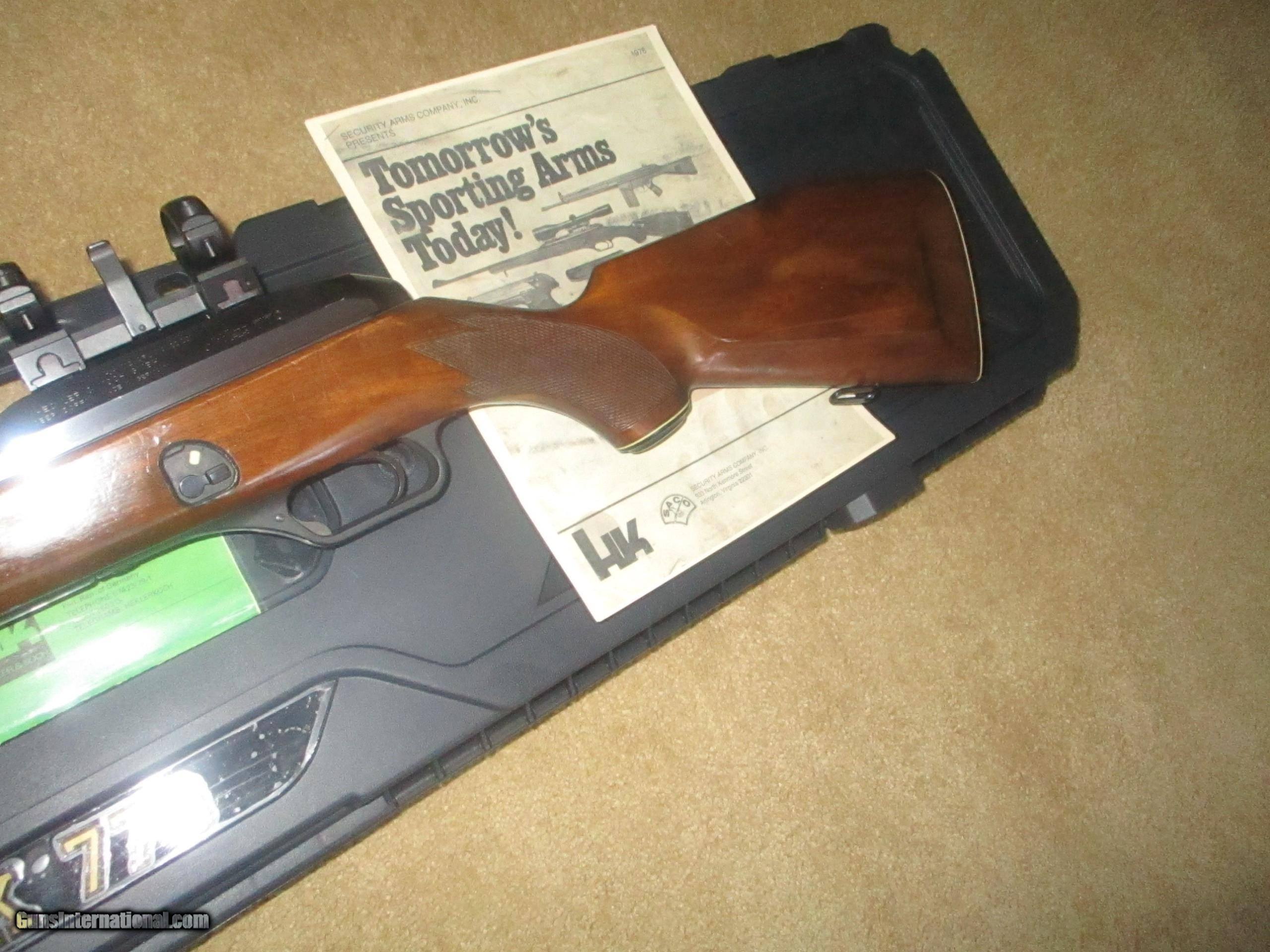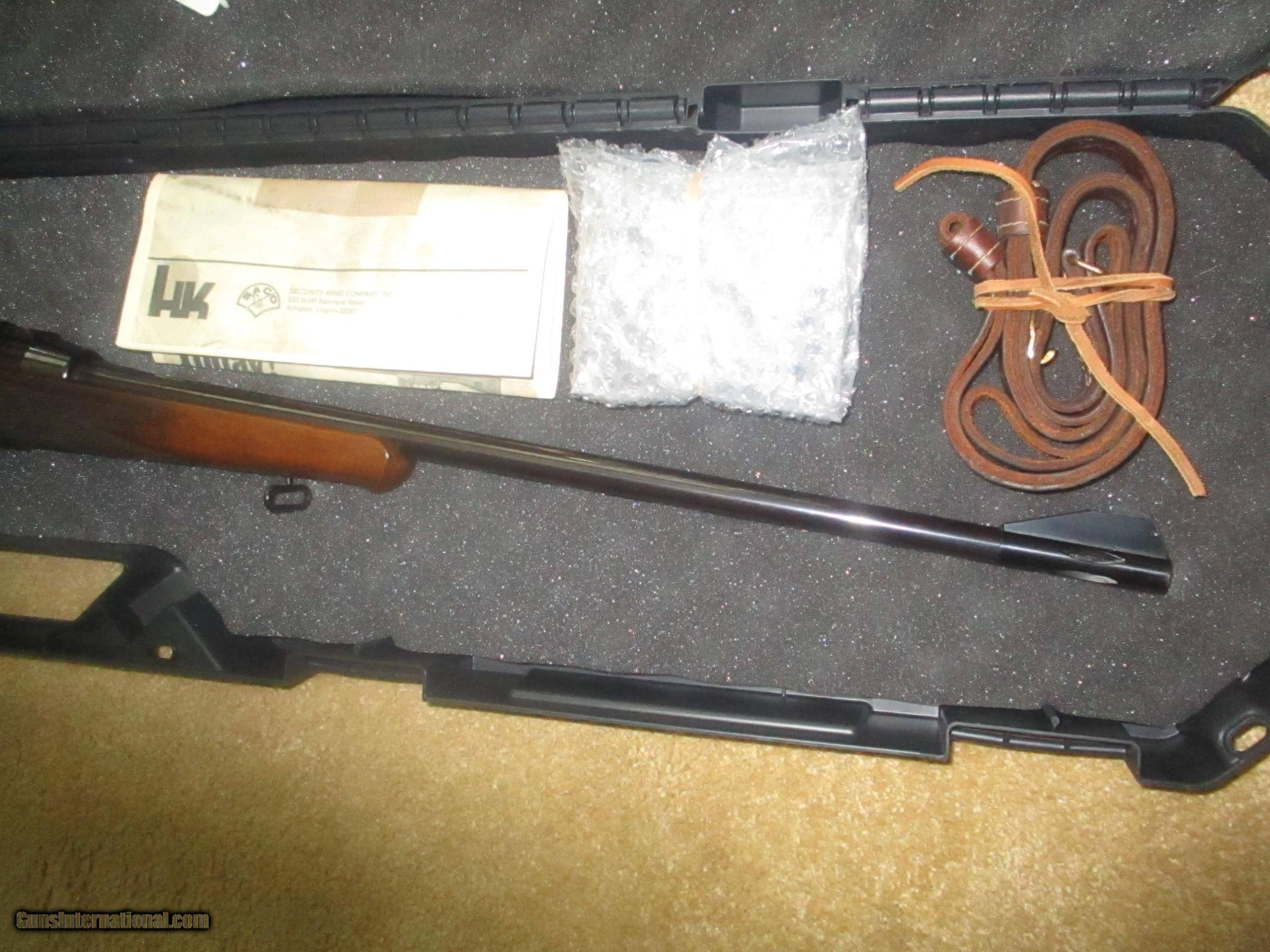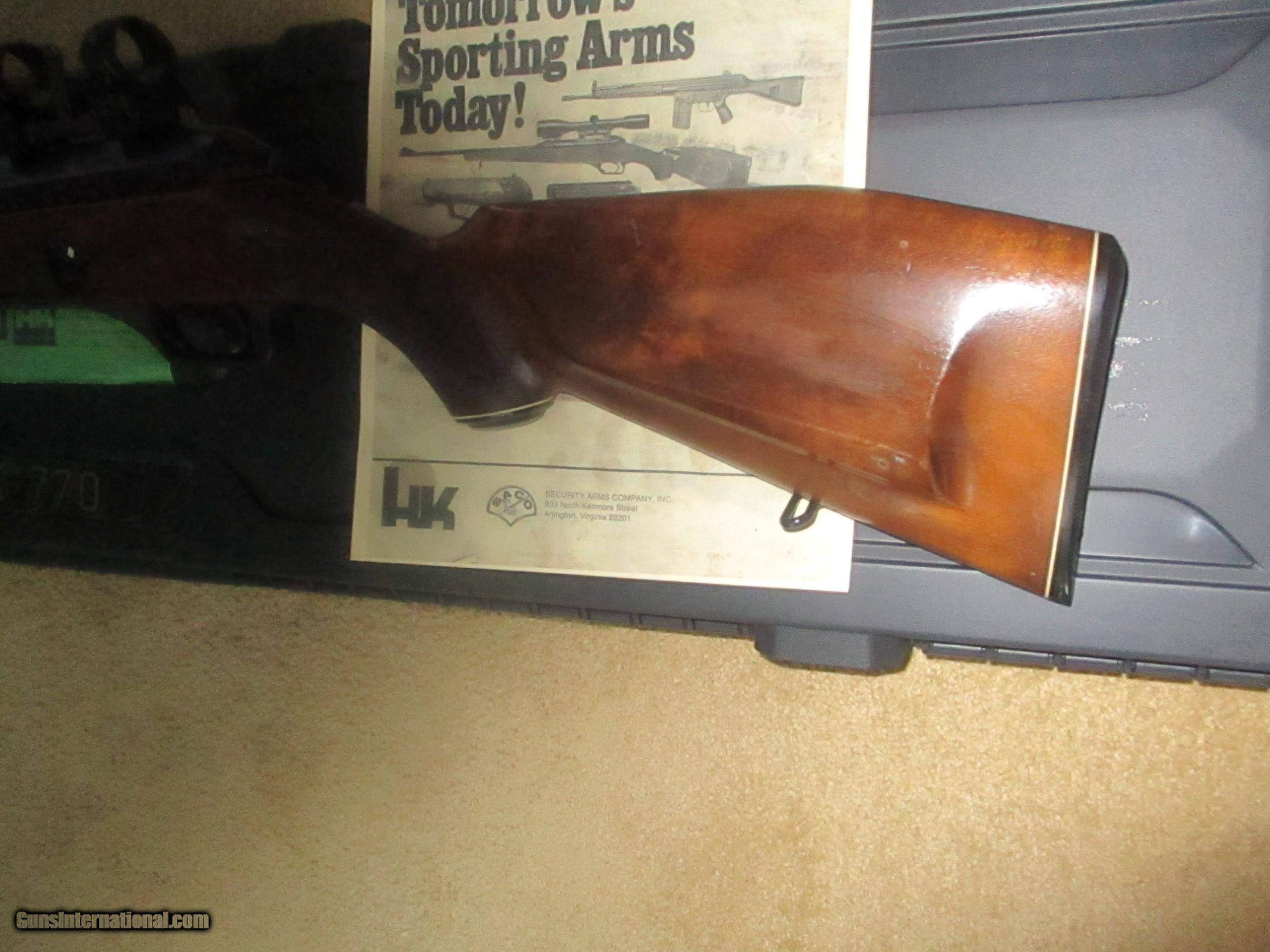Description: 21.7" bbl. + flashider/muzzlebrake, solid ramp with tall bead, open rear, Q5 quick detatch factory 1" mts., 4rd. also included the elusive 10 factory mag, ( 2 mags), 770 extra desiginates select wallnut with satin gloss finish, Monte Carlo stock, schnoble forend, factory sling swivels, leather sling matching stock, European cheekpiece, checkered factory buttplate, 99% blue, minor handling, shot very little, approved by US Border Patrol, 2nd to no semi-auto rifle ever mfg., also great security piece with the 10 rd. mag., hard case, much pertinate provanance, HK Sporting Arms manual with schmetics: SOLD |